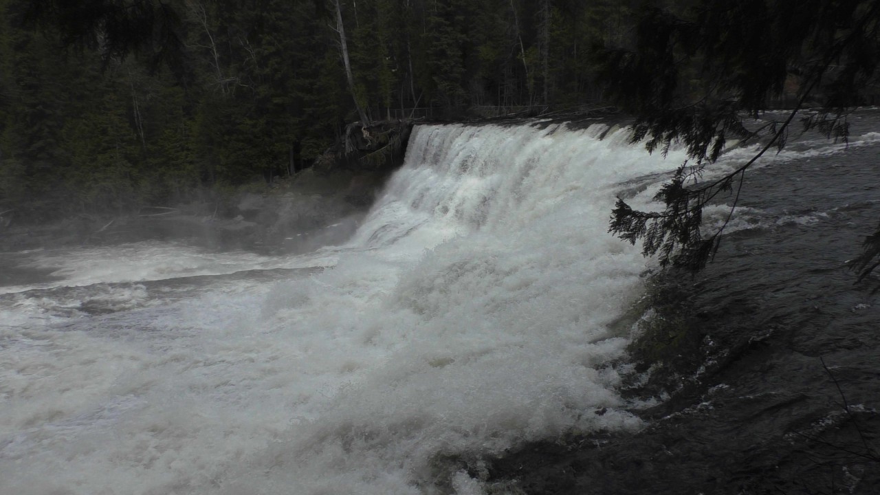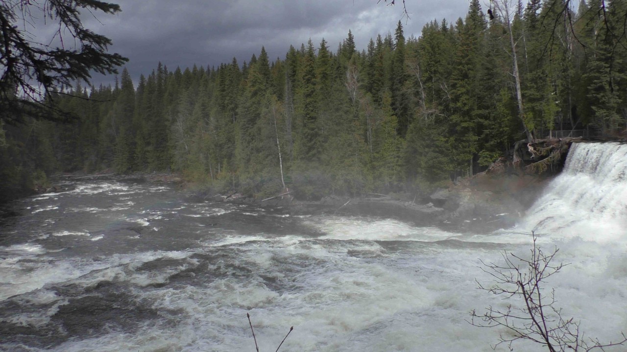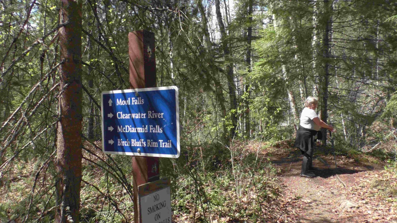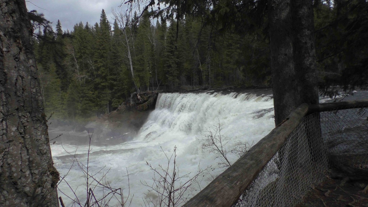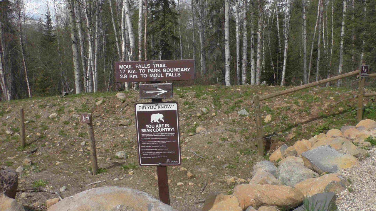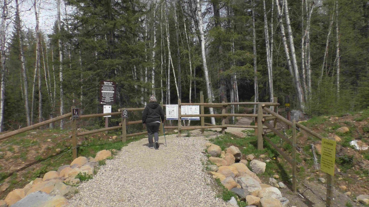 We rijden naar de ingang van Grey Wells Provicial Park, we hebben helaas geen goede kaart waarop precies de trails en de watervallen zijn, maar ik weet er nog een paar van 5 jaar geleden en ook hebben we nog een foto gemaakt van het infobord aan het begin van het park. Internet hebben we in het park niet (we hebben niet eens gsm ontvangst).