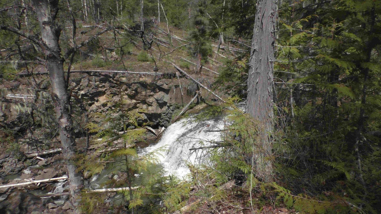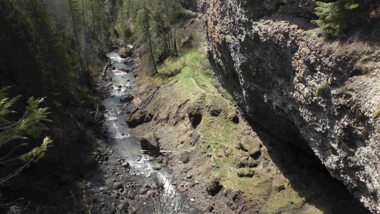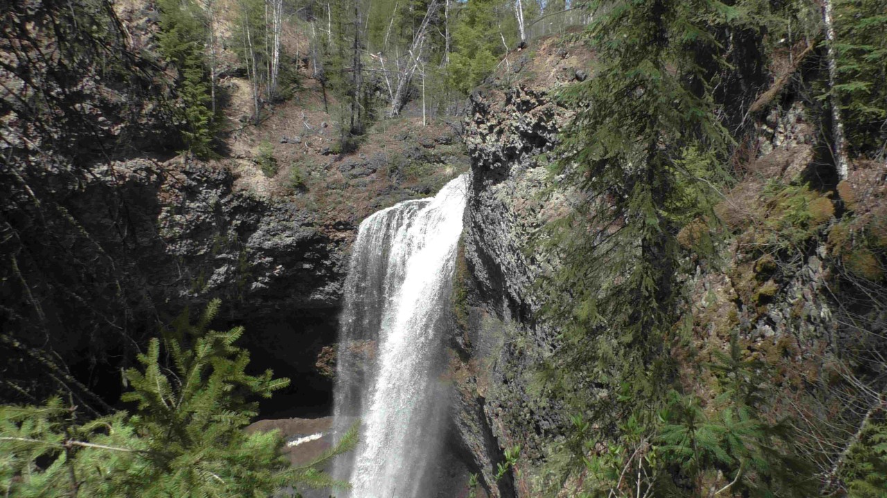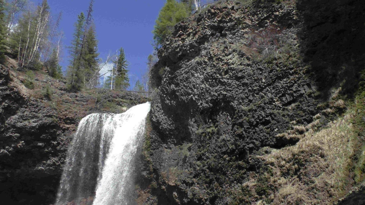 Nu zal iedereen denken die wel eens in Grey Wells is geweest dat de volgende de Spahats Falls zijn, mis, die slaan we over en we nemen de Moul Falls, deze waterval is alleen maar bereikbaar via een een hike van +/- 3 km (enkele reis). De laatste meters van de trail zijn wel steil, maar je kan achter de waterval doorlopen. Aangezien de knieën van moeders goed aanvoelen gaan we de uitdaging aan en we moeten zeggen het wat een geweldige trail en de beloning, de waterval. Erg mooi. Nu weer 2.9 km terug………;-)