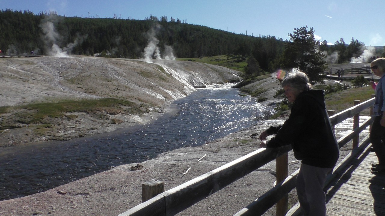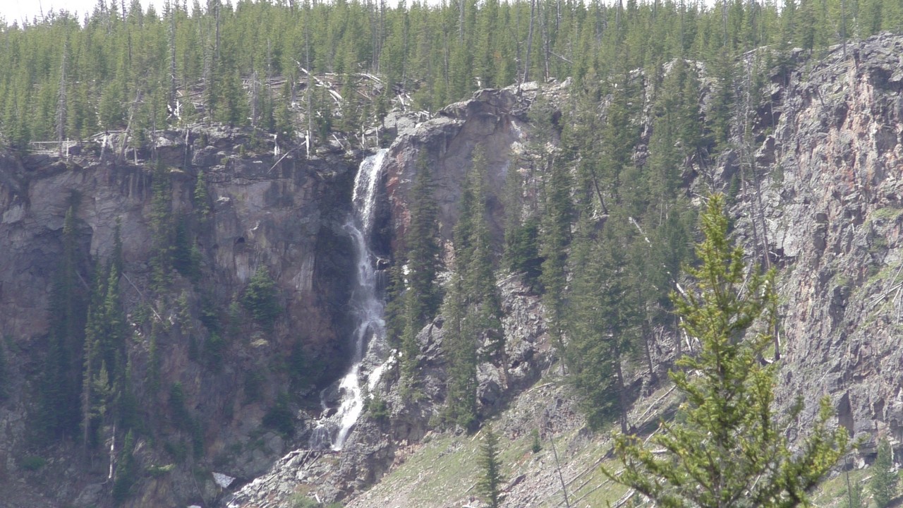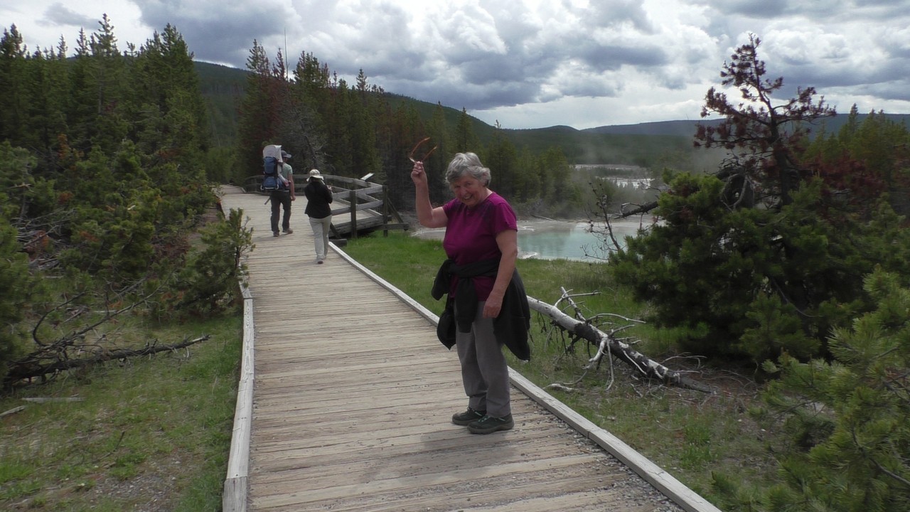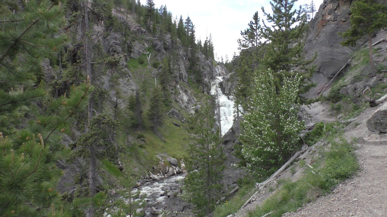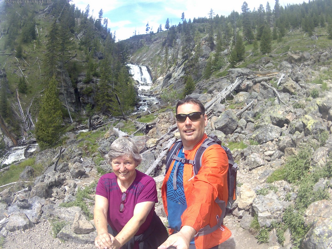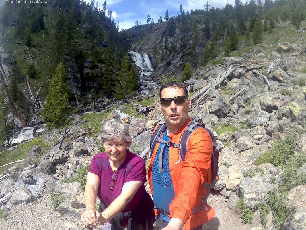 Na de koffie door naar een andere Geiser gebied. Die van de Biscuit Basin. Ook hier de boardwalk trial gedaan, maar halverwege was er en mooie hike route naar de Mystic Falls. Volgens de wandelkaart een 2,4 miles (4 km) (heen en terug), maar zou moderately strenous zijn (redelijk zwaar), maar Moeders voelde zich goed dus wij de stoute “wandel”schoenen aan en de trial op. Nou dit trial viel reuze mee, afgelopen weken hebben we zwaardere hikes gedaan. En zoals gewoonlijk was de trip weer de moeite waard. Een zeer mooi wandelpad met aan het eind een geweldige waterval. Het blijft toch mooi. Onderweg alleen maar wat eekhoorntjes gezien. Helaas nog steeds geen beer…………. Daar we de afgelopen dagen toch wel een aantal routes hebben gelopen waar je zomaar een beer zou kunnen tegenkomen en omdat we de komende dagen ook nog in Bearcountry verblijven hebben we, ook op advies van de Rangers” een beerspray aangeschaft. Dit is een soort peperspray wat je kan gebruiken als er een beer naar je toe zou komen. Uiteraard is het wel belangrijk om eerst de andere maatregelen te hebben gedaan en als laatste alternatief zou je de spray in kunnen zetten. Hopelijk hoeven we hem niet te gebruiken deze vakantie………