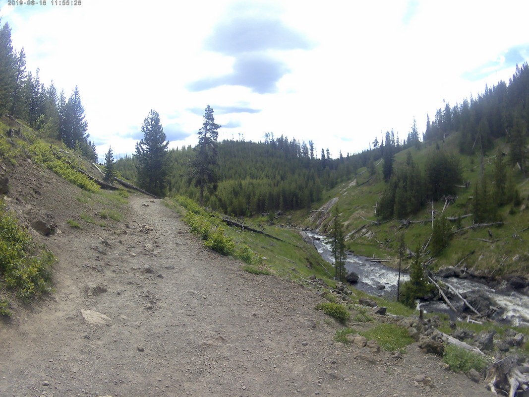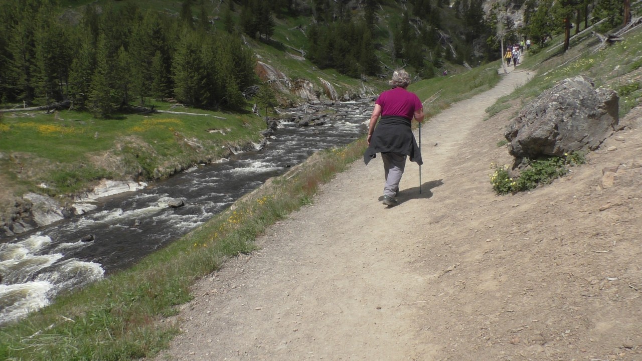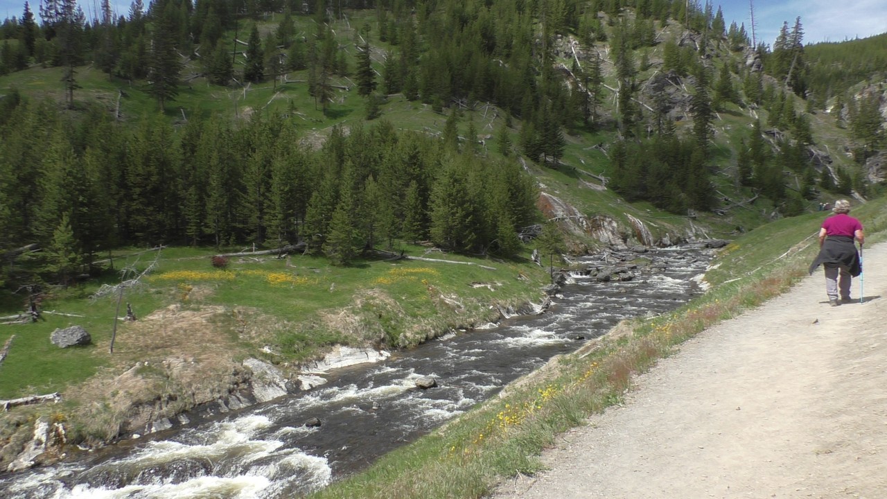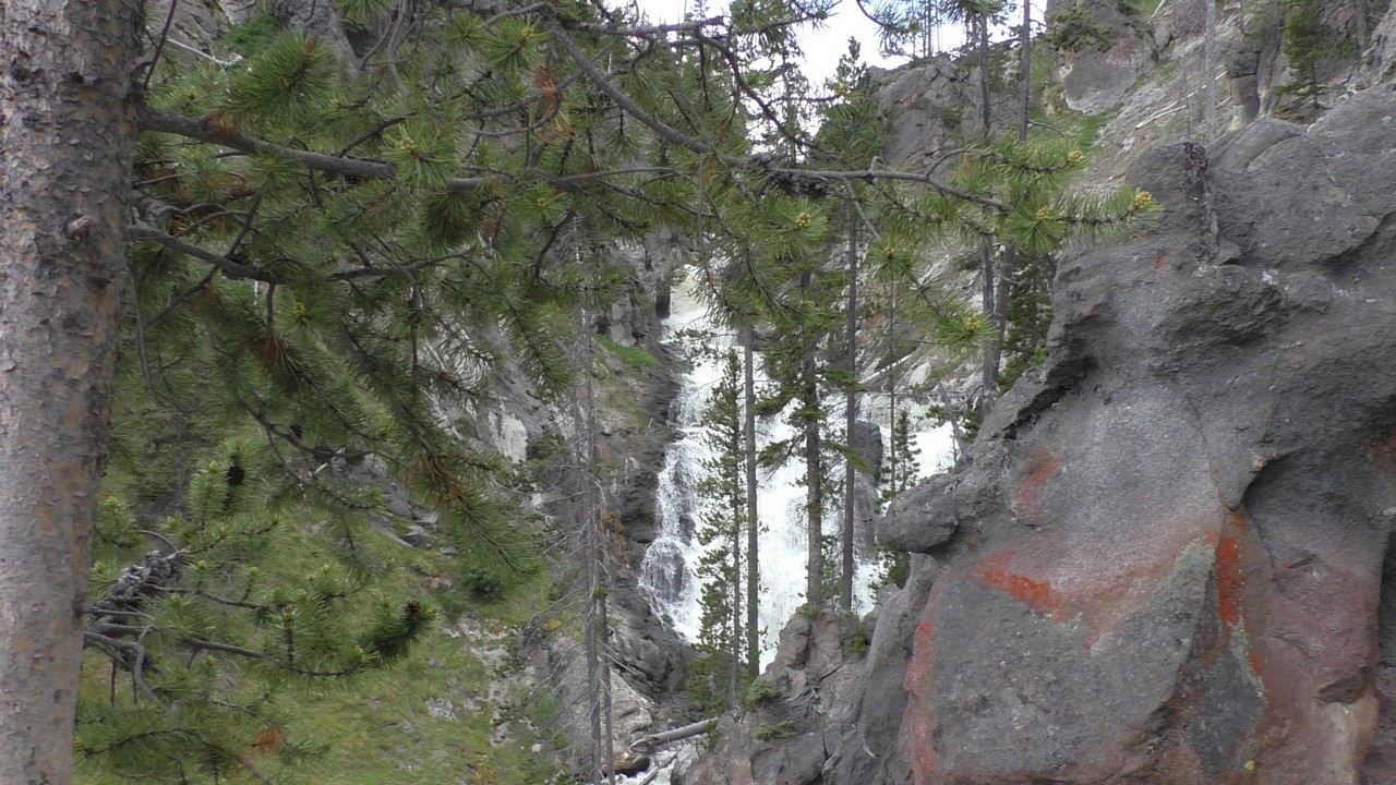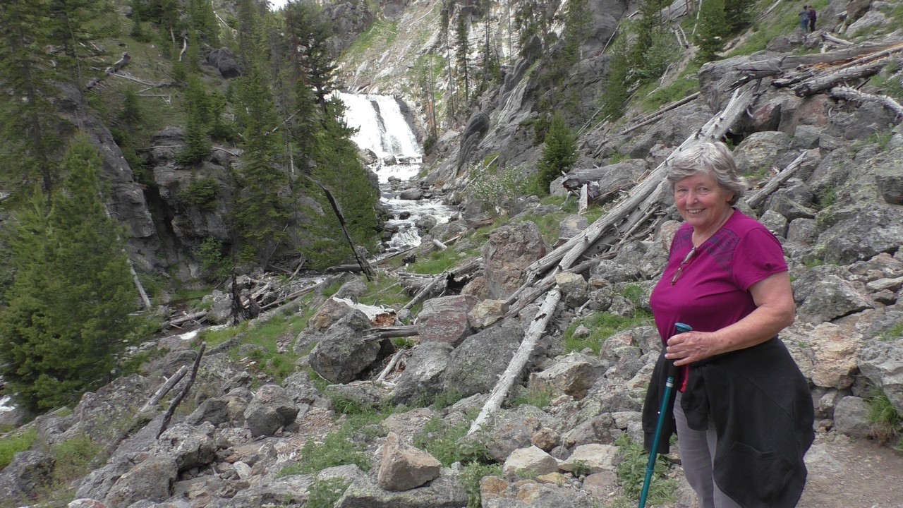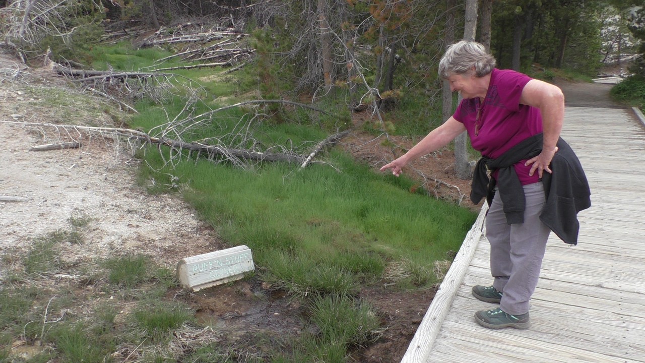 Na de koffie door naar een andere Geiser gebied. Die van de Biscuit Basin. Ook hier de boardwalk trial gedaan, maar halverwege was er en mooie hike route naar de Mystic Falls. Volgens de wandelkaart een 2,4 miles (4 km) (heen en terug), maar zou moderately strenous zijn (redelijk zwaar), maar Moeders voelde zich goed dus wij de stoute “wandel”schoenen aan en de trial op. Nou dit trial viel reuze mee, afgelopen weken hebben we zwaardere hikes gedaan. En zoals gewoonlijk was de trip weer de moeite waard. Een zeer mooi wandelpad met aan het eind een geweldige waterval. Het blijft toch mooi. Onderweg alleen maar wat eekhoorntjes gezien. Helaas nog steeds geen beer…………. Daar we de afgelopen dagen toch wel een aantal routes hebben gelopen waar je zomaar een beer zou kunnen tegenkomen en omdat we de komende dagen ook nog in Bearcountry verblijven hebben we, ook op advies van de Rangers” een beerspray aangeschaft. Dit is een soort peperspray wat je kan gebruiken als er een beer naar je toe zou komen. Uiteraard is het wel belangrijk om eerst de andere maatregelen te hebben gedaan en als laatste alternatief zou je de spray in kunnen zetten. Hopelijk hoeven we hem niet te gebruiken deze vakantie………