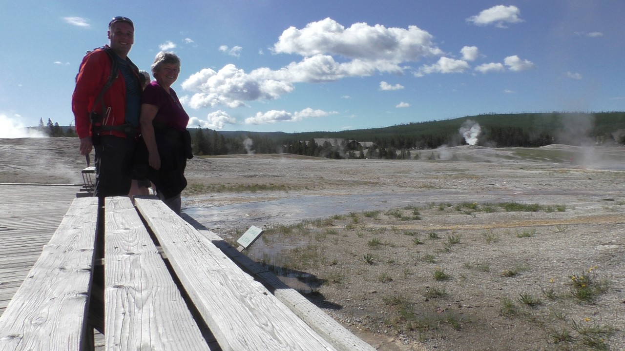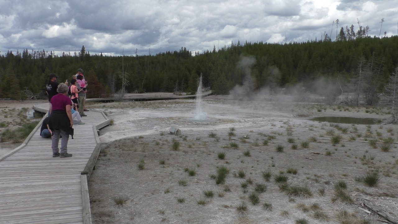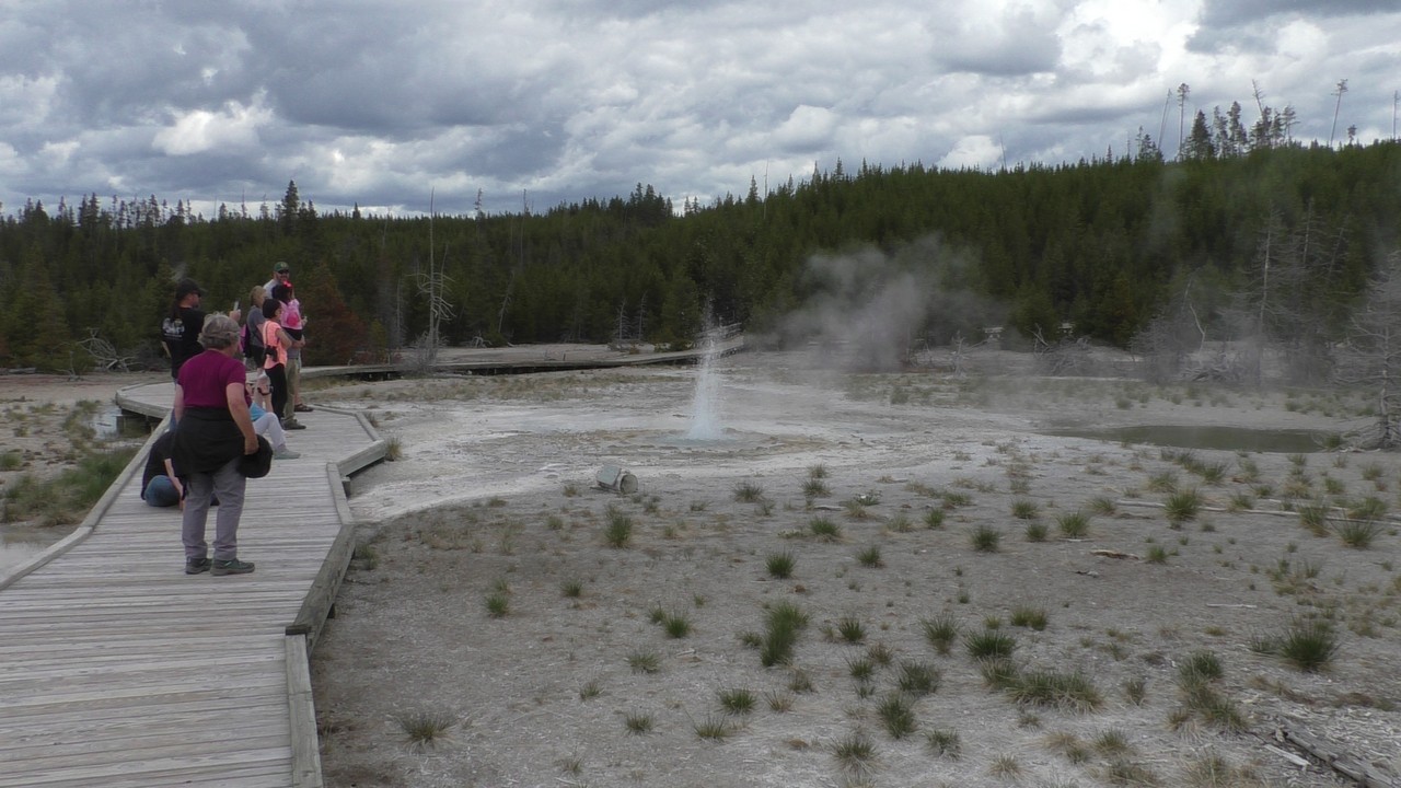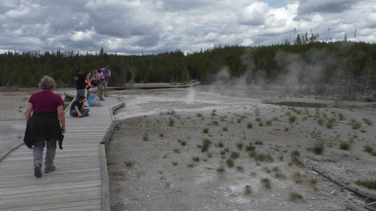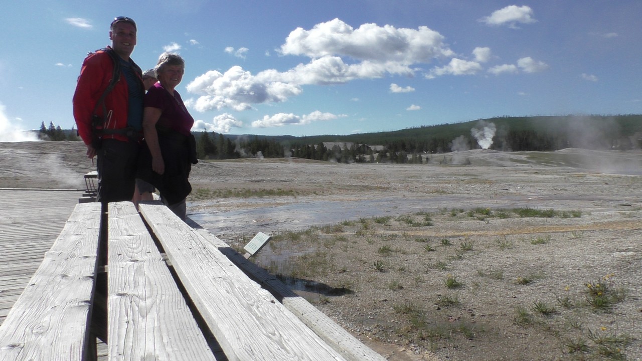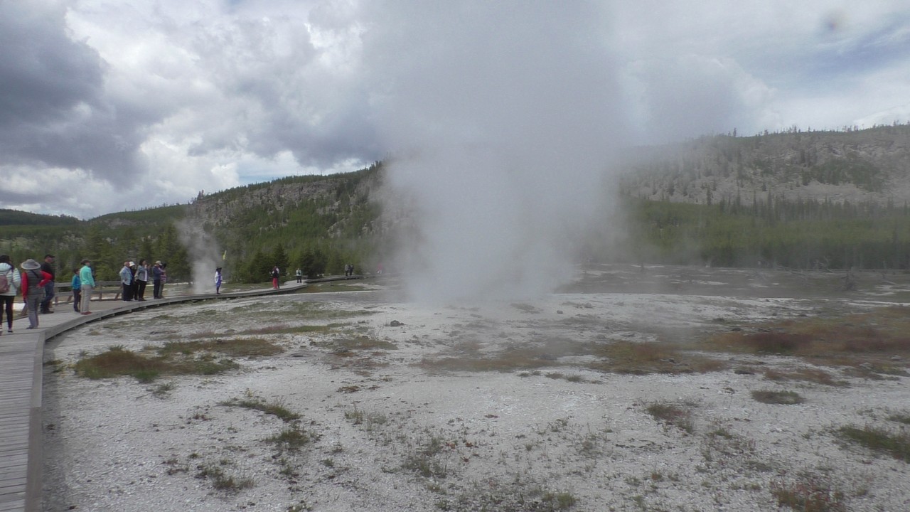 Het stinkt er soms wel heel erg naar rotte eieren, maar zelfs daar wen je wel een beetje aan. Na ook nog de boardwalk trail rondom het gebied van de Old Faithful te hebben gelopen, hebben we eerst nog een bak koffie gedaan. Terwijl ik bij de bar stond om koffie te halen, zat moeders, voor het raam naar de Old Faithful te kijken en ja hoor daar ging die weer.