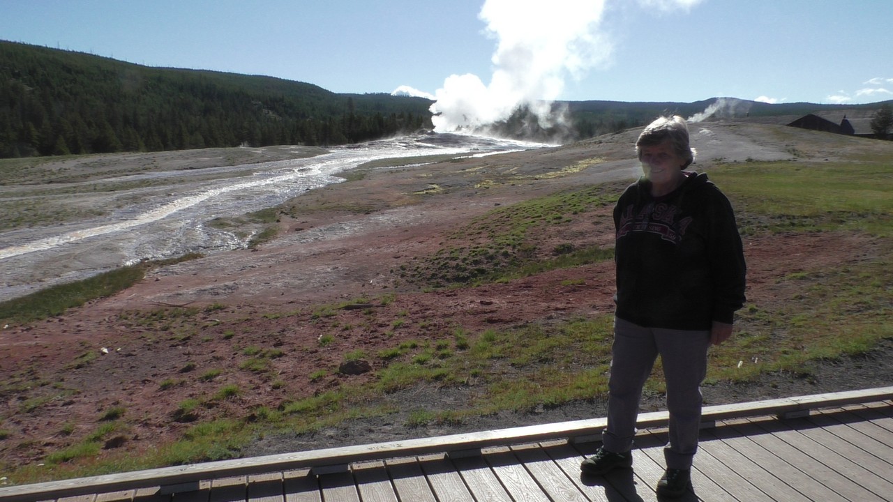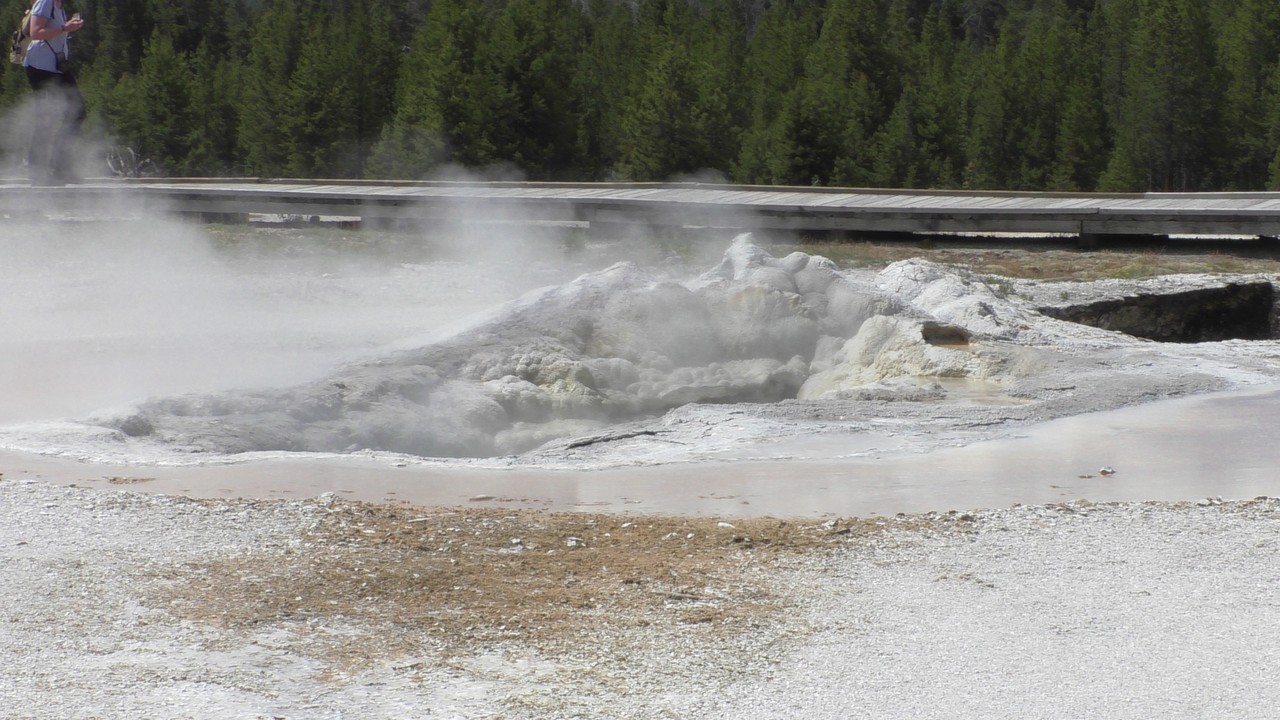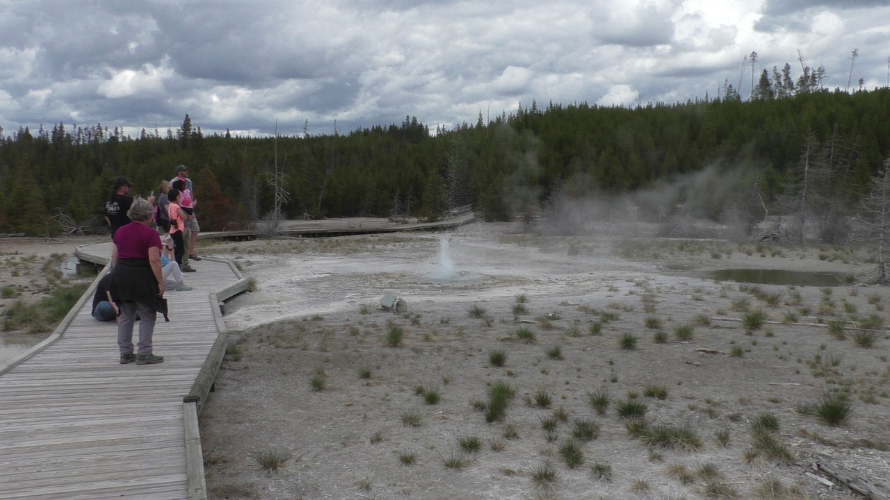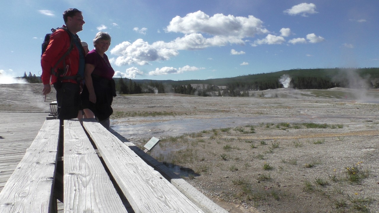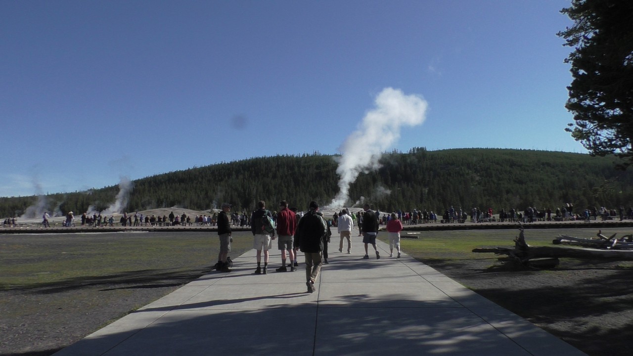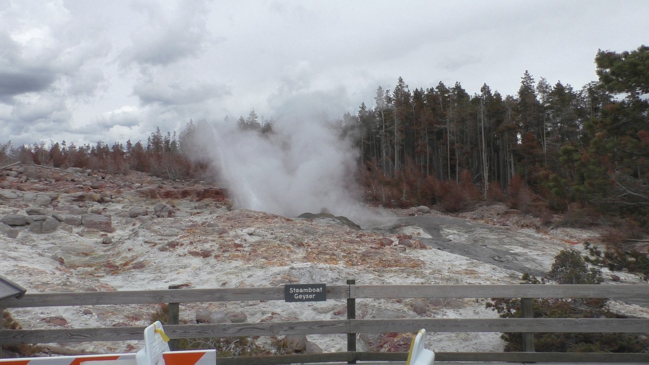 Het stinkt er soms wel heel erg naar rotte eieren, maar zelfs daar wen je wel een beetje aan. Na ook nog de boardwalk trail rondom het gebied van de Old Faithful te hebben gelopen, hebben we eerst nog een bak koffie gedaan. Terwijl ik bij de bar stond om koffie te halen, zat moeders, voor het raam naar de Old Faithful te kijken en ja hoor daar ging die weer.