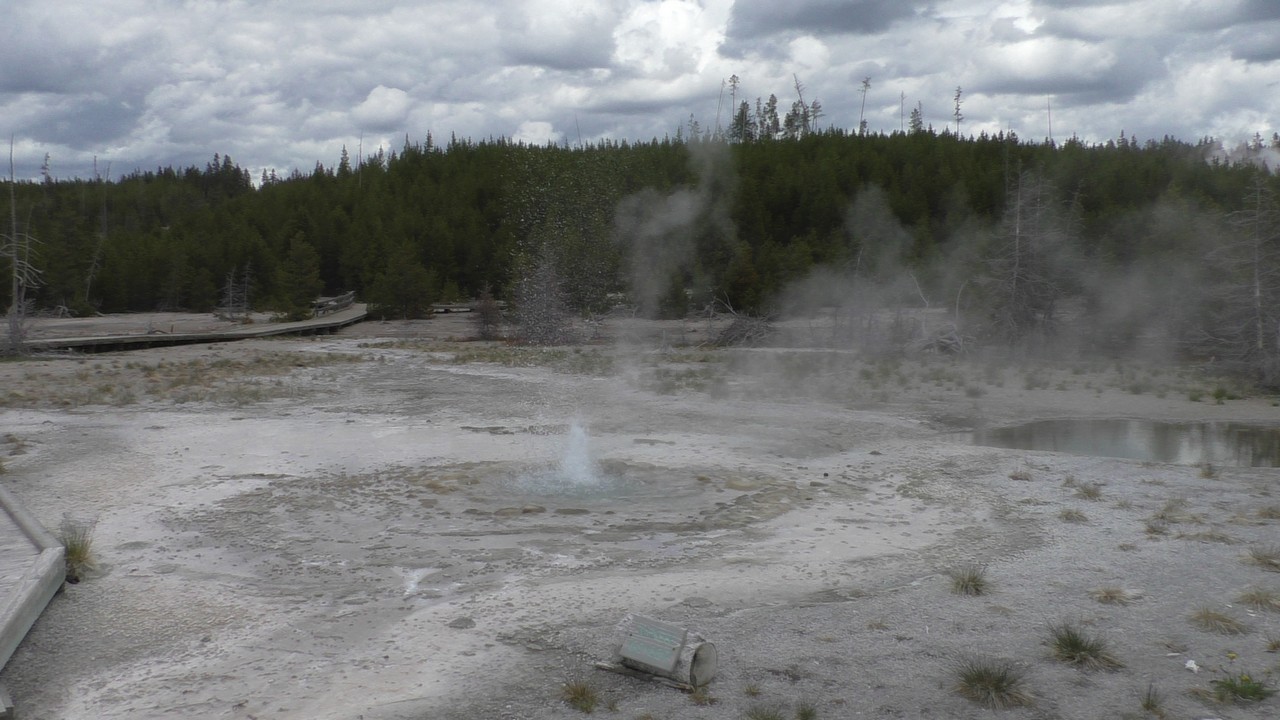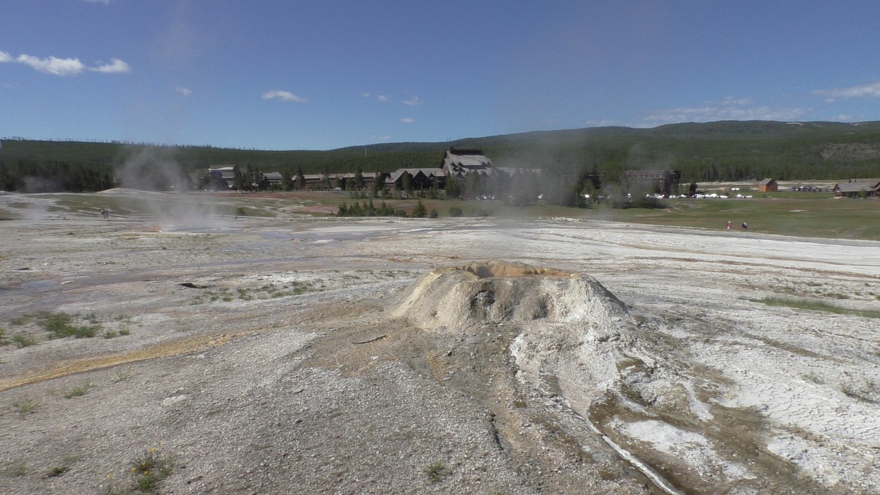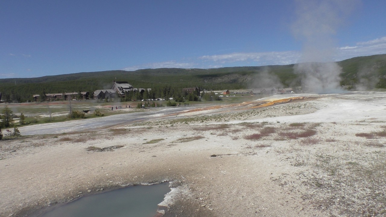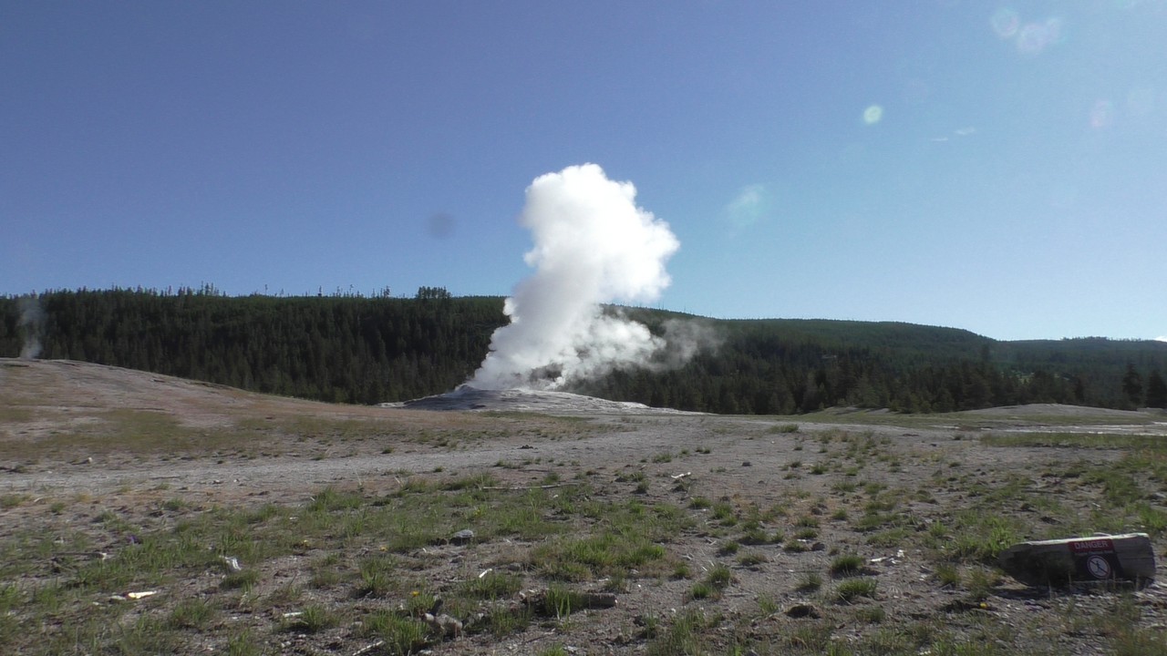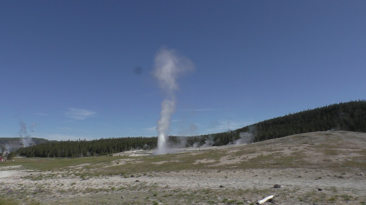 Het stinkt er soms wel heel erg naar rotte eieren, maar zelfs daar wen je wel een beetje aan. Na ook nog de boardwalk trail rondom het gebied van de Old Faithful te hebben gelopen, hebben we eerst nog een bak koffie gedaan. Terwijl ik bij de bar stond om koffie te halen, zat moeders, voor het raam naar de Old Faithful te kijken en ja hoor daar ging die weer.