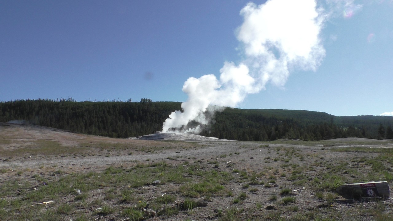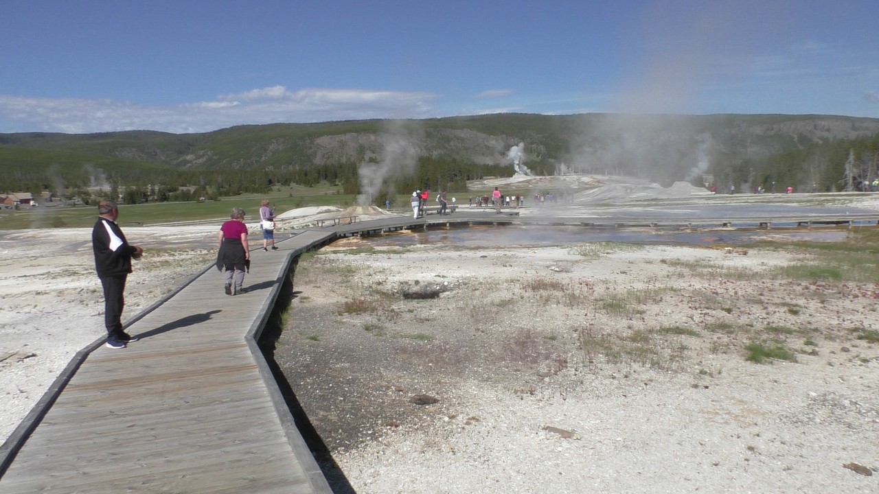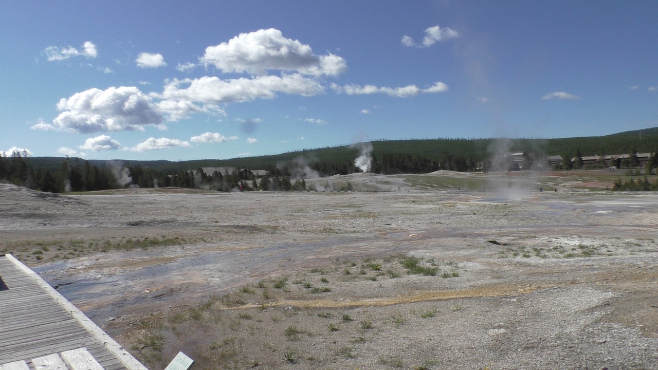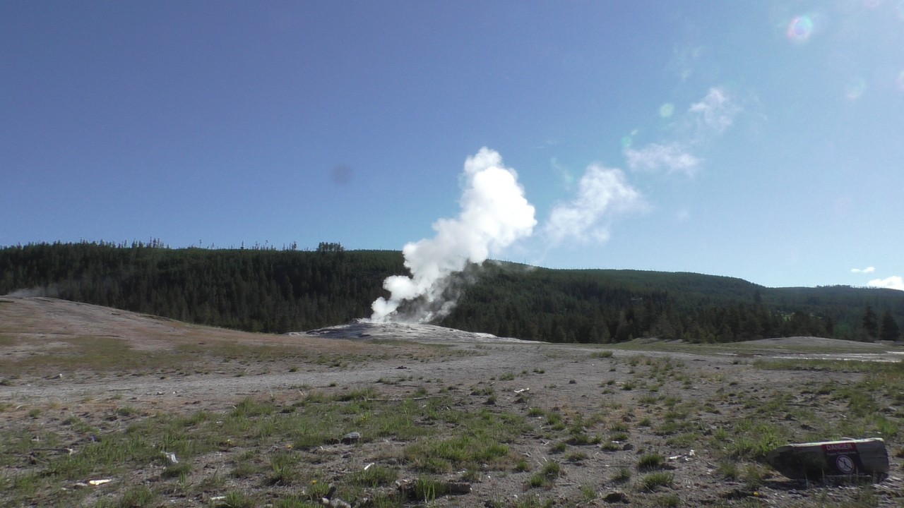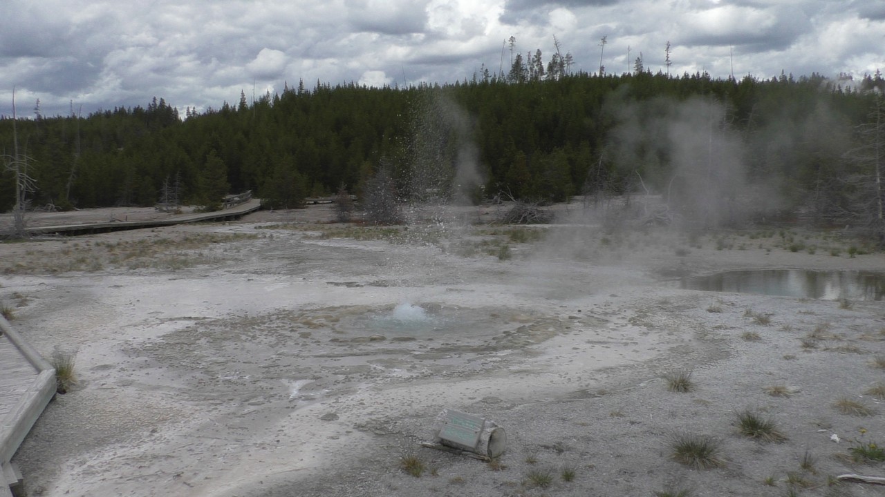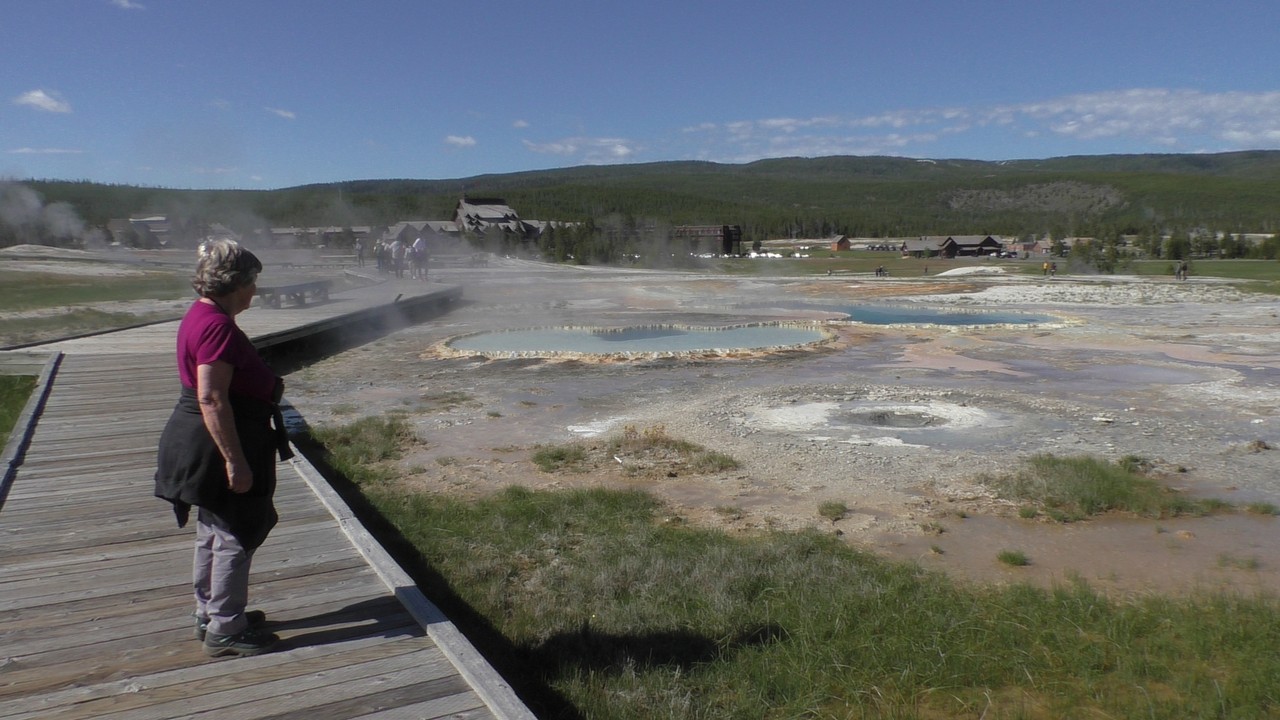 Het stinkt er soms wel heel erg naar rotte eieren, maar zelfs daar wen je wel een beetje aan. Na ook nog de boardwalk trail rondom het gebied van de Old Faithful te hebben gelopen, hebben we eerst nog een bak koffie gedaan. Terwijl ik bij de bar stond om koffie te halen, zat moeders, voor het raam naar de Old Faithful te kijken en ja hoor daar ging die weer.