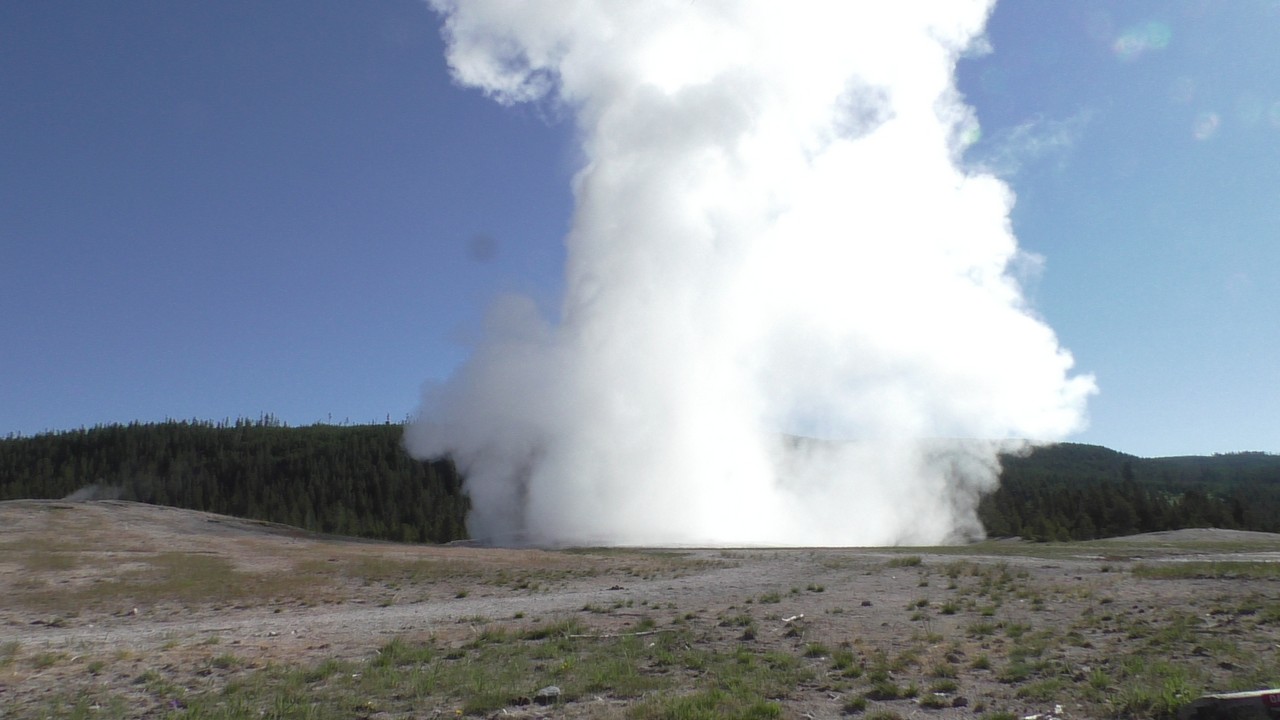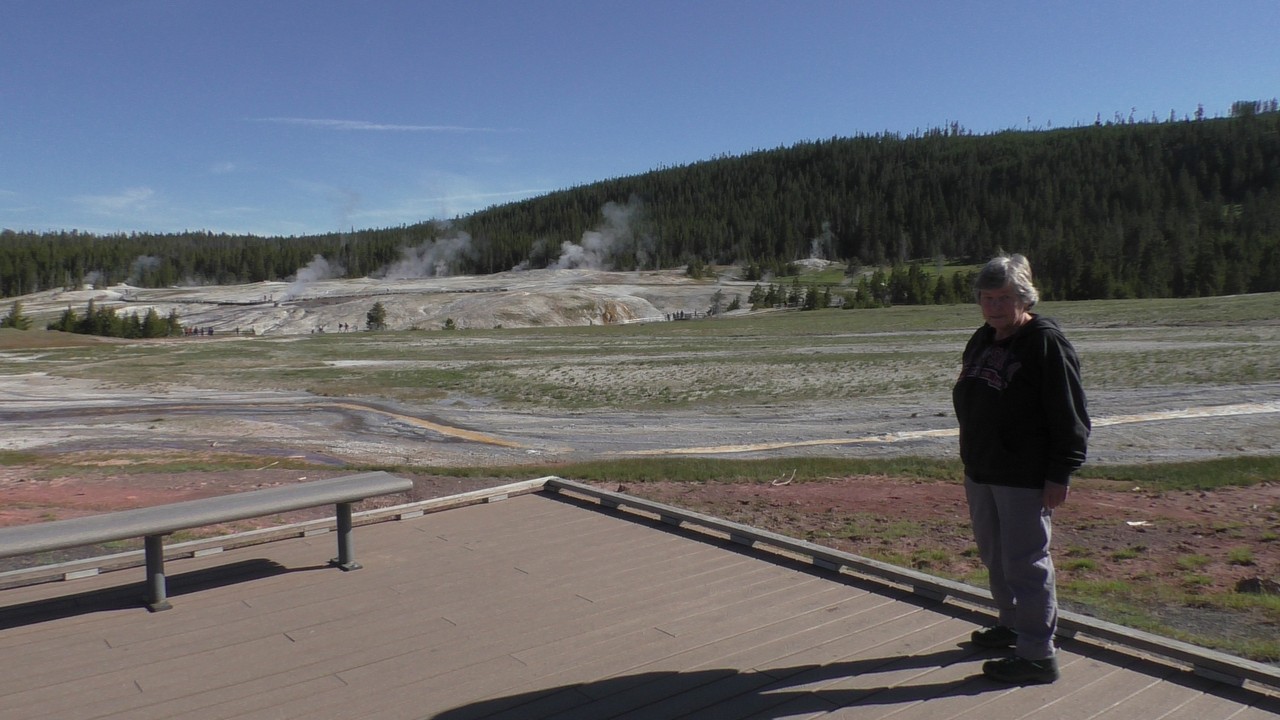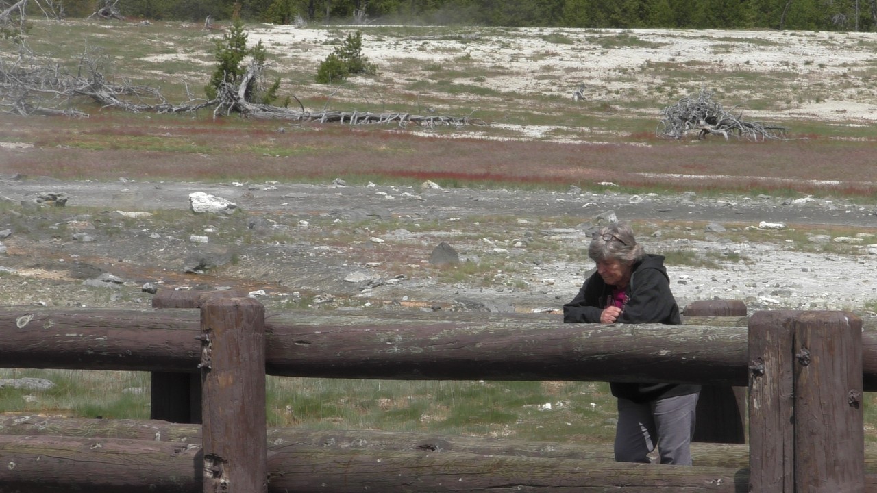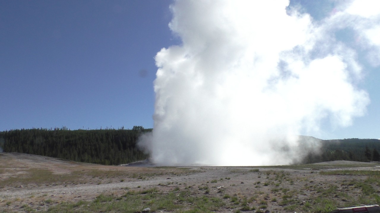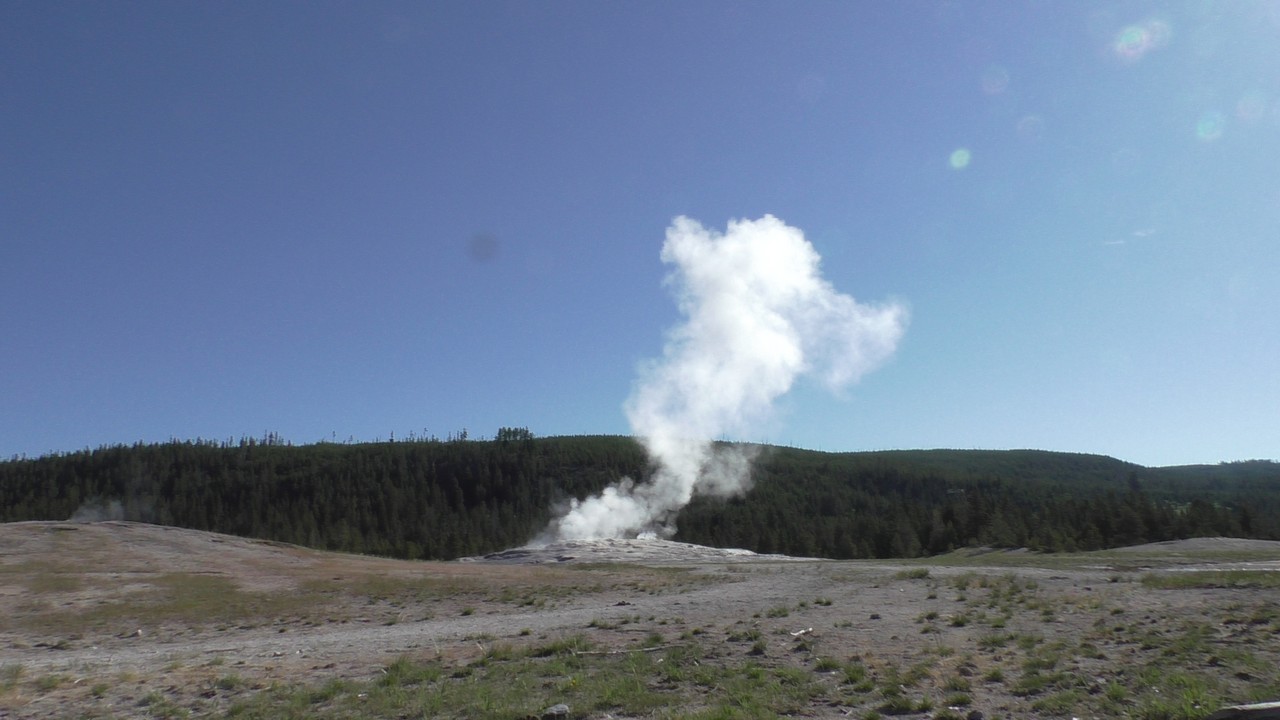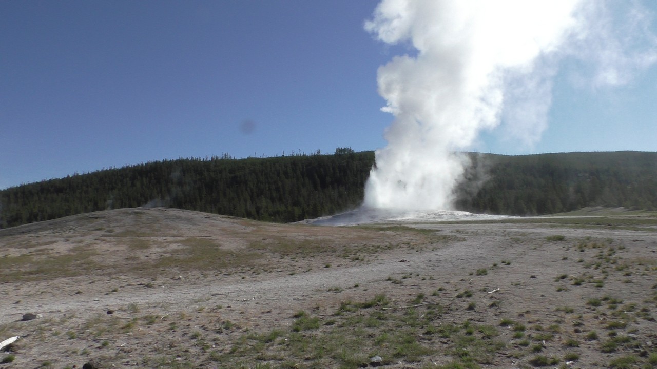 Het stinkt er soms wel heel erg naar rotte eieren, maar zelfs daar wen je wel een beetje aan. Na ook nog de boardwalk trail rondom het gebied van de Old Faithful te hebben gelopen, hebben we eerst nog een bak koffie gedaan. Terwijl ik bij de bar stond om koffie te halen, zat moeders, voor het raam naar de Old Faithful te kijken en ja hoor daar ging die weer.