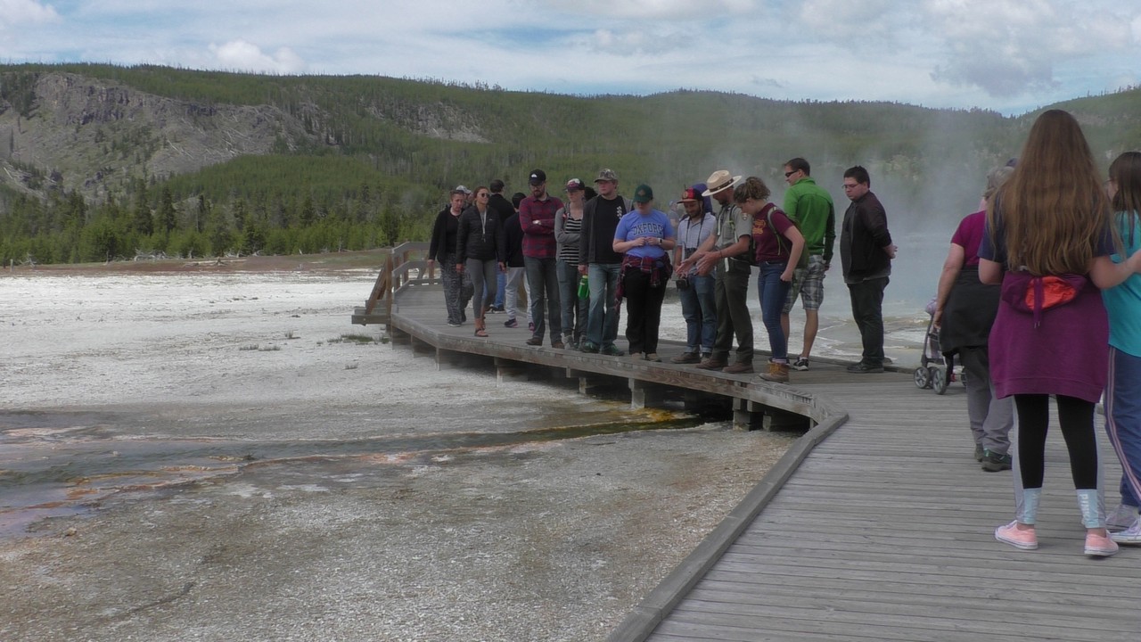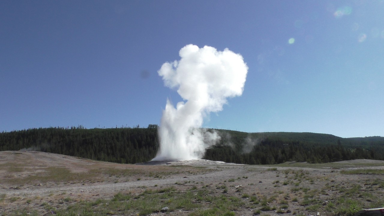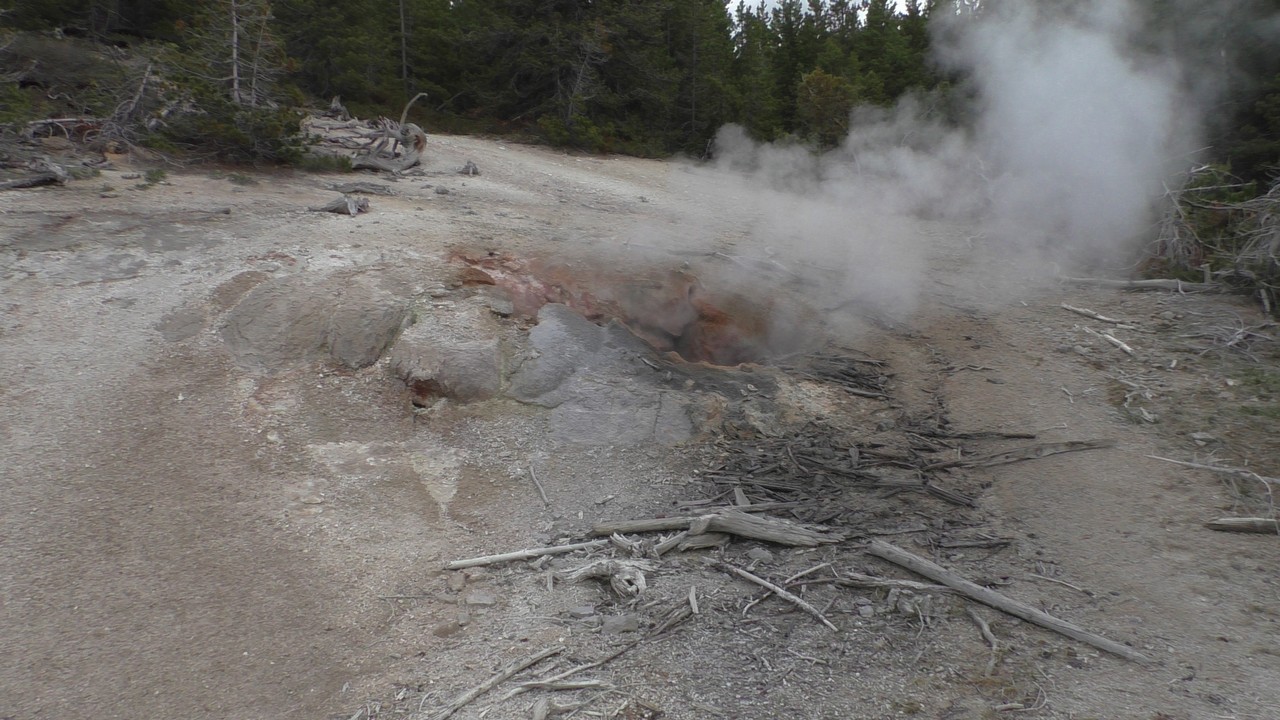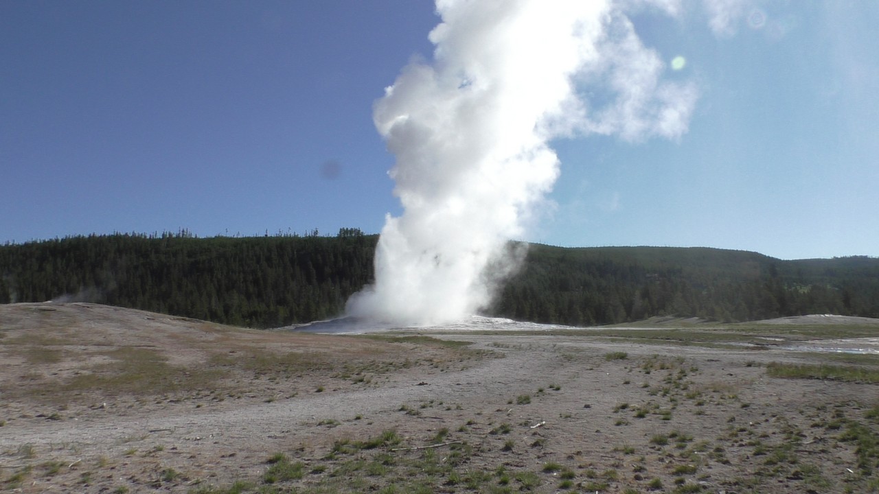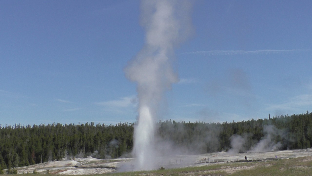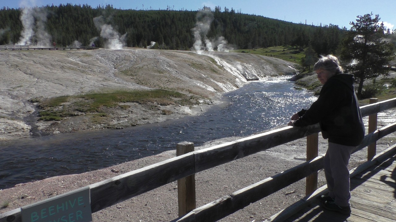 Het stinkt er soms wel heel erg naar rotte eieren, maar zelfs daar wen je wel een beetje aan. Na ook nog de boardwalk trail rondom het gebied van de Old Faithful te hebben gelopen, hebben we eerst nog een bak koffie gedaan. Terwijl ik bij de bar stond om koffie te halen, zat moeders, voor het raam naar de Old Faithful te kijken en ja hoor daar ging die weer.
