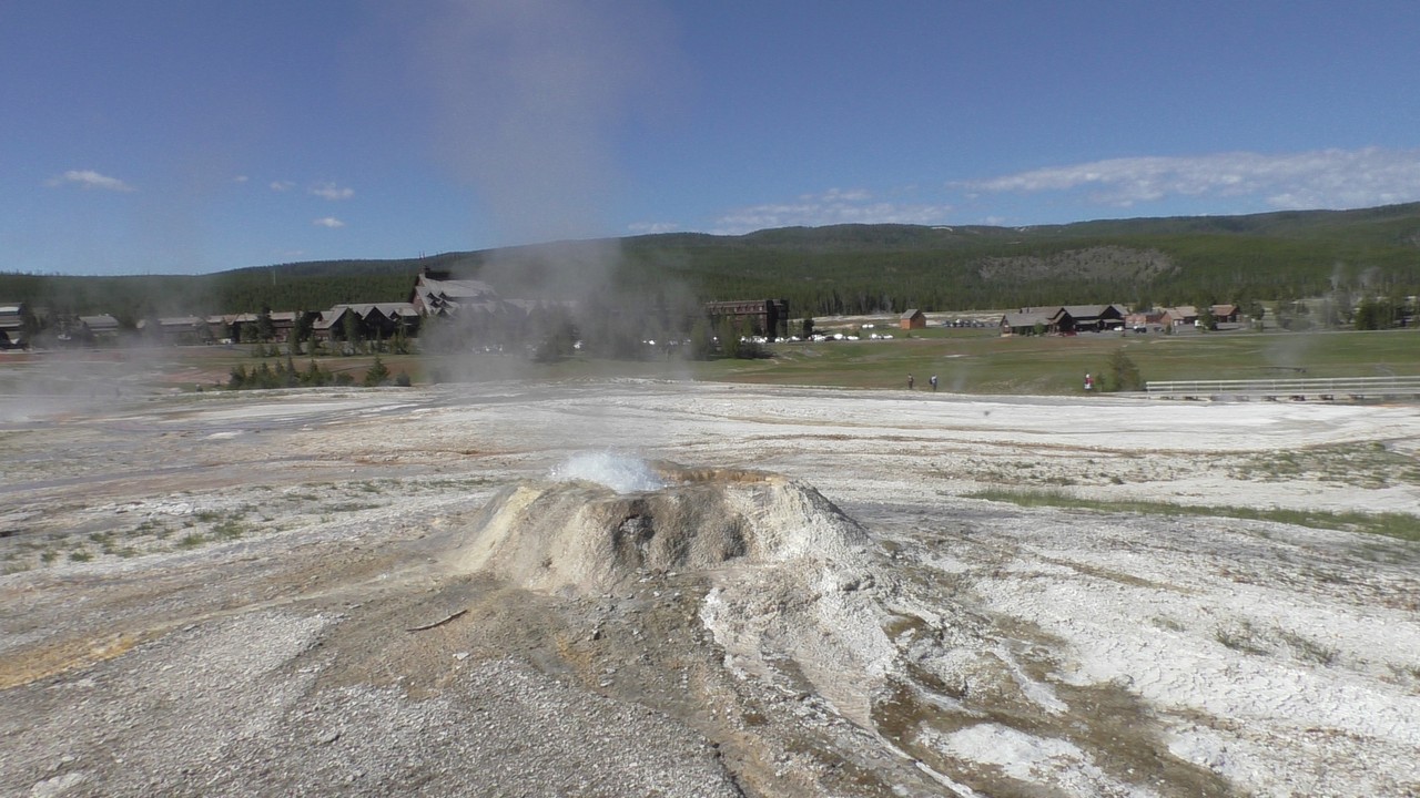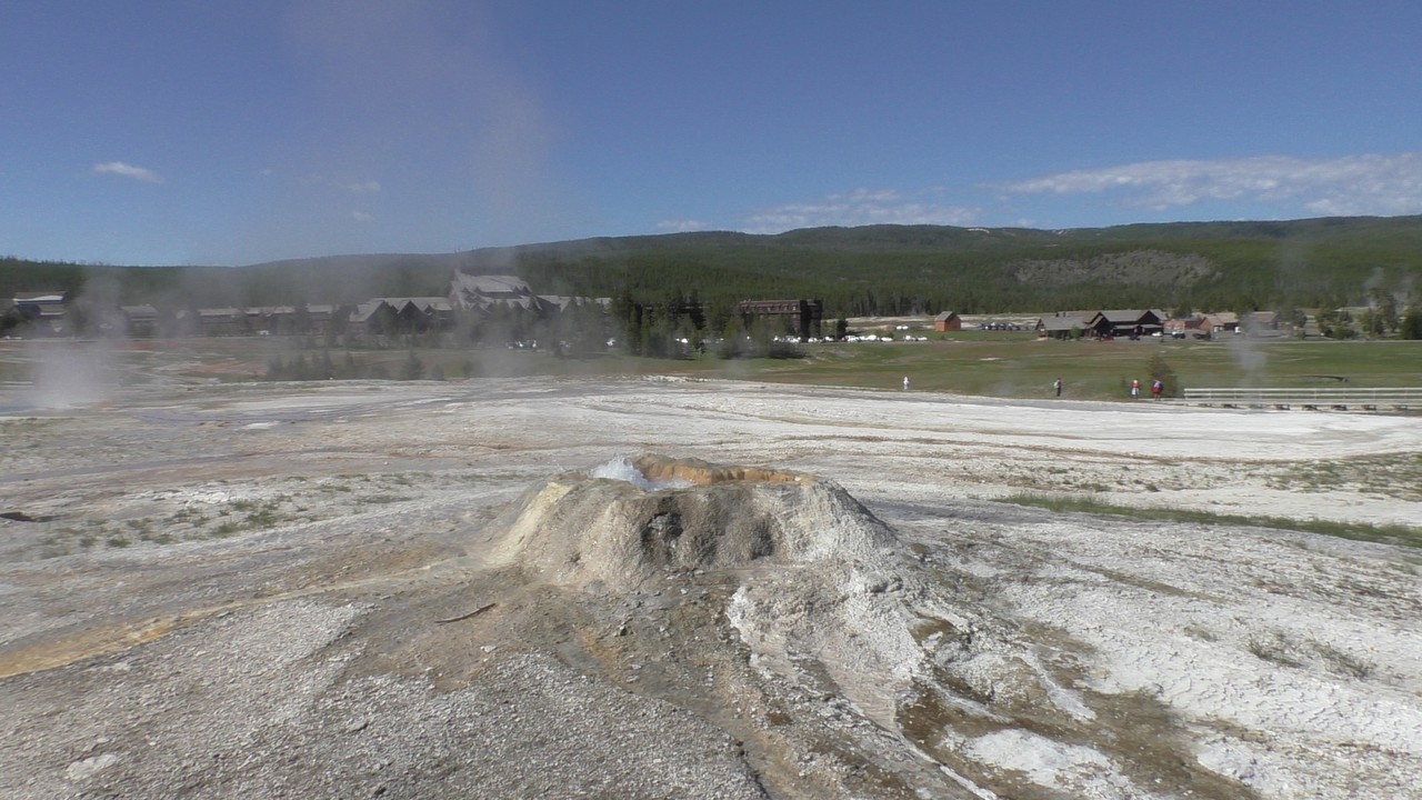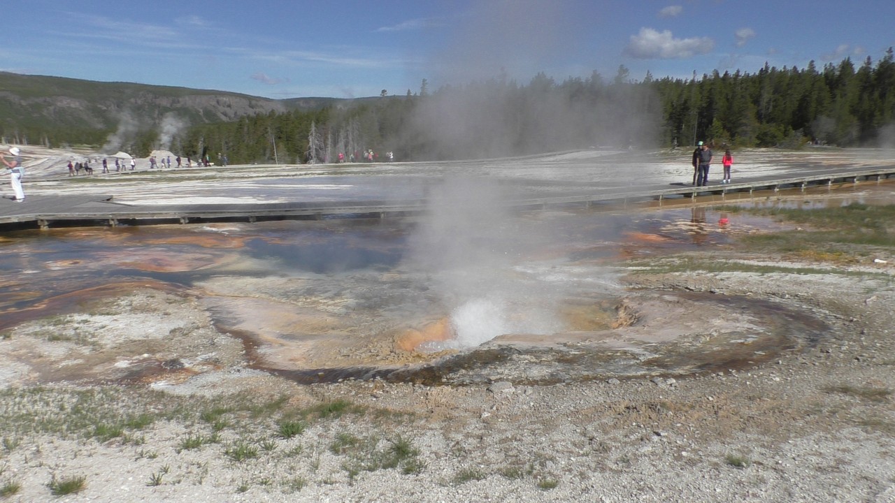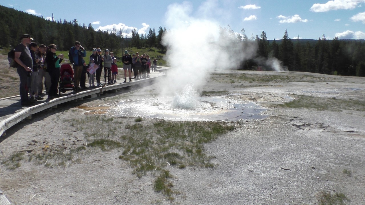 Terwijl we aankwamen was de verwachting dat Old Faithfull om 08.35 zou gaan spuiten en de voorspellingen hebben altijd een +/- 10 minuten speling. Wij kwamen om 08.30 uur aan dus zijn ook gelijk doorgelopen en een plekje gezocht. Het was niet echt druk, maar we waren zeker niet de enige. De hele tijd rommelt en sputtert de geiser en dan ineens, om 08.47 uur gaat hij helemaal los en spuit hij een flinke lading stomend kokend water de lucht in. Erg gaaf om van zo dichtbij te zien. In de verte was er ook nog één flink aan het spuiten, hier zijn we later nog aan voorbij gelopen.