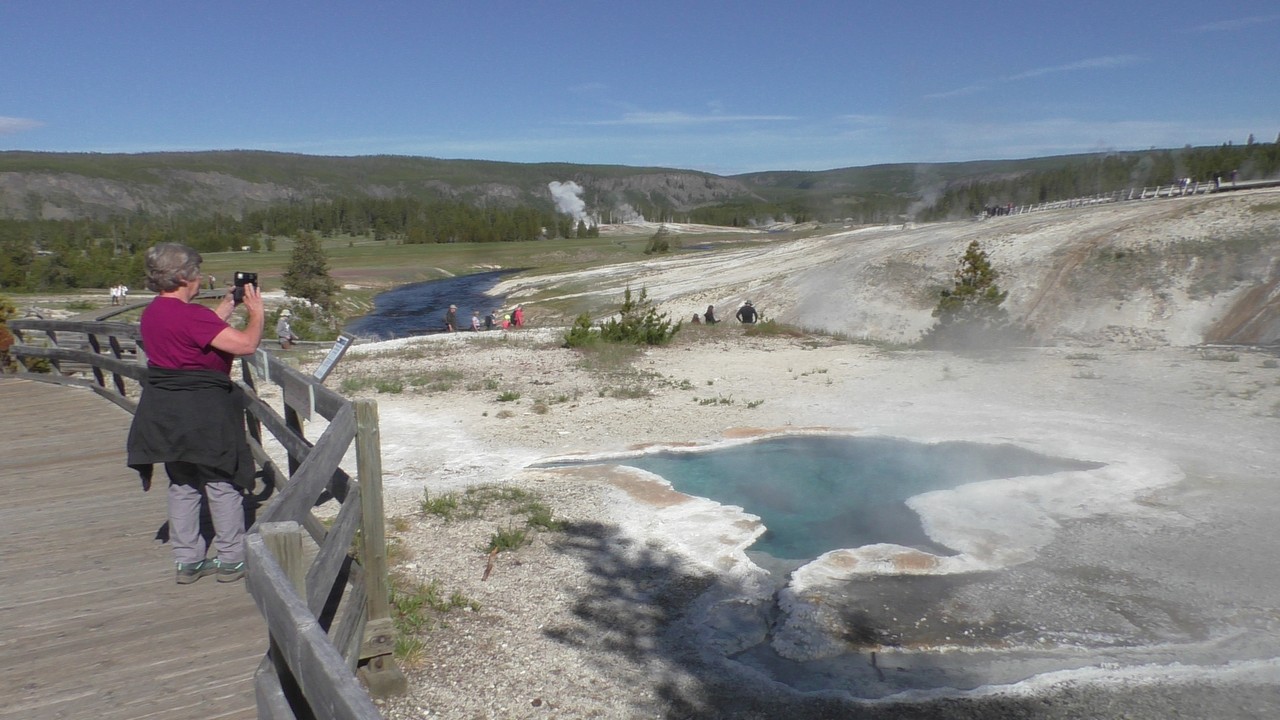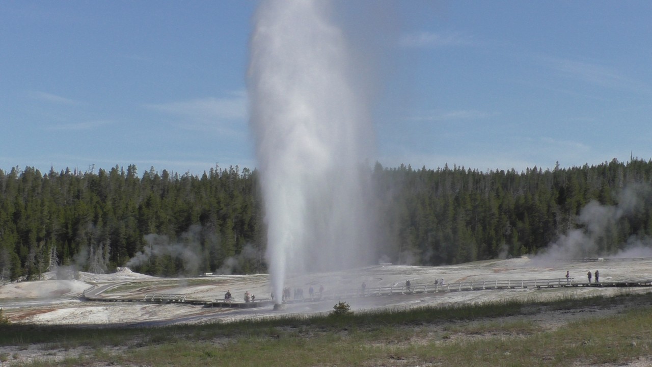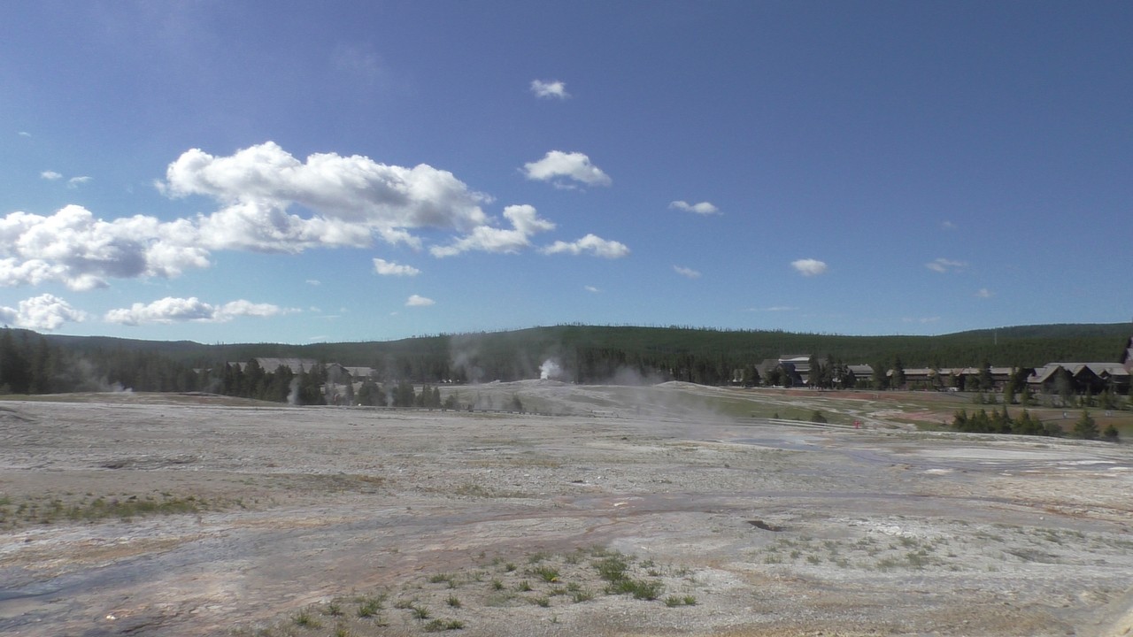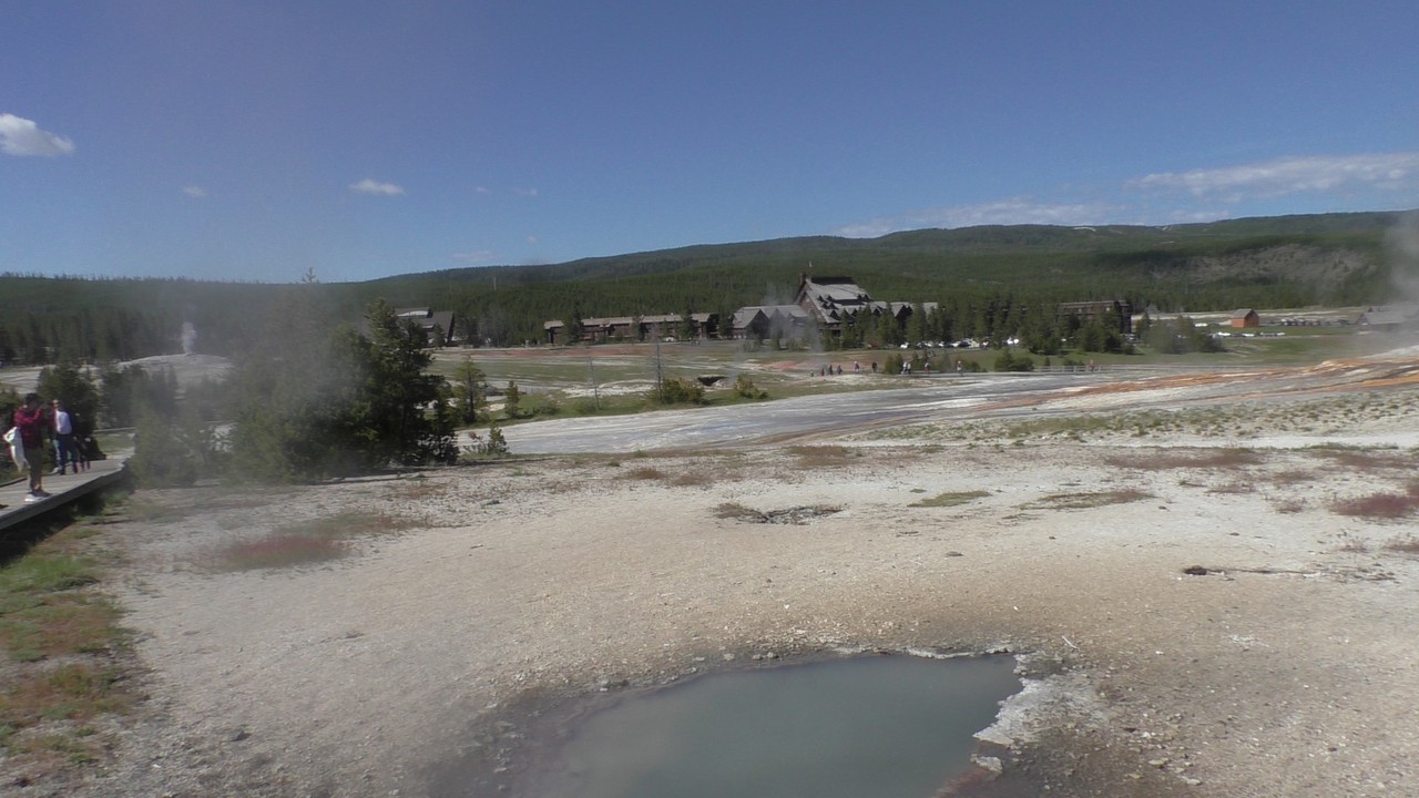 Terwijl we aankwamen was de verwachting dat Old Faithfull om 08.35 zou gaan spuiten en de voorspellingen hebben altijd een +/- 10 minuten speling. Wij kwamen om 08.30 uur aan dus zijn ook gelijk doorgelopen en een plekje gezocht. Het was niet echt druk, maar we waren zeker niet de enige. De hele tijd rommelt en sputtert de geiser en dan ineens, om 08.47 uur gaat hij helemaal los en spuit hij een flinke lading stomend kokend water de lucht in. Erg gaaf om van zo dichtbij te zien. In de verte was er ook nog één flink aan het spuiten, hier zijn we later nog aan voorbij gelopen.