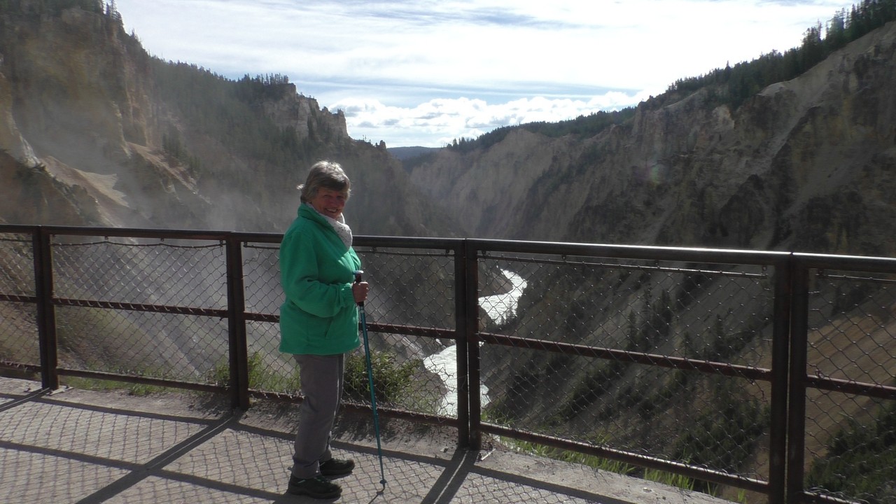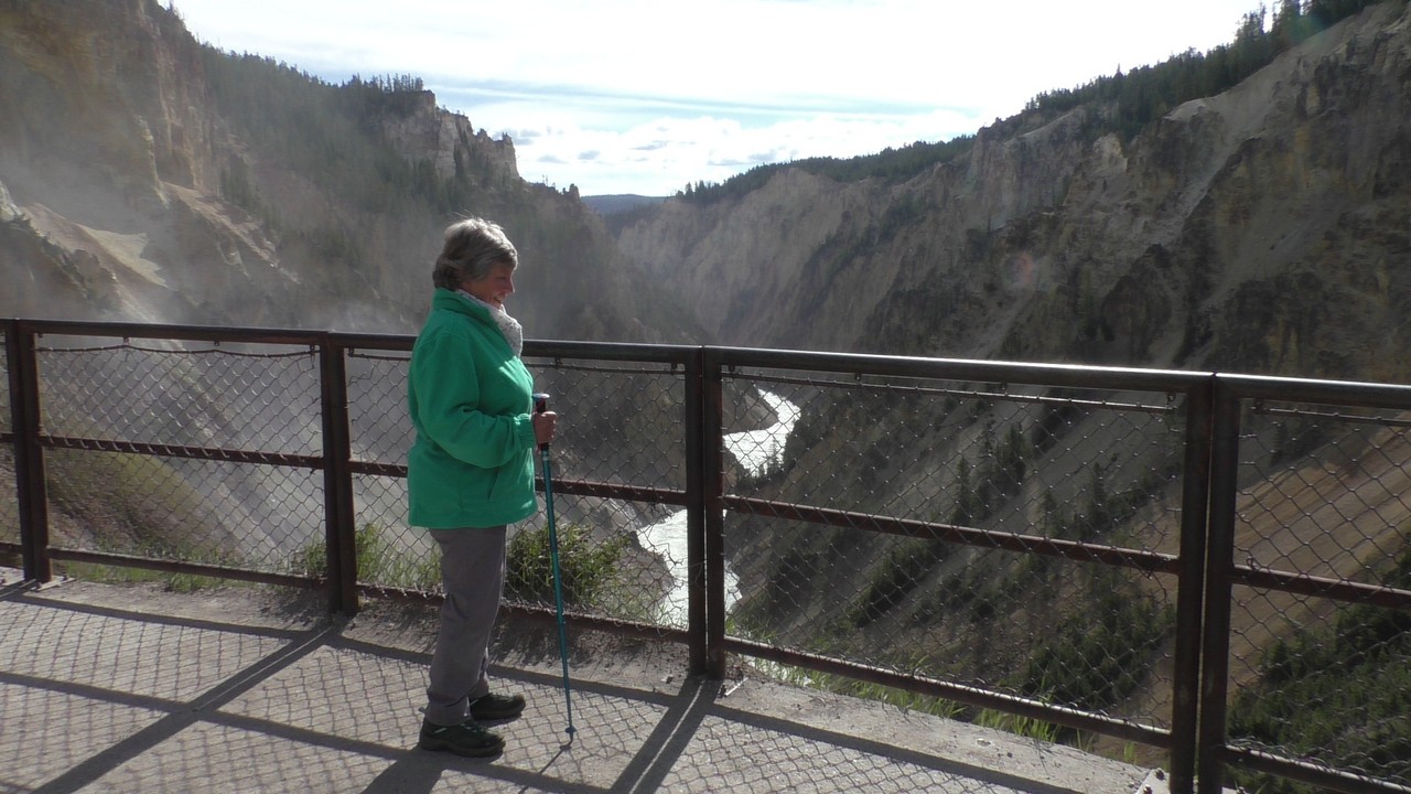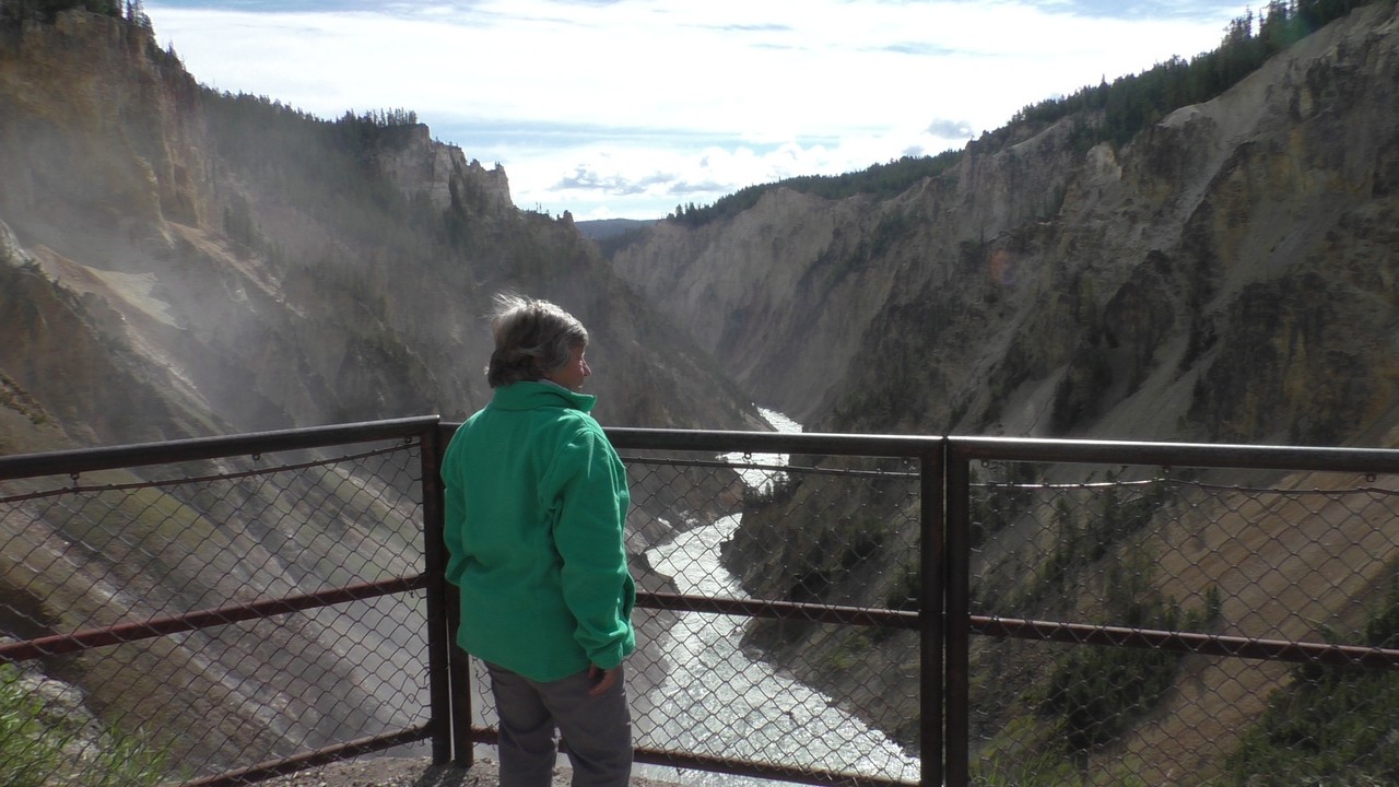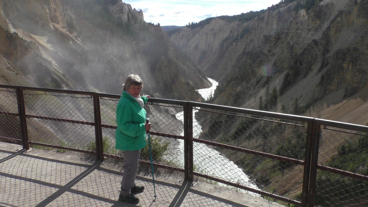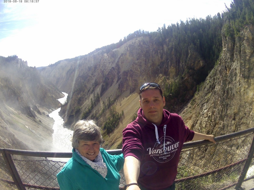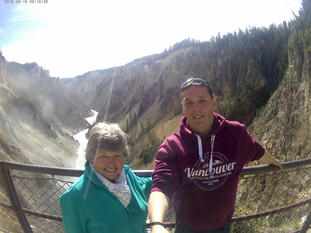 We rijden verder en dieper het park in en stoppen uiteindelijk bij de Grand Canyon van Yellowstone. Er zijn 2 geweldige watervallen en we besluiten naar één daarvan te lopen. Pfffff. Dat was best een tippel en we zijn nu alleen maar bergaf gegaan, we moeten straks weer bergop. Maar het uitzicht is adembenemend en we weten niet welke kant je op moet kijken. Goed, genoeg foto’s gemaakt, we moeten nu uiteindelijk weer naar boven. Boven aangekomen hebben we het toch maar weer gedaan. Ben trots op je moeder……..