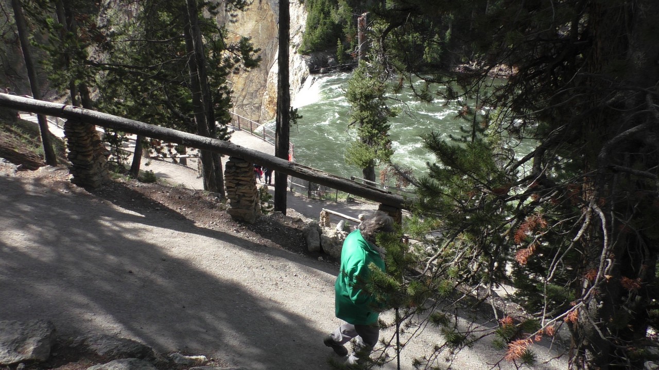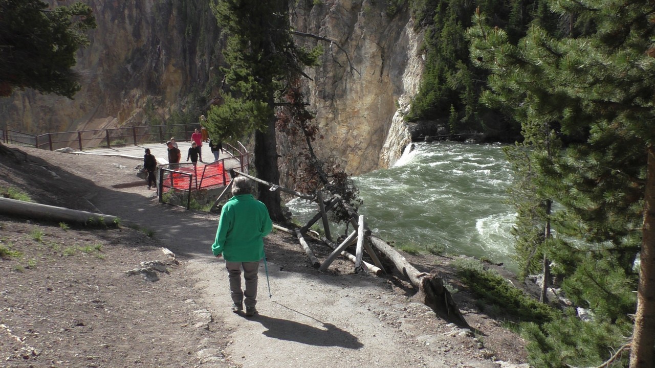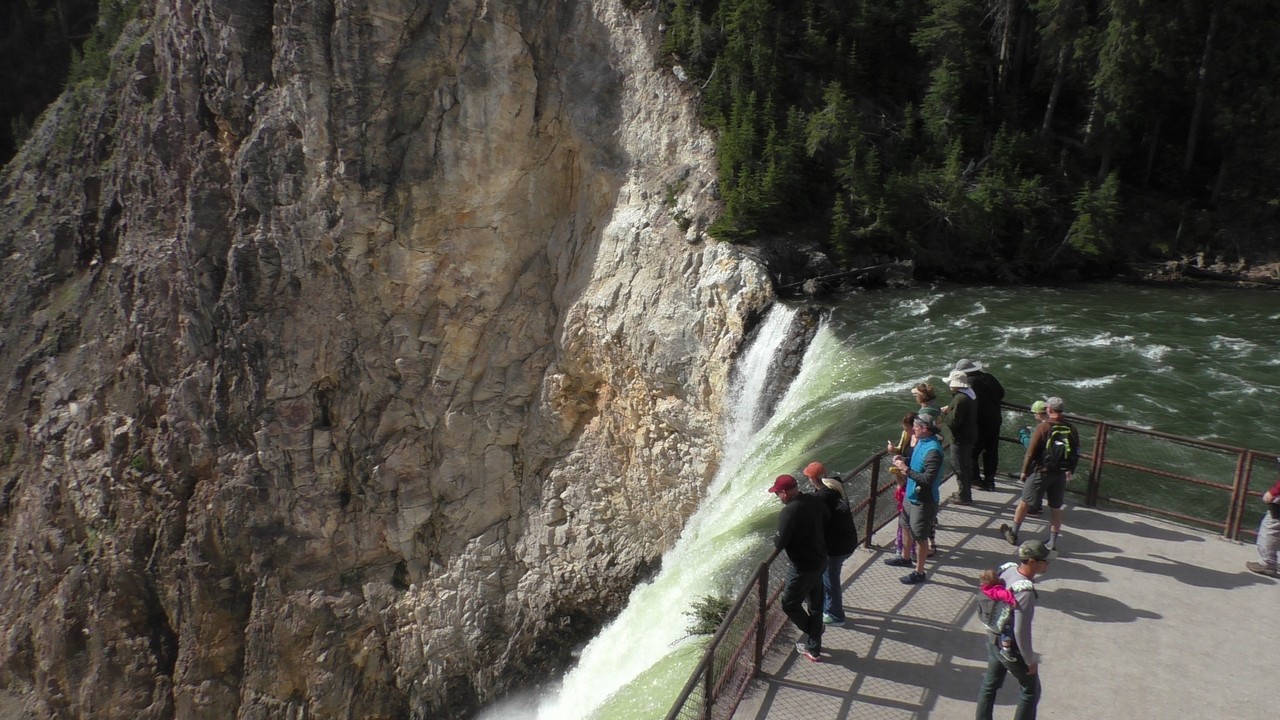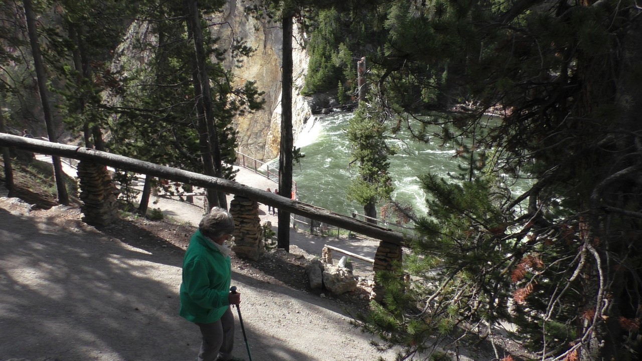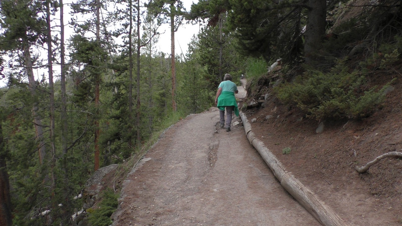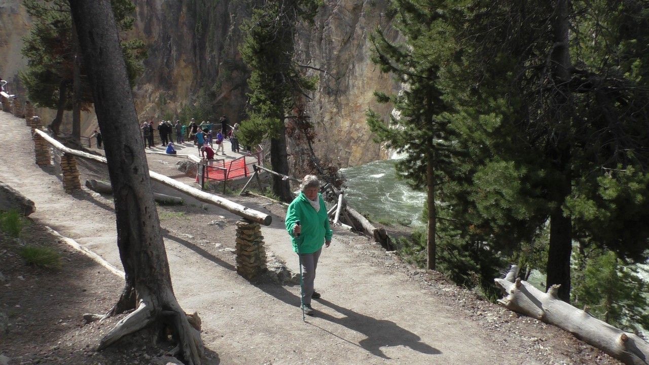We rijden verder en dieper het park in en stoppen uiteindelijk bij de Grand Canyon van Yellowstone. Er zijn 2 geweldige watervallen en we besluiten naar één daarvan te lopen. Pfffff. Dat was best een tippel en we zijn nu alleen maar bergaf gegaan, we moeten straks weer bergop. Maar het uitzicht is adembenemend en we weten niet welke kant je op moet kijken. Goed, genoeg foto’s gemaakt, we moeten nu uiteindelijk weer naar boven. Boven aangekomen hebben we het toch maar weer gedaan. Ben trots op je moeder……..