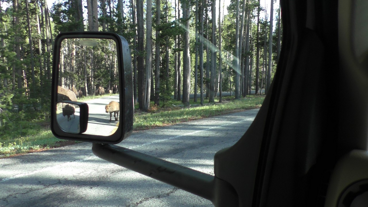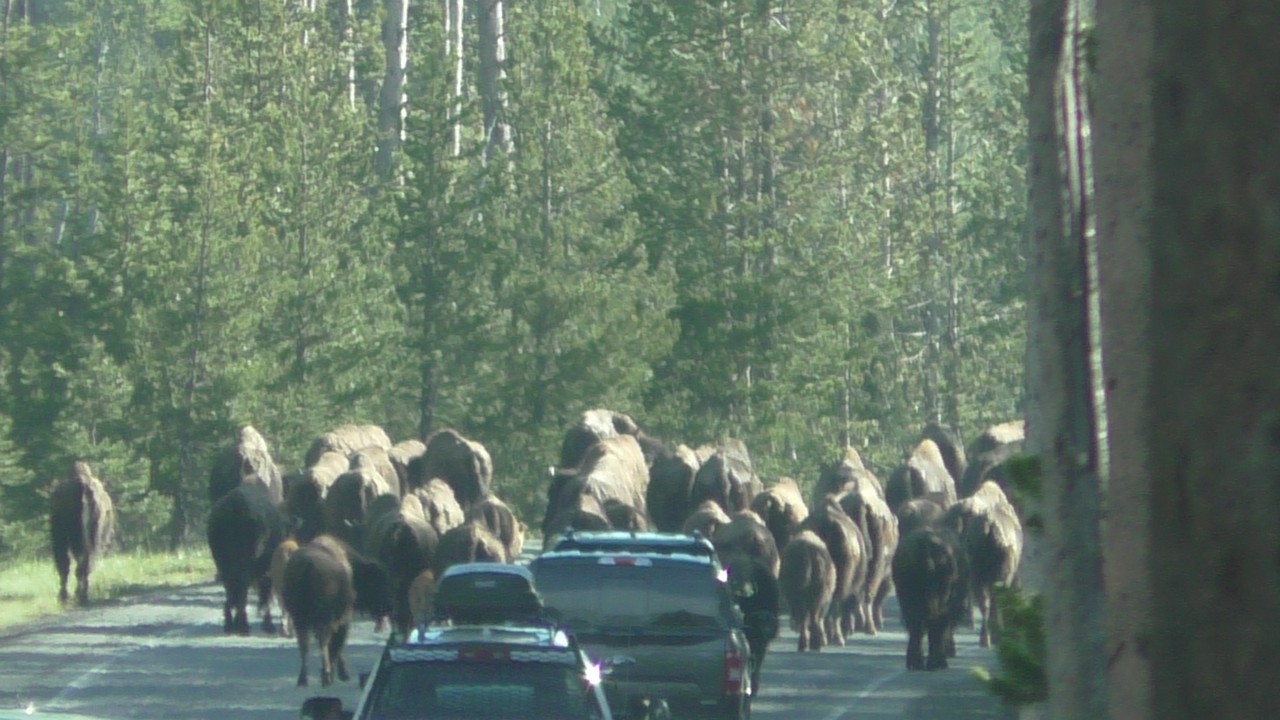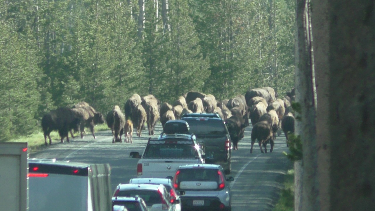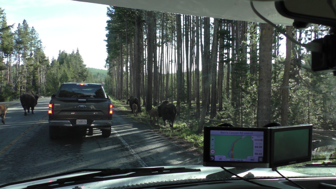 Dan volgt hier het filebericht : In Yellowstone staat er een kleine file richting noorden, dit wordt veroorzaakt door een aantal bizons op de weg. Haal niet in, blijft rechts rijden en probeer de bizons te ontwijken als ze in de buurt komen…..