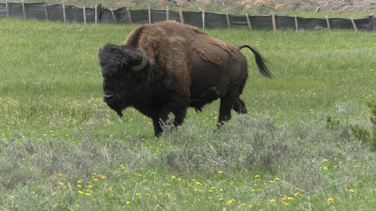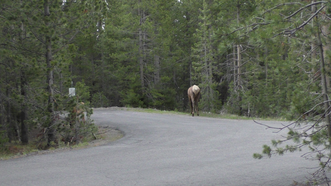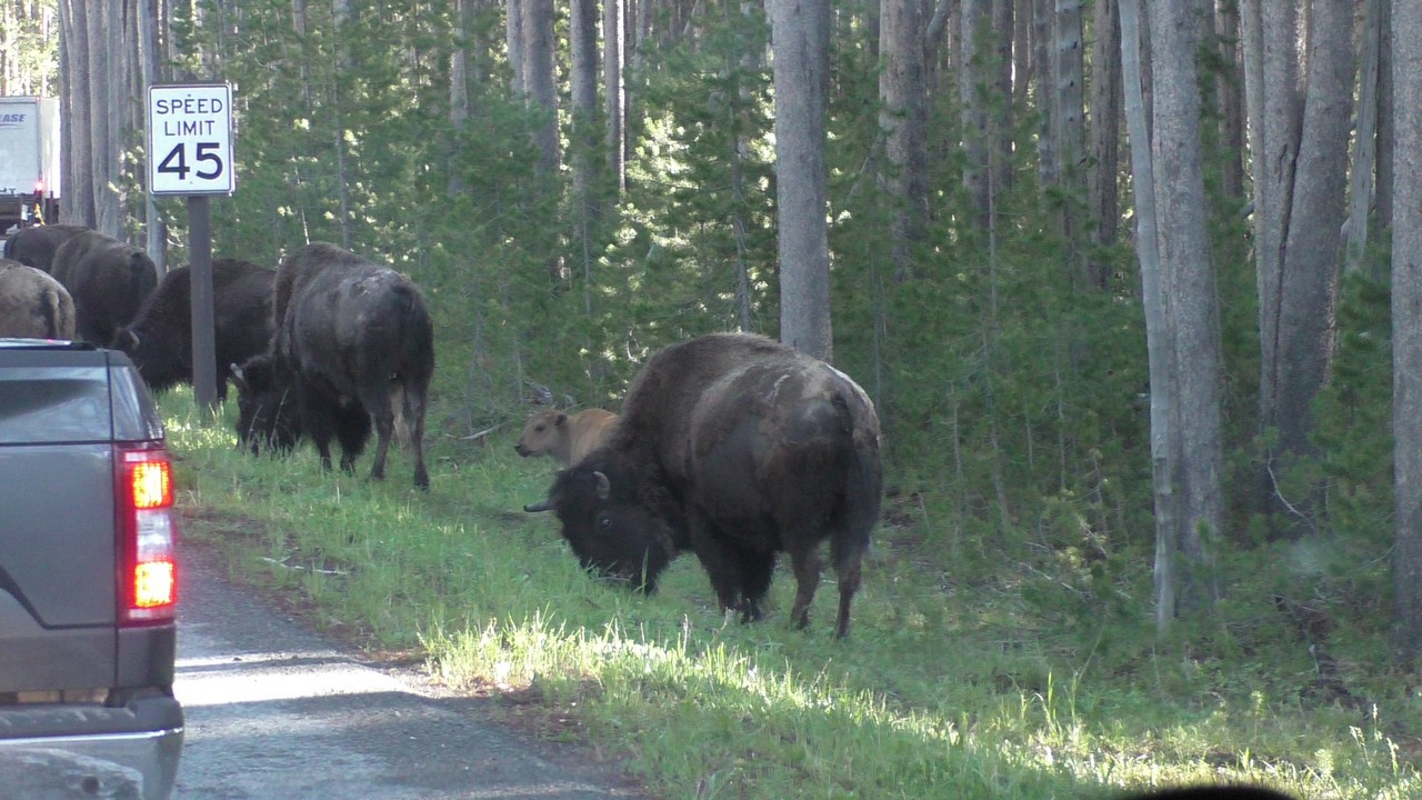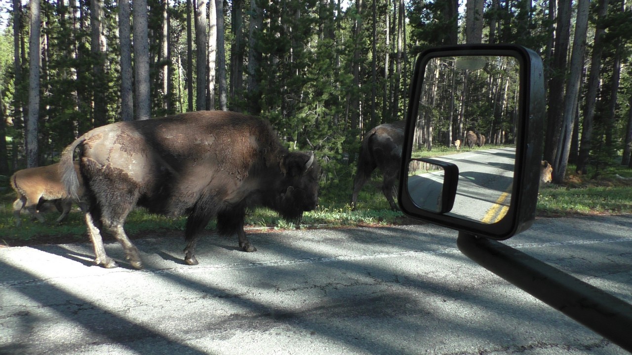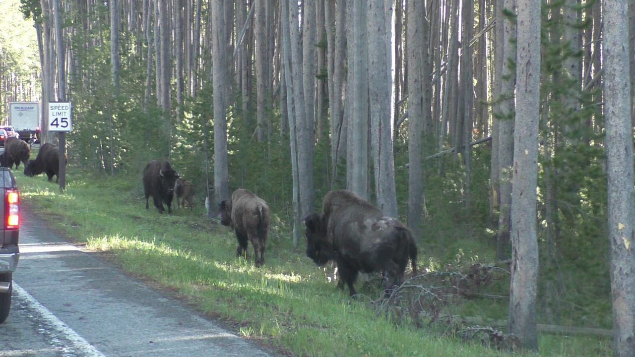 Dan volgt hier het filebericht : In Yellowstone staat er een kleine file richting noorden, dit wordt veroorzaakt door een aantal bizons op de weg. Haal niet in, blijft rechts rijden en probeer de bizons te ontwijken als ze in de buurt komen…..