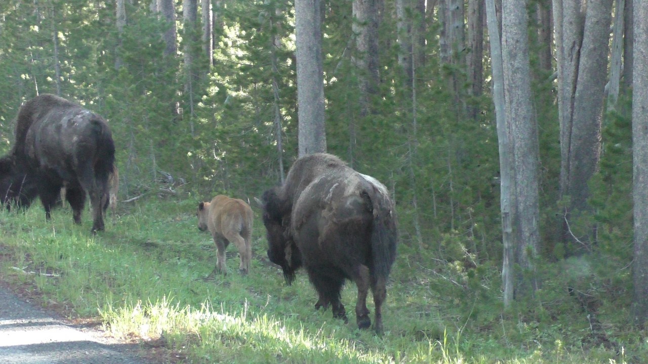 Het zonnetje kwam er al goed door en als je langs de velden reed waar de geisers en hotpools waren was het even mistig op de weg. We zien in de verte rode lampjes van remlichten, hmm er zal wel weer wat wildlife zijn op de weg. Ja hoor, net voorbij de grote grasvlakte waar wij gisteren zeker een 80 bizons hebben gezien, lopen er nu een kleine 80 midden op de weg. Gevolg file rijden en wachten tot ze opzij gaan of dat er weer een grasvlakte zou komen. Nou die kwam er ook, maar inmiddels hadden we wel 40 minuten file gereden. Soms werden we ingehaald door een aantal achtergebleven bizons. Erg leuk, net safari Beekse bergen, maar dan in het wild.