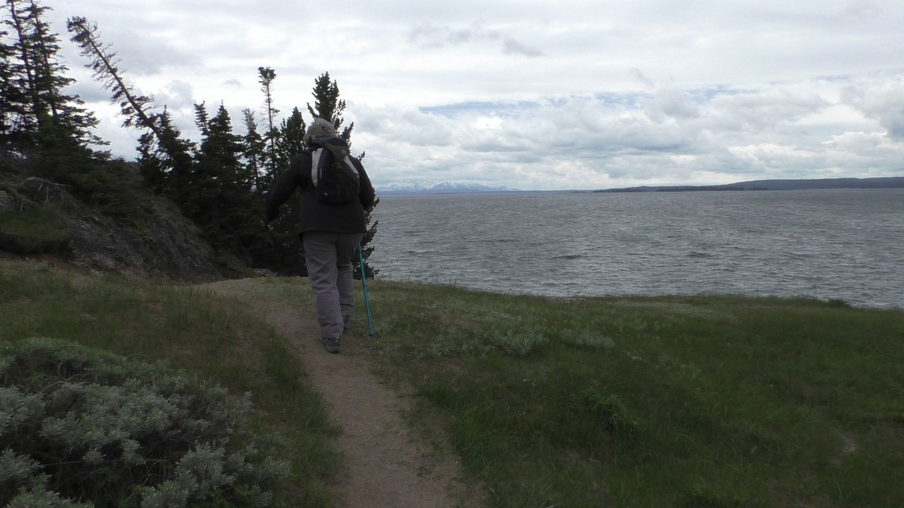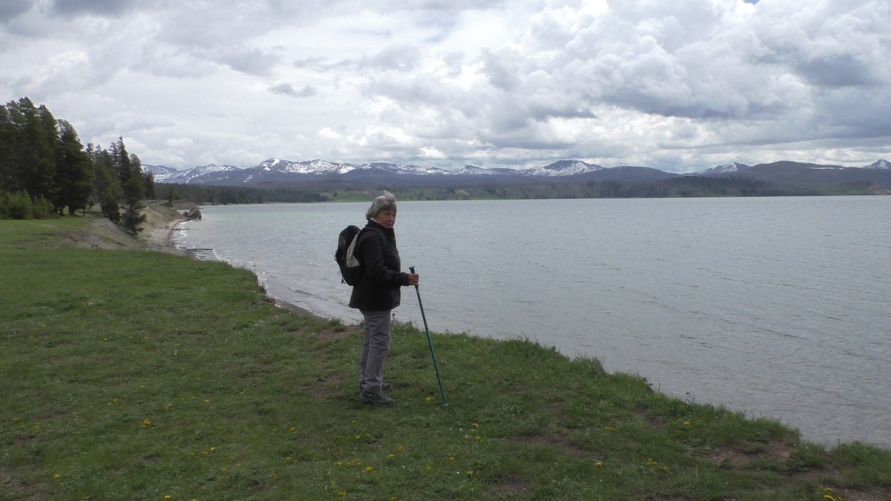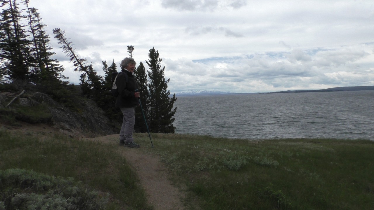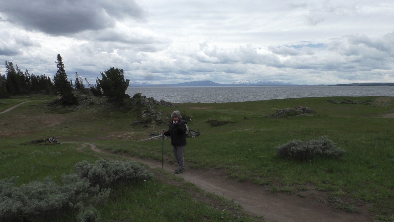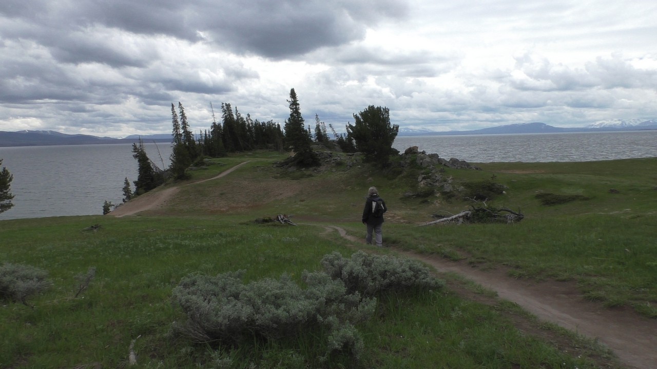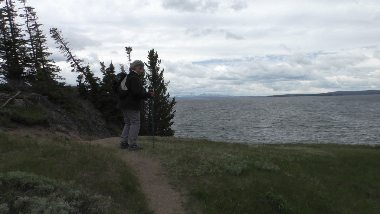 Na het ontbijt met uitzicht gaan we verder en nog dieper het park in. De bergen met witte toppen worden steeds zichtbaarder en we komen ook steeds dichterbij. We zitten dan ook al op 8000ft. (2438meter) hoog.We hebben een hike gezien die richting het meer van Yellowstone zou gaan, het heet StormPoint, nou dat klopt, het waaide daar flink. Op de wandelkaart stond dat hier veel beren zouden kunnen zitten, dus er werd nog extra gewaarschuwd. Wij zijn ze (helaas) niet tegengekomen. Wel weer een paar bizons, maar inmiddels hebben we er zoveel gezien dat we ze niet eens meer op de foto/video zetten en zijn ook gestopt met tellen.