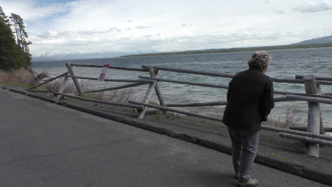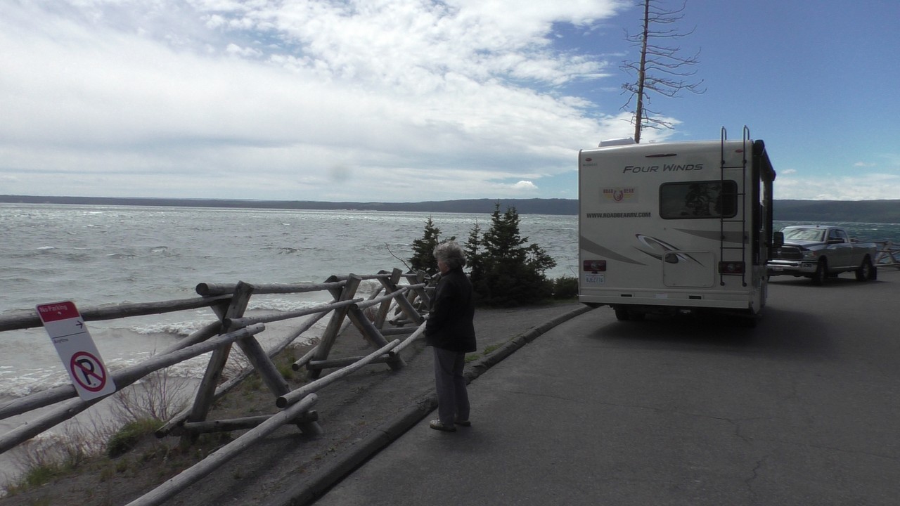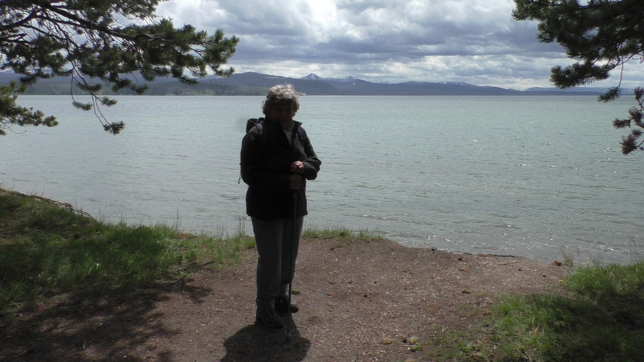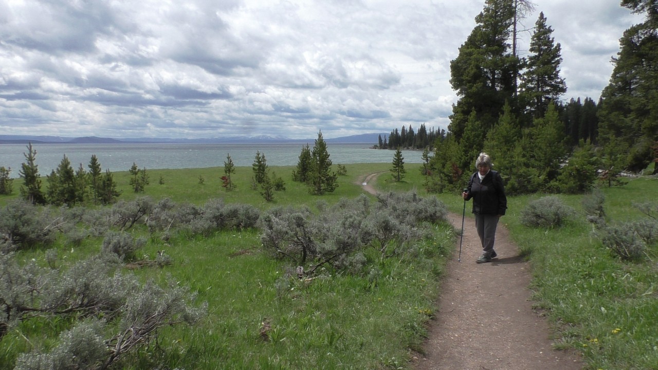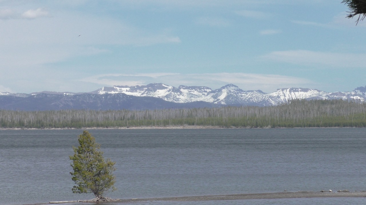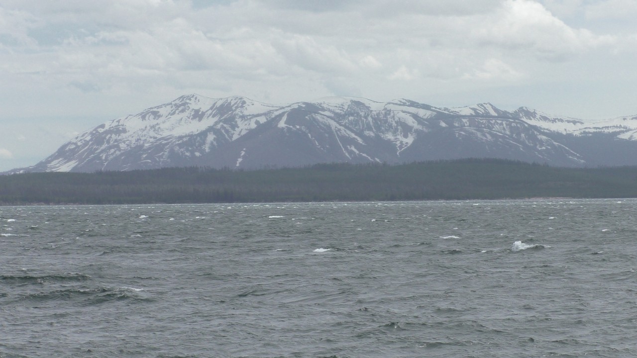 Na het ontbijt met uitzicht gaan we verder en nog dieper het park in. De bergen met witte toppen worden steeds zichtbaarder en we komen ook steeds dichterbij. We zitten dan ook al op 8000ft. (2438meter) hoog.We hebben een hike gezien die richting het meer van Yellowstone zou gaan, het heet StormPoint, nou dat klopt, het waaide daar flink. Op de wandelkaart stond dat hier veel beren zouden kunnen zitten, dus er werd nog extra gewaarschuwd. Wij zijn ze (helaas) niet tegengekomen. Wel weer een paar bizons, maar inmiddels hebben we er zoveel gezien dat we ze niet eens meer op de foto/video zetten en zijn ook gestopt met tellen.