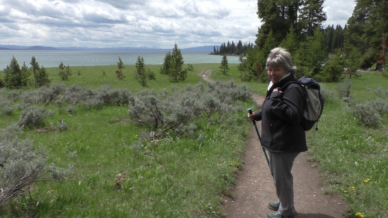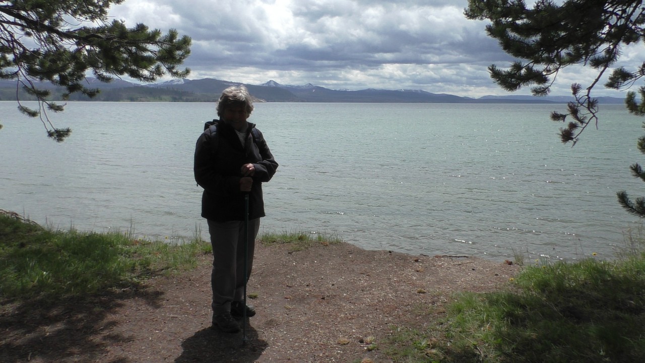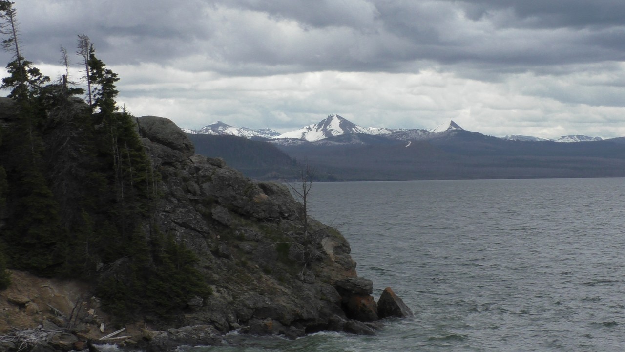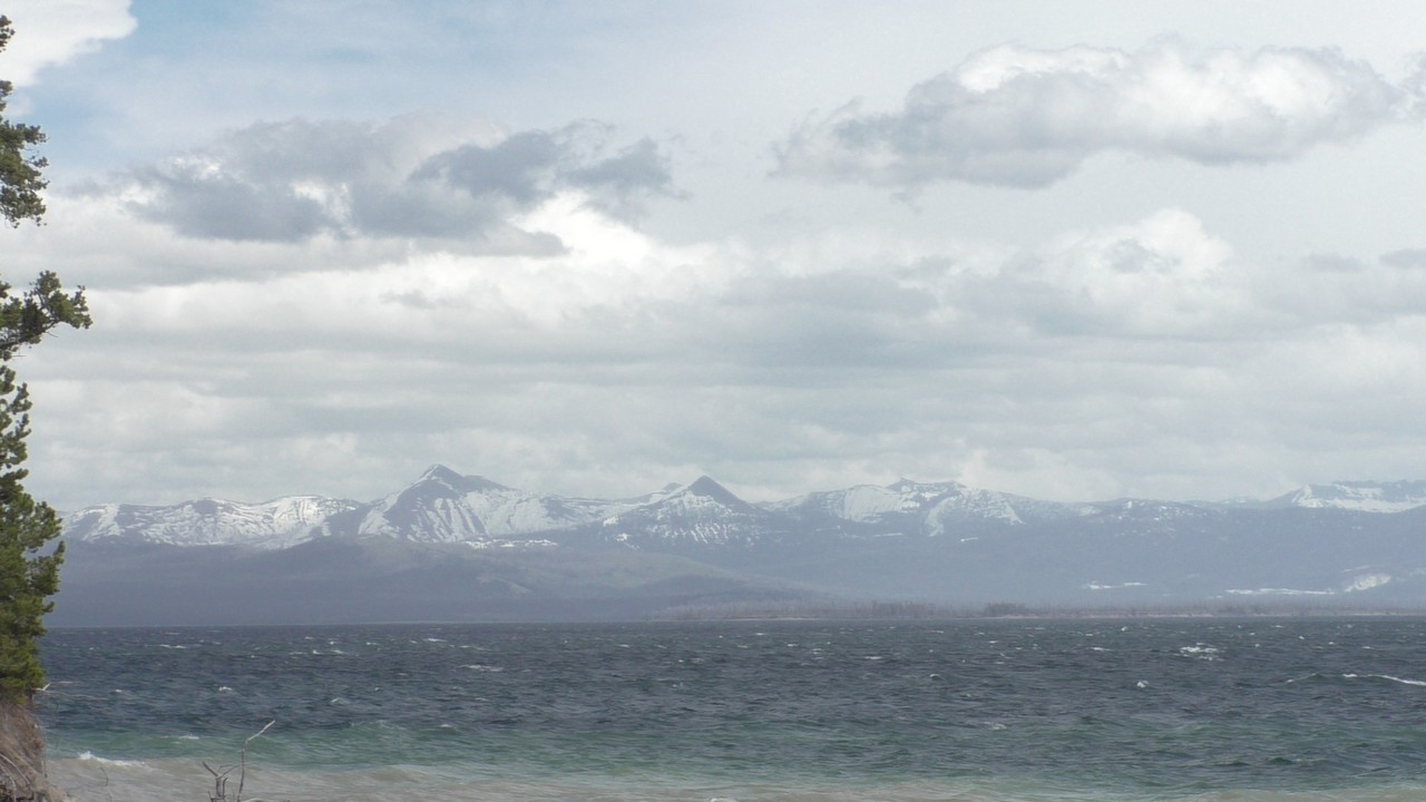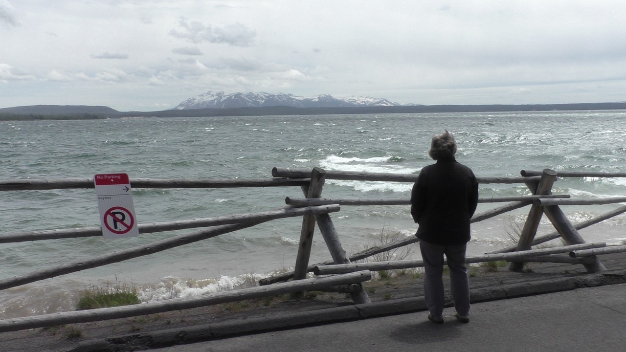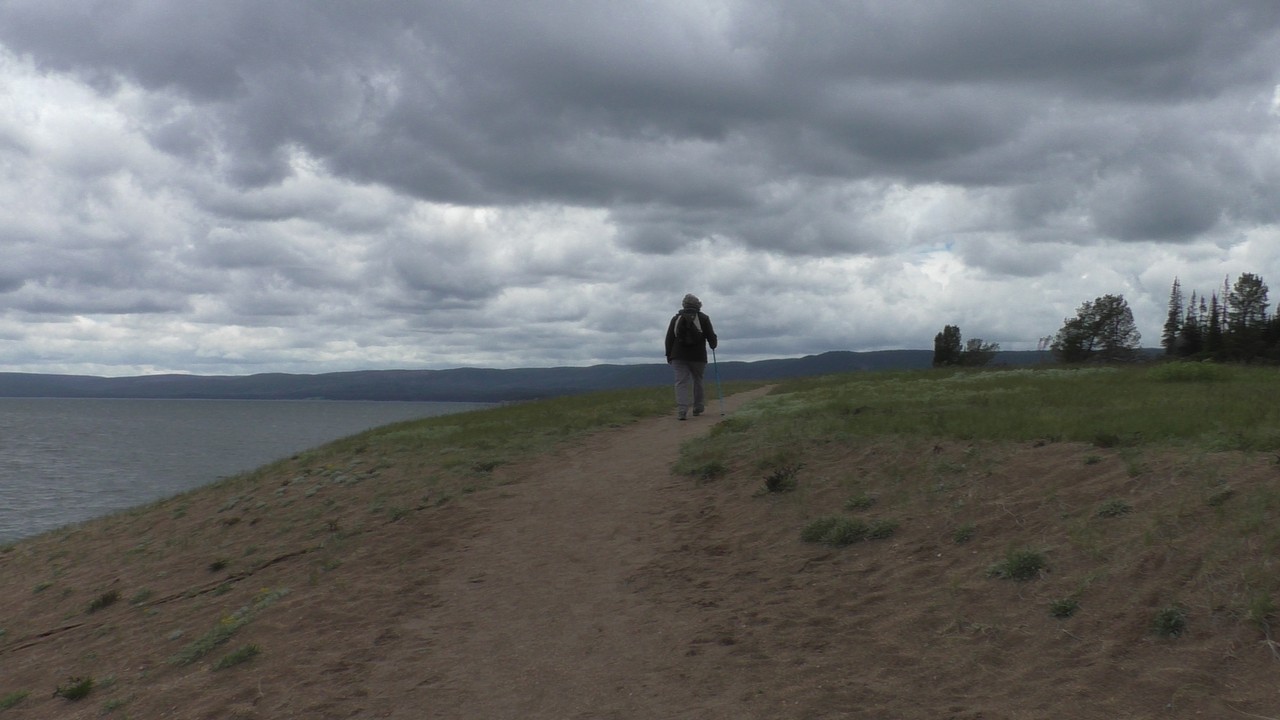 Na het ontbijt met uitzicht gaan we verder en nog dieper het park in. De bergen met witte toppen worden steeds zichtbaarder en we komen ook steeds dichterbij. We zitten dan ook al op 8000ft. (2438meter) hoog.We hebben een hike gezien die richting het meer van Yellowstone zou gaan, het heet StormPoint, nou dat klopt, het waaide daar flink. Op de wandelkaart stond dat hier veel beren zouden kunnen zitten, dus er werd nog extra gewaarschuwd. Wij zijn ze (helaas) niet tegengekomen. Wel weer een paar bizons, maar inmiddels hebben we er zoveel gezien dat we ze niet eens meer op de foto/video zetten en zijn ook gestopt met tellen.