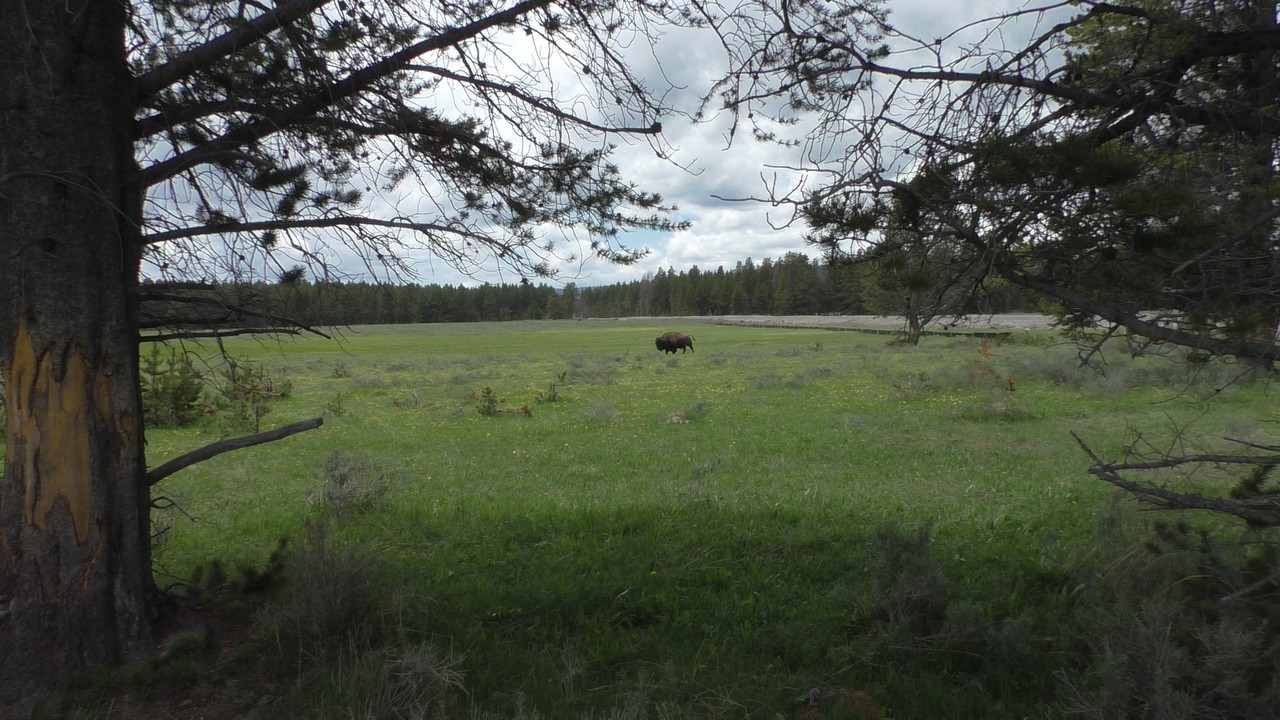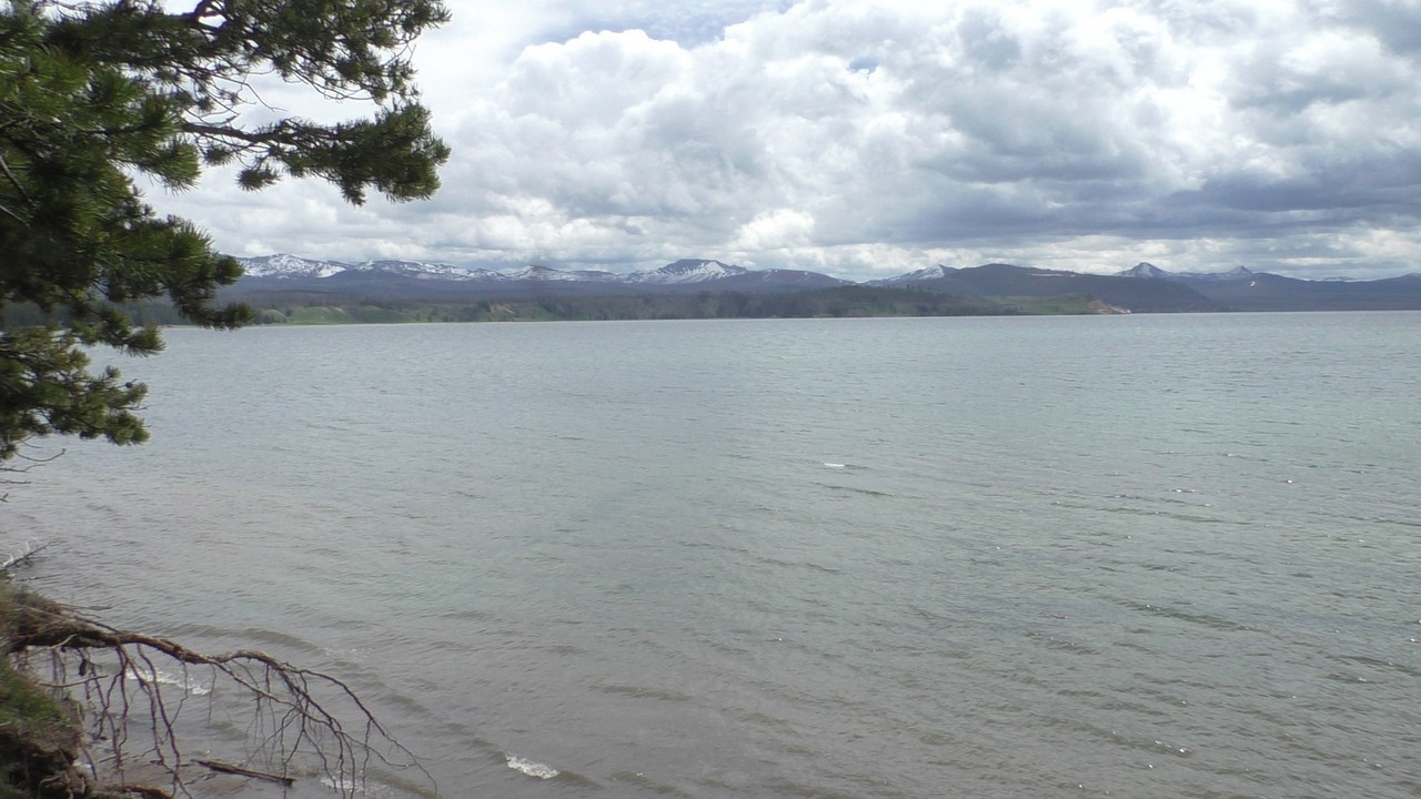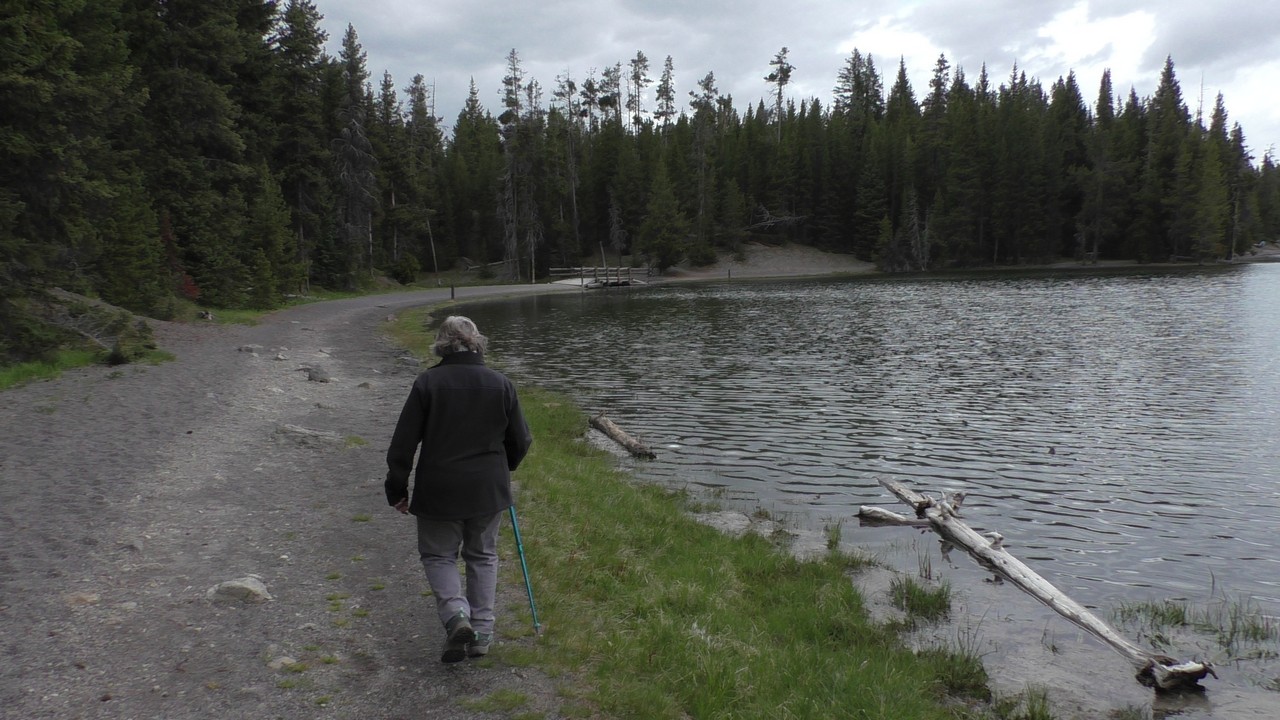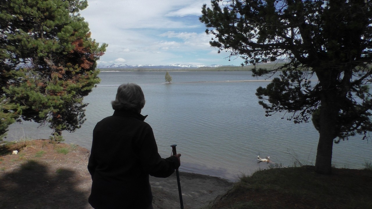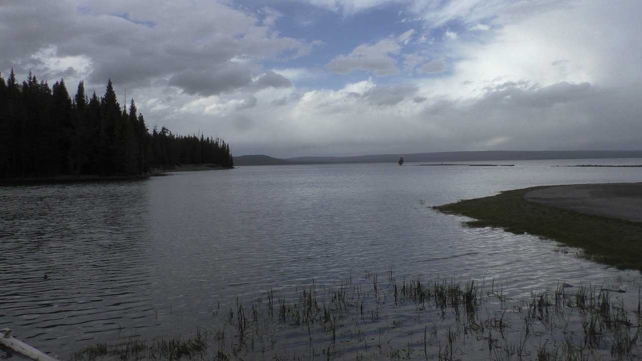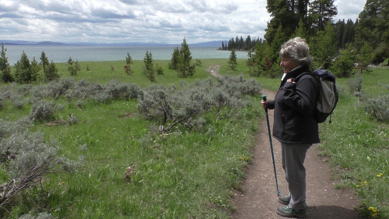Na het ontbijt met uitzicht gaan we verder en nog dieper het park in. De bergen met witte toppen worden steeds zichtbaarder en we komen ook steeds dichterbij. We zitten dan ook al op 8000ft. (2438meter) hoog.We hebben een hike gezien die richting het meer van Yellowstone zou gaan, het heet StormPoint, nou dat klopt, het waaide daar flink. Op de wandelkaart stond dat hier veel beren zouden kunnen zitten, dus er werd nog extra gewaarschuwd. Wij zijn ze (helaas) niet tegengekomen. Wel weer een paar bizons, maar inmiddels hebben we er zoveel gezien dat we ze niet eens meer op de foto/video zetten en zijn ook gestopt met tellen.