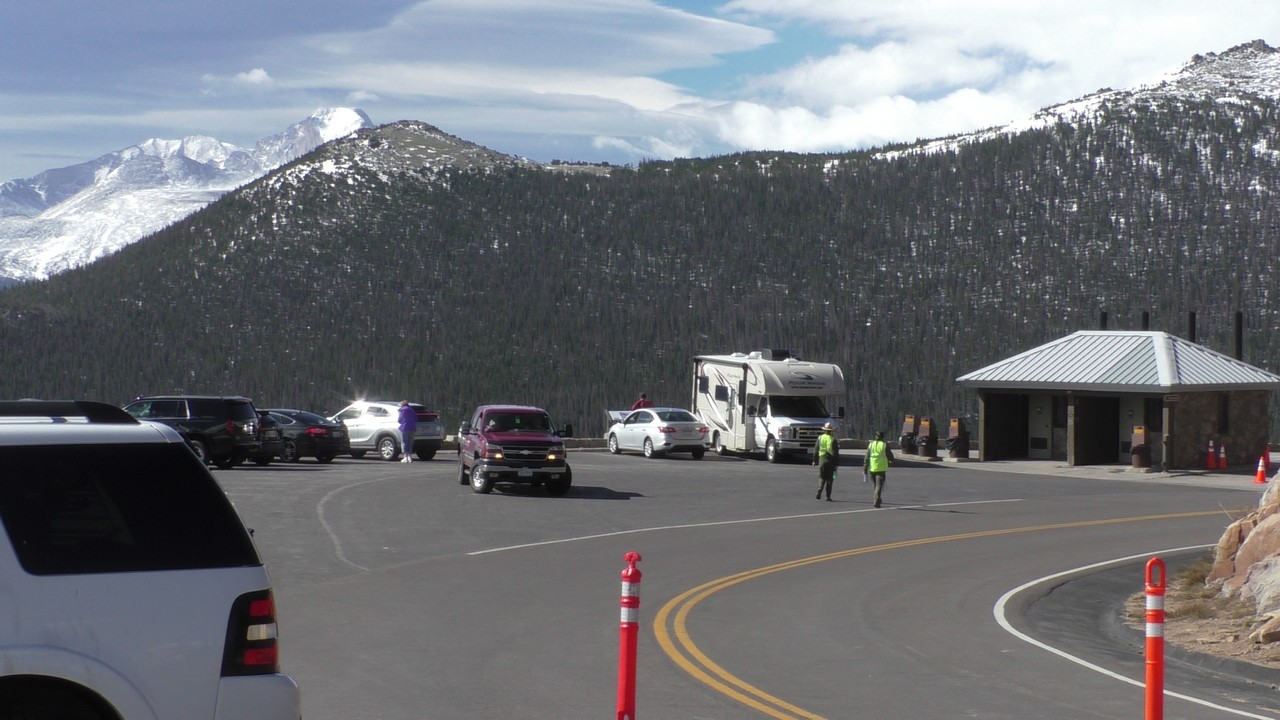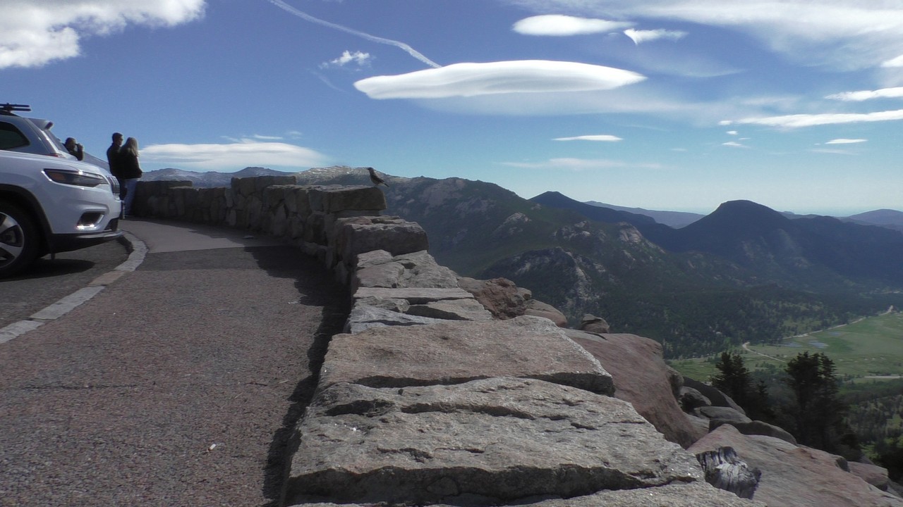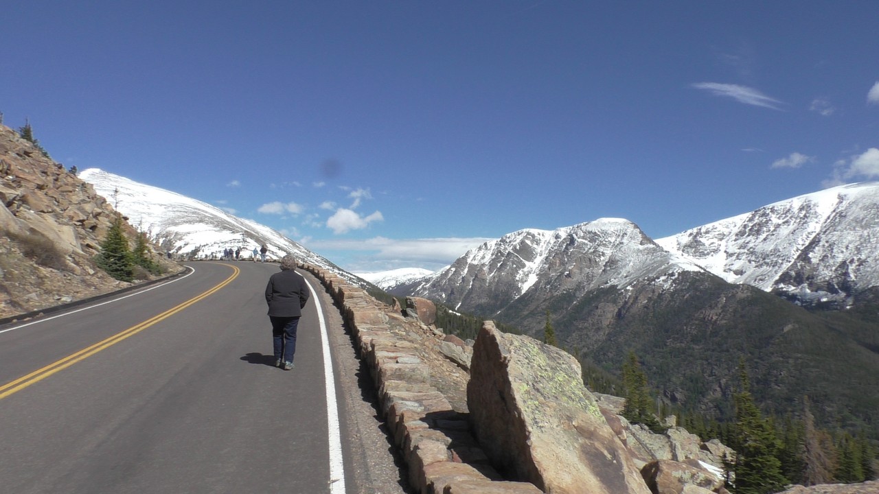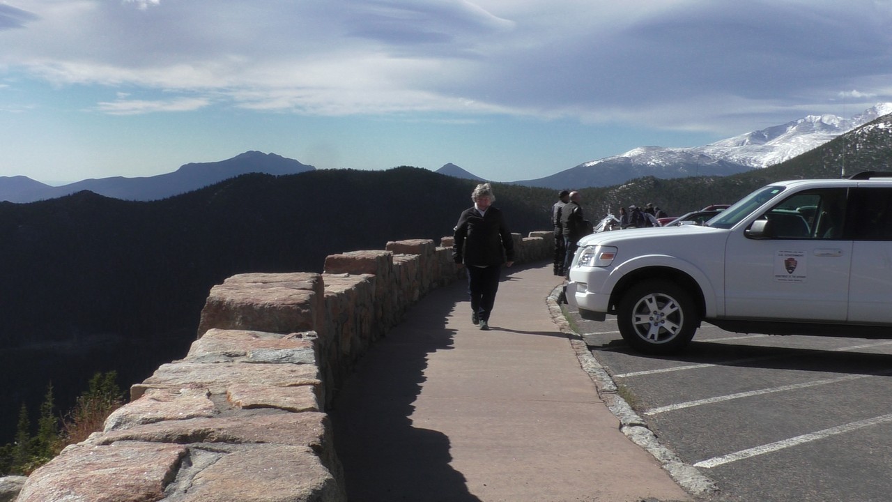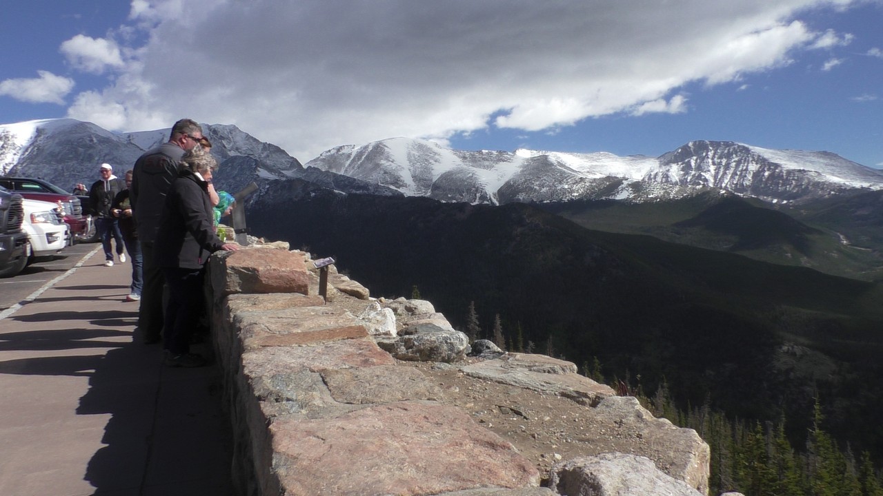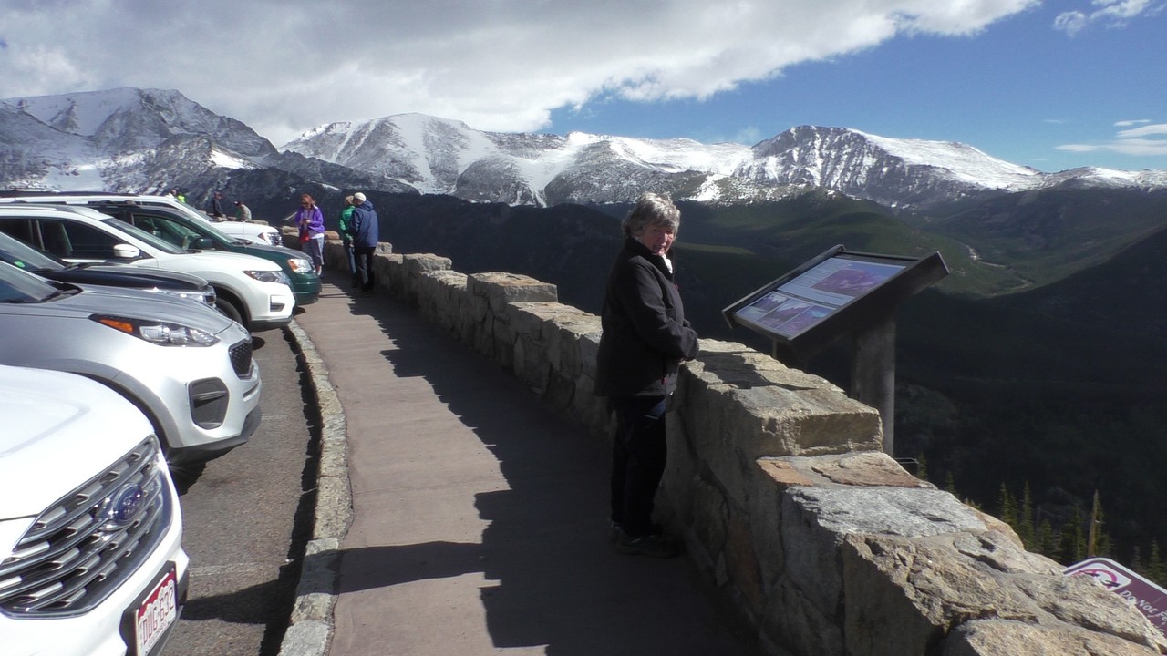 Vandaag willen we dan hopelijk de Trail Ridge Road doen en dan tot Alpine Visitor Center dat op 12183ft (3713m) ligt. Er is een hotline wat gebeld kan worden om te horen of de weg open is, maar helaas hebben wij op de camping geen bereik. Dus dan maar op goed geluk. We gaan richting het kruispunt waar het gisteren nog dicht was, en de slagbomen staan open, dus we hebben geluk. Langzaam stijgt de weg en we hebben de ene na de andere haarspeldbocht en super mooie uitzichten. We naderen Rainbow Curve, dat op 10.000 ft (3048meter) ligt,daar zou je een indrukwekkend uitzicht hebben over de vallei, het is er nog niet druk dus we vinden makkelijk een parkeerplek. Helaas zijn we iets verder een bord staan waarop staat dat de rest van de weg nog afgesloten is i.v.m. sneeuwschuifwerkzaamheden. Bij navraag of de weg op korte termijn opengaat krijgen we het antwoord : “misschien wel, maar misschien ook niet” , dus echt veel wijzer worden we er niet van. Het wordt ook steeds drukker op de parkeerplaats en iedereen wordt uiteindelijk gelijk teruggestuurd. De parkeerplaats is vol, wij blij dat we op tijd waren.