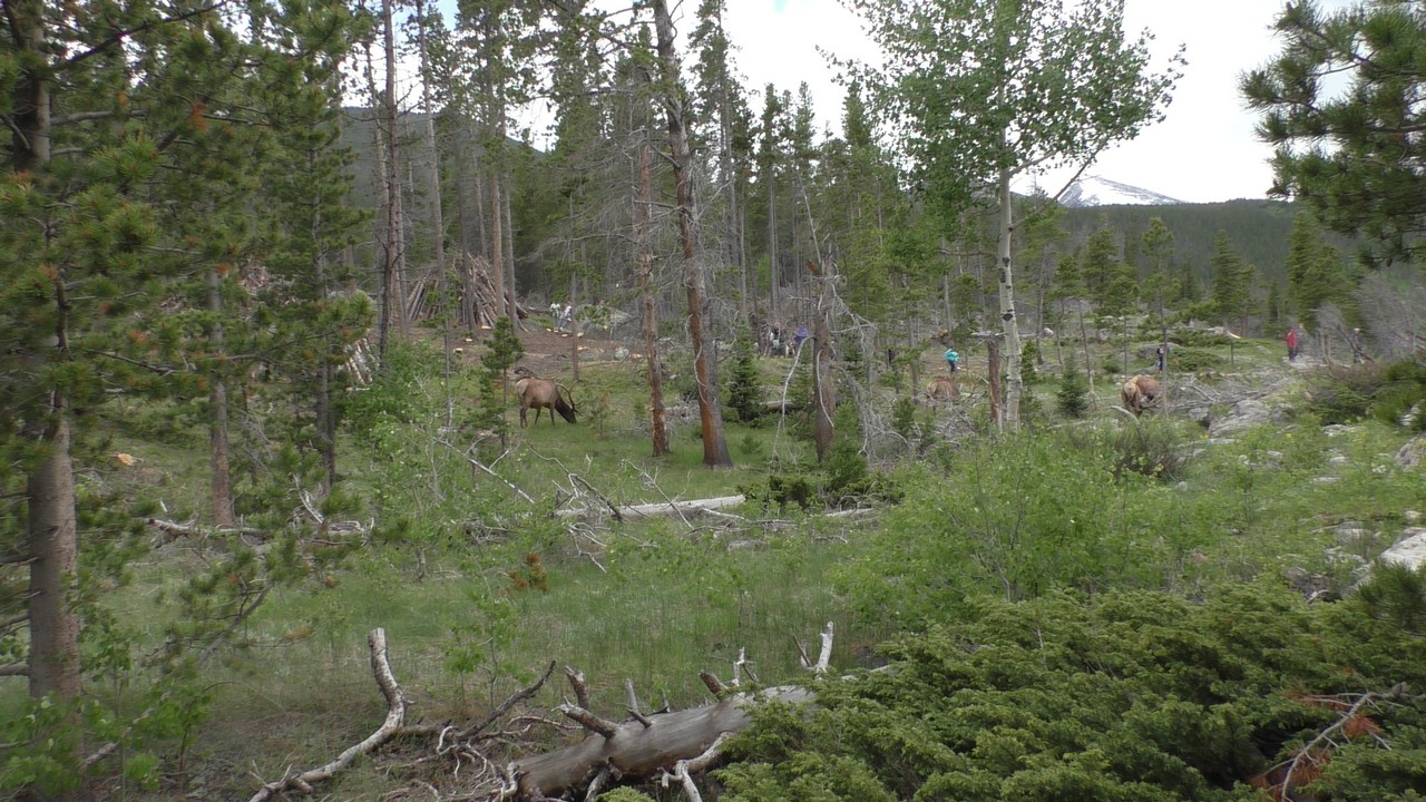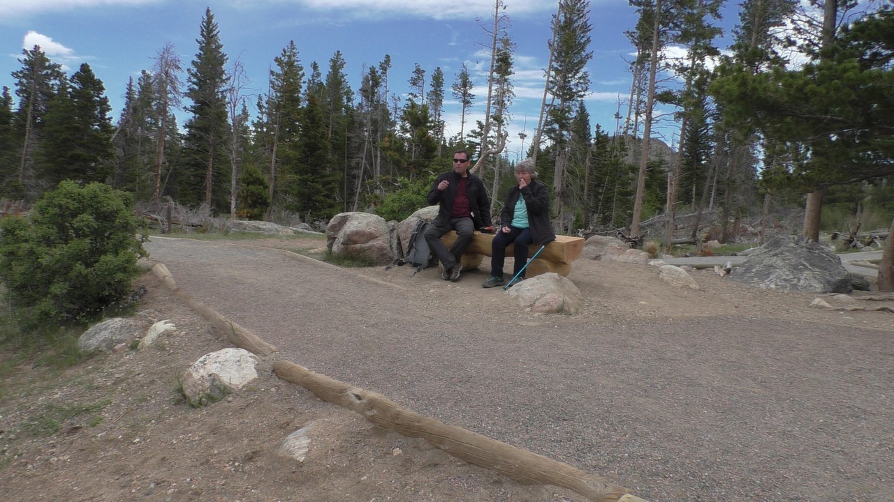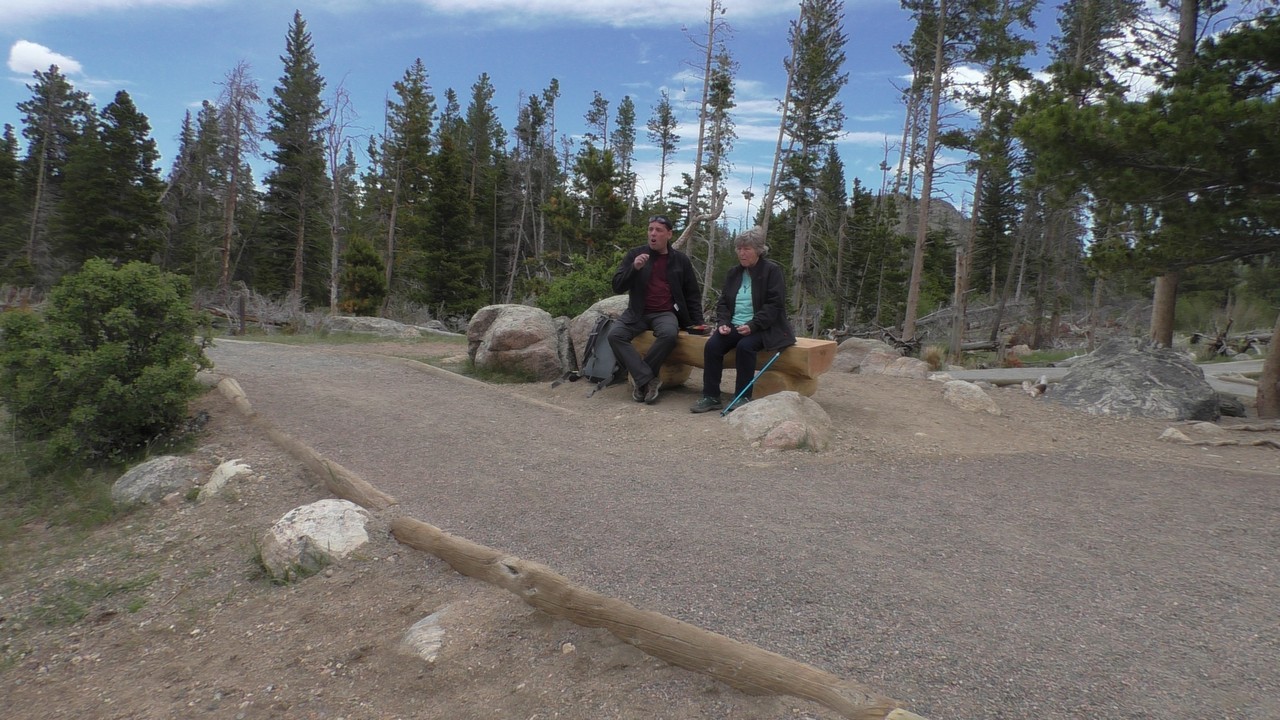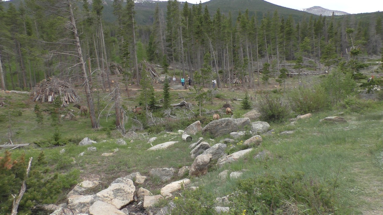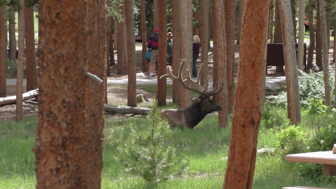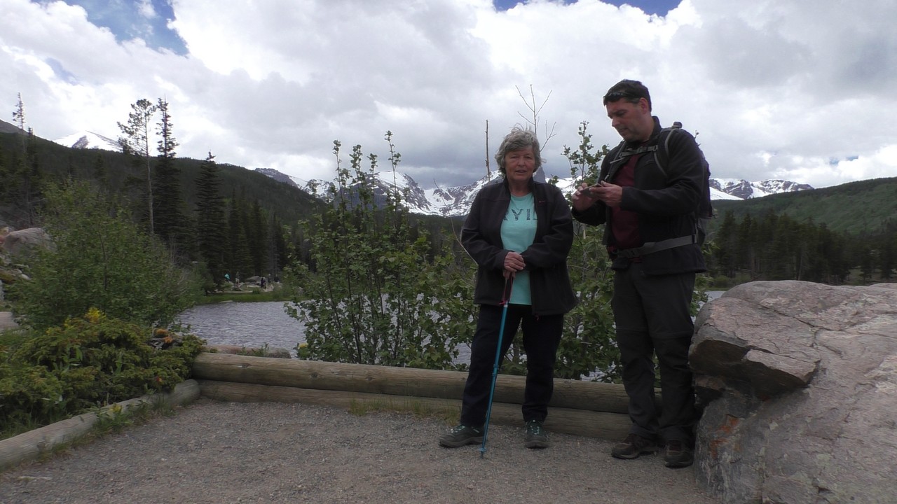 We rijden via een Fall River terug naar Estes Park, om vanuit daar weer terug te rijden naar Glacier Basin. Onderweg nog even een tussenstop voor een heerlijk cappuccino. We besluiten om terug te rijden naar de camping. Vanaf de camping start er ook een trial naar Spraque Lake, vandaag is het prachtigste weer van de wereld, waar we gisteren liepen met muts en hadden we sneeuw, lopen we nu in een T-shirt en hebben we zonnecrème op gedaan. Het is een mooie hike naar het meertje, waar je ook nog omheen kan lopen en waar je schitterend uitzicht heb op wit besneeuwde toppen. Op de terugweg lopen we nog tegen 4 Elanden aan, dus die eerst maar de ruimte gegeven en vervolgens ze op de foto/video gezet.
