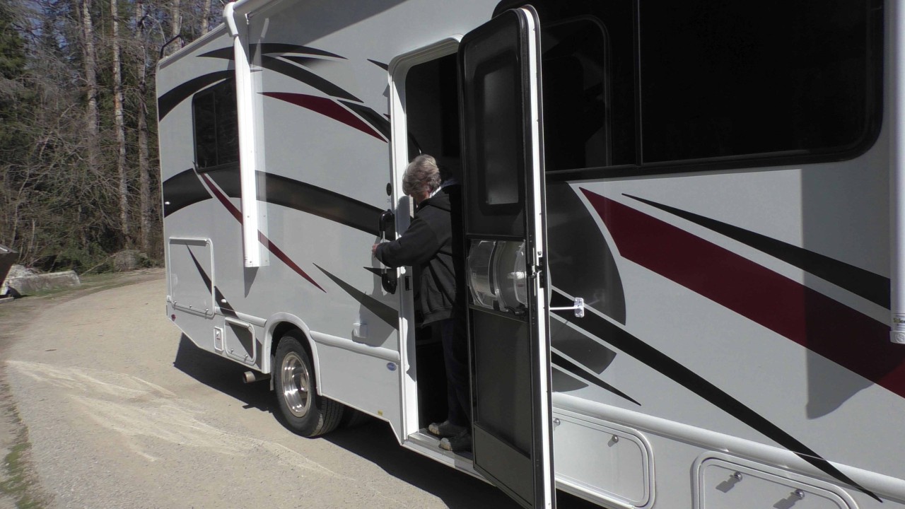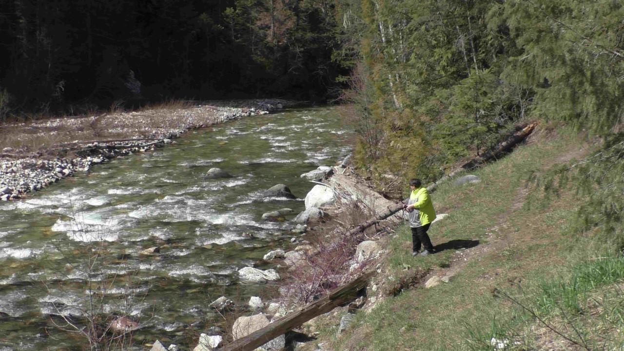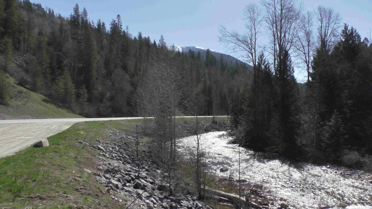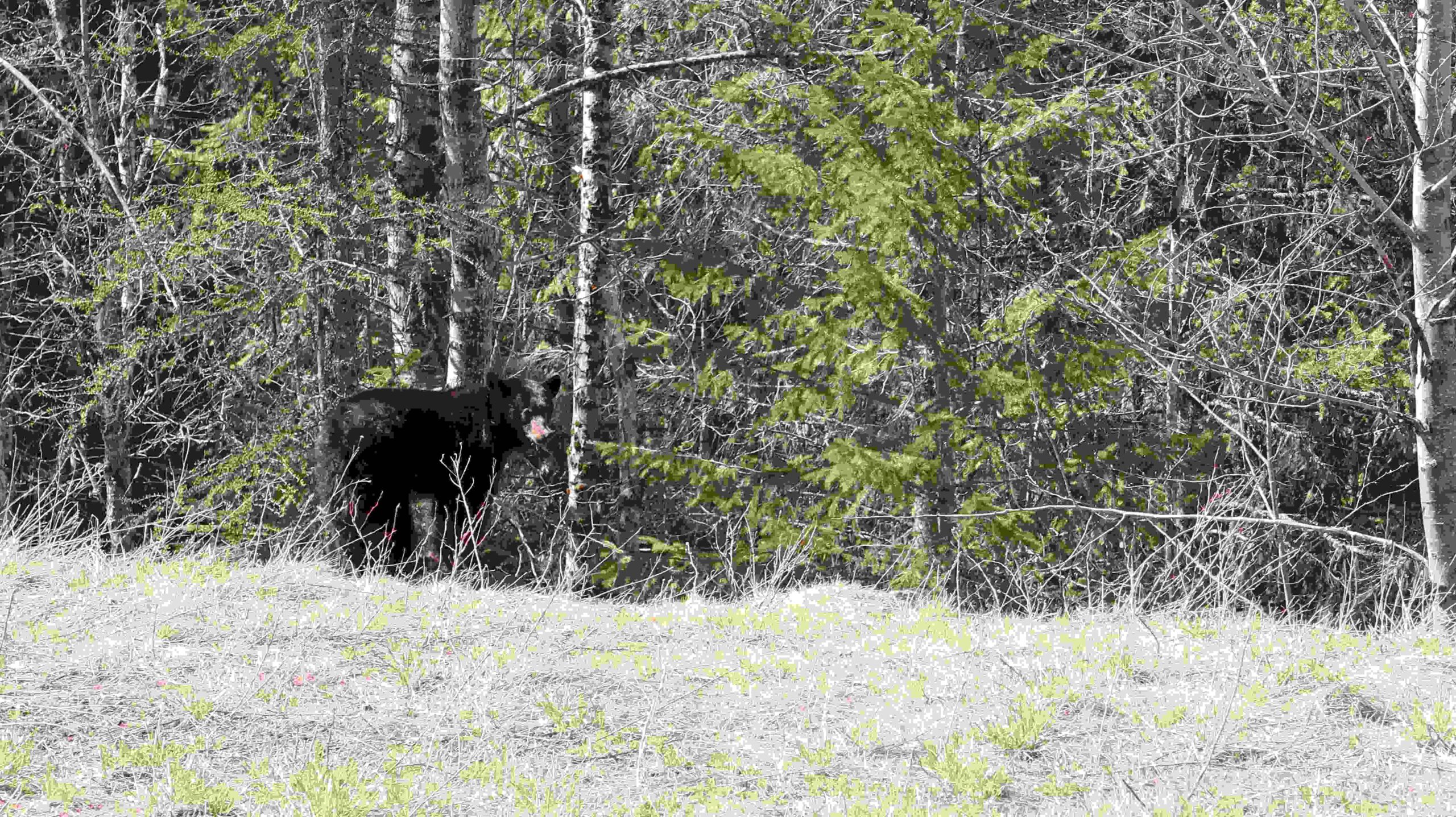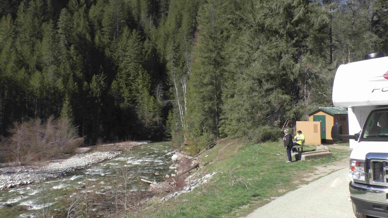 We hebben een goede keus wat betreft koffiepauze en zo ook nu weer. Een parkeerplaats naast het riviertje. Er stopt een ouder echtpaar en er staat maar 1 bank. Wij hebben stoelen bij ons dus we delen de bank en raken aan de praat. De vrouw komt met eigen gebakken koekjes aan, ze was net bij haar zus op bezoek geweest, die was 100 geworden en woonde in Cranbrook. Het echtpaar was nu weer onderweg naar huis in Victoria op Vancouver Island. We bieden het echtpaar een bakkie koffie aan. Toch leuk om zo je pauze door te brengen. Na een uurtje wensen we het echtpaar een goede en veilige reis toe en wij gaan ook weer verder. De landschap blijft geweldig en ineens……………………… aan de rechterkant van de weg in de berm op 20 meter van het voertuig staat een BEER en kijkt ons een beetje droelig aan. Na de nodige foto’s en filmpjes te hebben gemaakt gaan we door en ook de beer kijkt ons na als we wegrijden.
