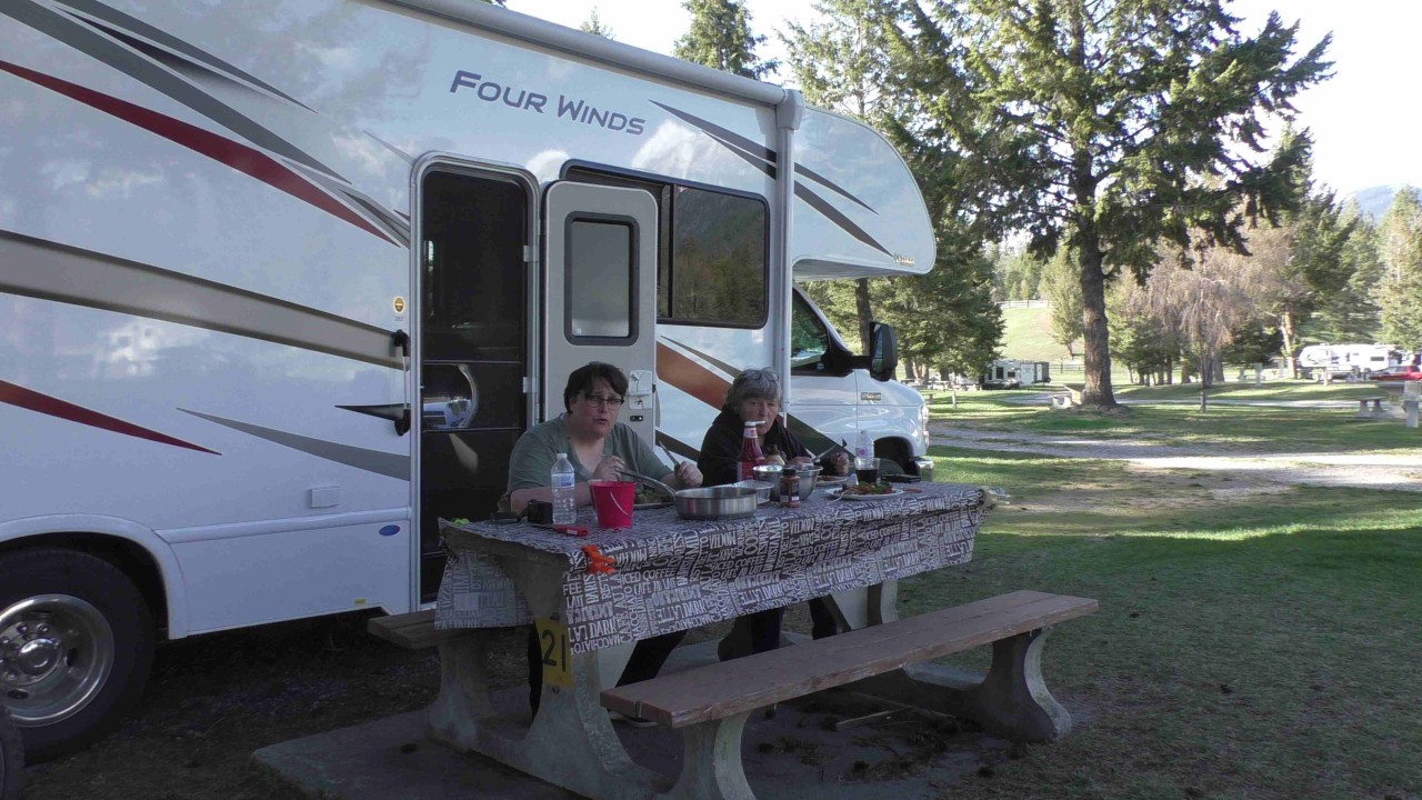We stoppen in Cranbrook even bij de Walmarkt voor wat laatste inkopen en rijden door naar onze camping in Fort Steele. Dit zou een oud western stadje zijn, die we morgenvroeg nog even gaan bezoeken. We staan op de camping met uitzicht op een paar flinke bergen waar op de top nog genoeg sneeuw ligt. Ook hebben we zicht op een nest met 2 visarenden. De camping heeft ook een weide met een aantal paarden, die naar je toe komen als je aan het hek staat. Dus Laura en Sterre echt iets voor jullie.