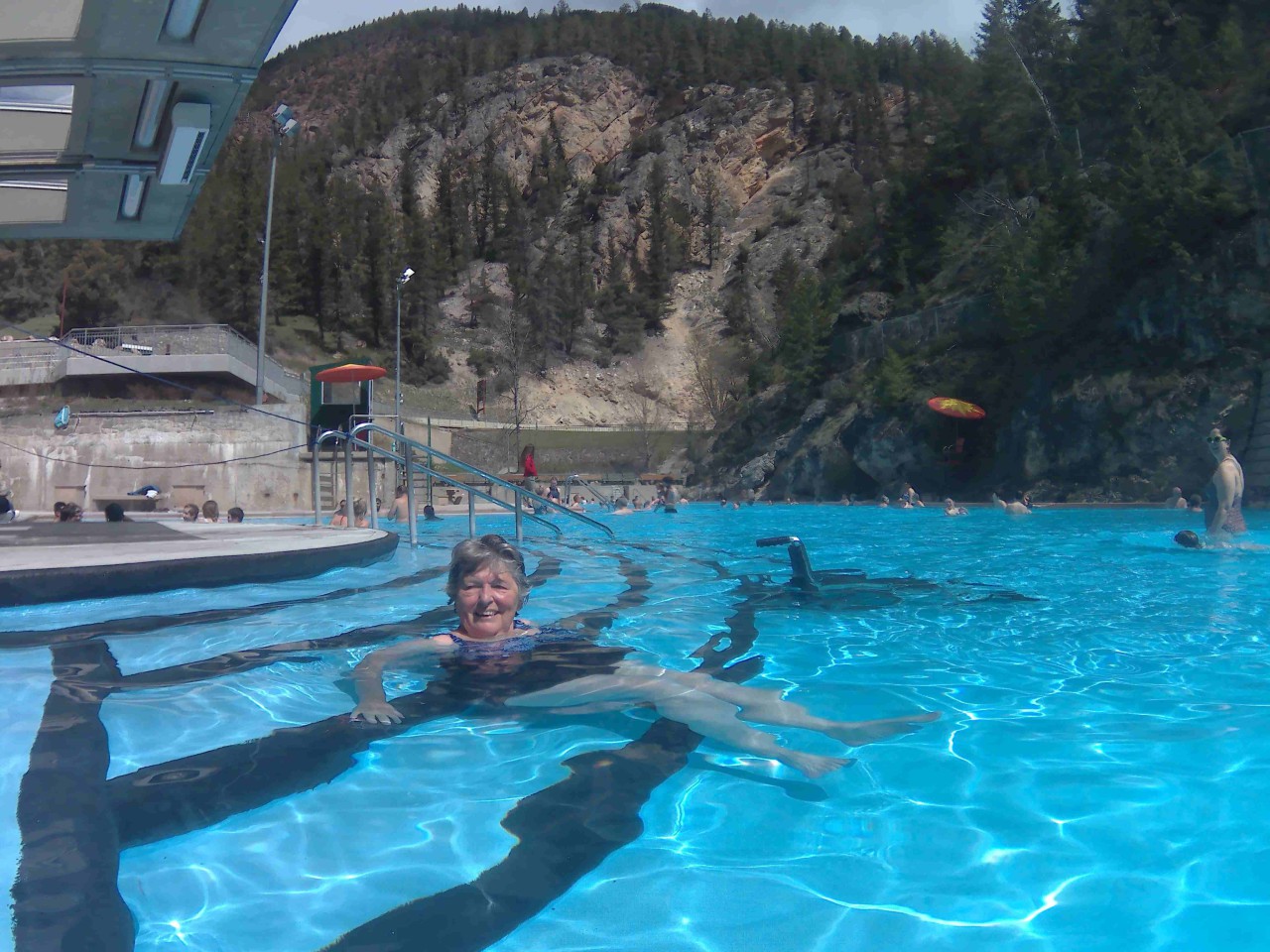 Er loopt een trail (sorry een voetpad) vanuit de camping naar het zwembad. De hike (wandeltocht) zal een kleine 2.3 km moeten zijn en er zitten wat stijgingen en dalingen in, maar zou over het algemeen goed te doen moeten zijn. Dus de wandelschoenen aan, de rugzak op en we gaan ervoor. Het is inderdaad goed te lopen en na 45 minuten komen we aan bij het zwembad. We kopen een kaartje en kleden ons om en ohhhh wat is dat water warm (en lekker). Aan de rand in het zwembad hebben ze een soort van banken gemaakt zodat je gewoon lekker kan zitten in het water. Buiten is het nog wel fris, want je ziet de damp boven het water hangen, dus zorgen dat je gewoon onder water blijft.
