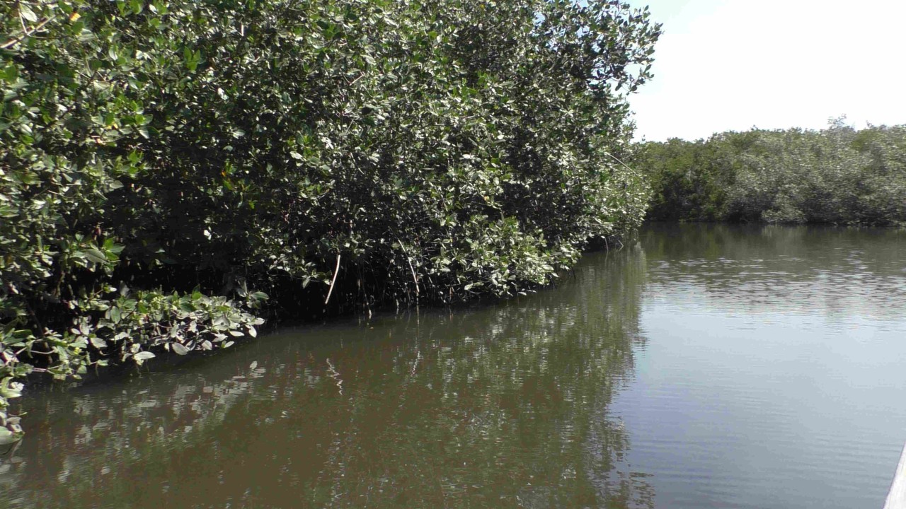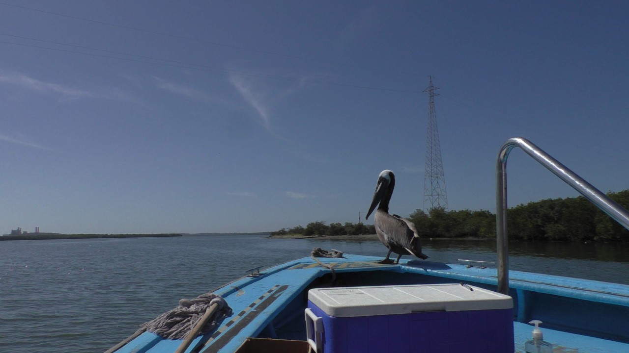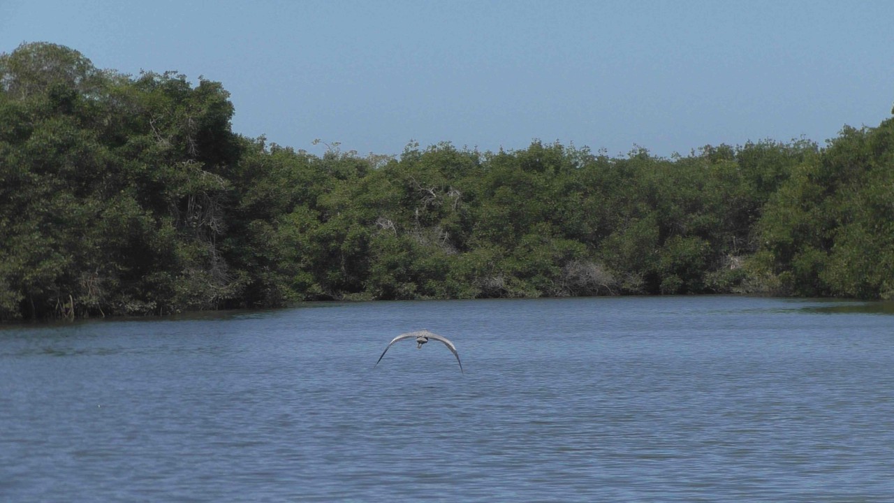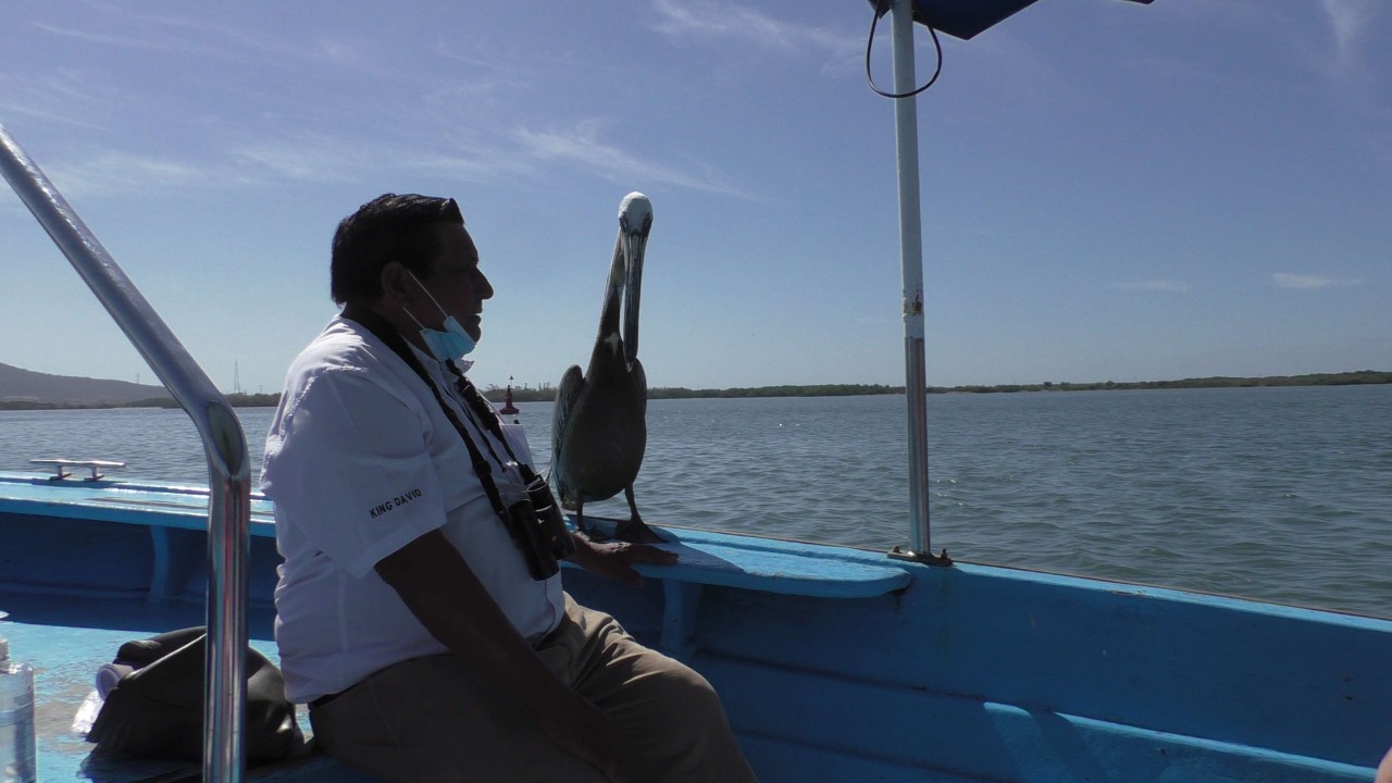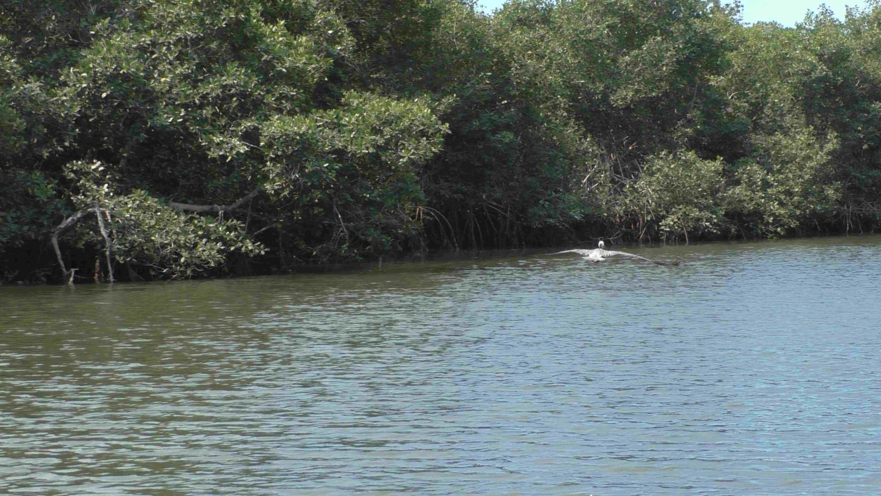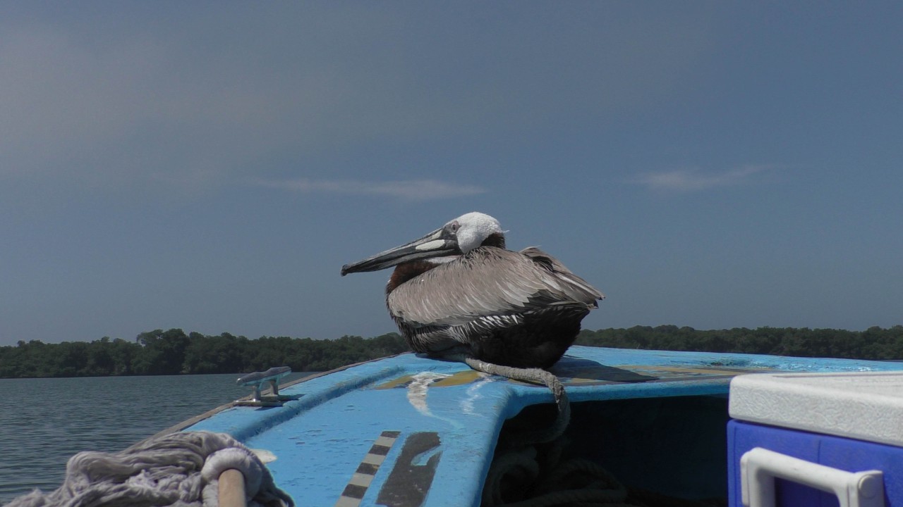 Er staat weer een bus voor ons klaar, maar de rit is maar kort, na 10 minuten staan wij bij het bootje waarmee we de mangroves in gaan. Onze gids, die voor zijn pensionering piloot is geweest op een privéjet, heeft er plezier in om ons wat te vertellen over de streek en de wildlife die hier is. Ook is zijn Engels goed en krijgen we daardoor elke keer een mooi verhaal te houden. Hij zit vol met grapjes en grollen en de stemming is goed. Hij verteld dat hij een 3-tal pelikaan vrienden heeft en wellicht dat er straks iemand op bezoek komt……de boot ligt dubbel van het lachen, maar opeens vliegt er een pelikaan rondom de boot die daarna heel gemoedelijk op de boeg gaat zitten en is absoluut niet bang. Hij krijgt een visje van onze gids (schijnbaar gebeurt dit dus echt vaker) en de halve reis blijft hij als een soort boegbeeld op boot zitten. Hij bedelt niet om nog meer vis, maar blijft zitten totdat we de echte dichte mangroves binnenvaren, dan heeft hij genoeg gerust en vliegt rustig weg. Echt heel bizar en leuk.