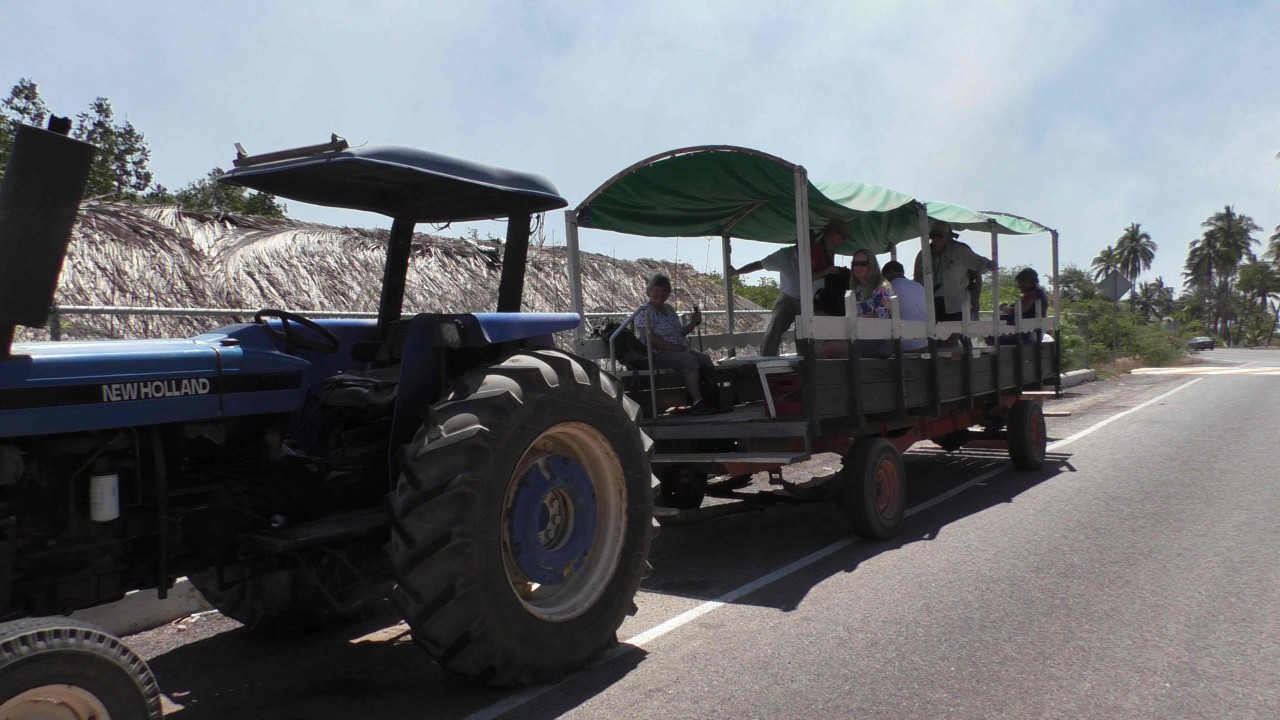 We zien onderweg een heleboel vogels, nogmaals het is niet mijn hobby om deze namen te onthouden dus wellicht kunnen jullie zelf kijken welke soorten erop de foto staan. We varen door de dichte mangroves en opeens is daar een steiger waar we stoppen en uitstappen. Aan de einde van onze steiger zou onze limousine op ons wachten……nou het is een geweldige limousine. We hebben gelukkig een mooi plekje voorin en als ik de geur ruik van de tractor en het hobbelen van de aanhanger denk ik terug aan mijn kind tijd, toen ik vanuit school vaak met Toon van Excel of Kees Meeren achterop de trekker van de (fruit)veiling naar huis ben gereden. (diegene die niet uit Ulvenhout komen, de veiling was vlakbij de basisschool).