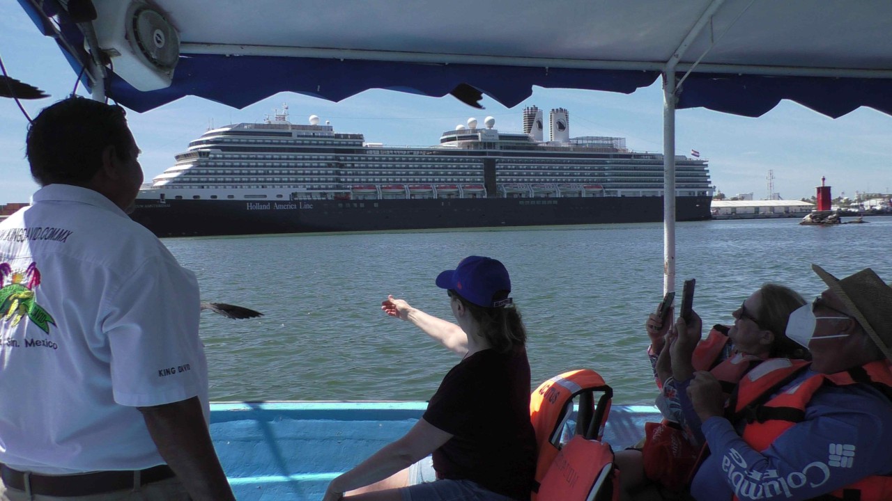 Wat stond er vandaag op het programma. Een bird watching expeditie. Nou een expeditie was het zeker. De kapitein had ons beloofd dat we om 09.00 uur zouden aankomen in de haven van Mazatlan en warempel hij kreeg het weer voor elkaar. Wel had hij een extra uur speling omdat we vannacht de klok een uur terug hebben moeten zetten.