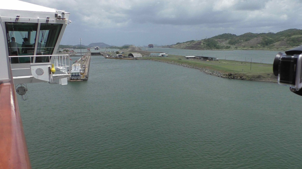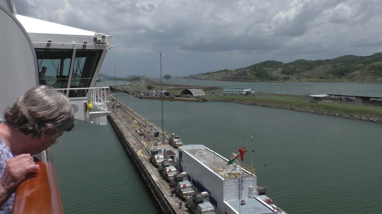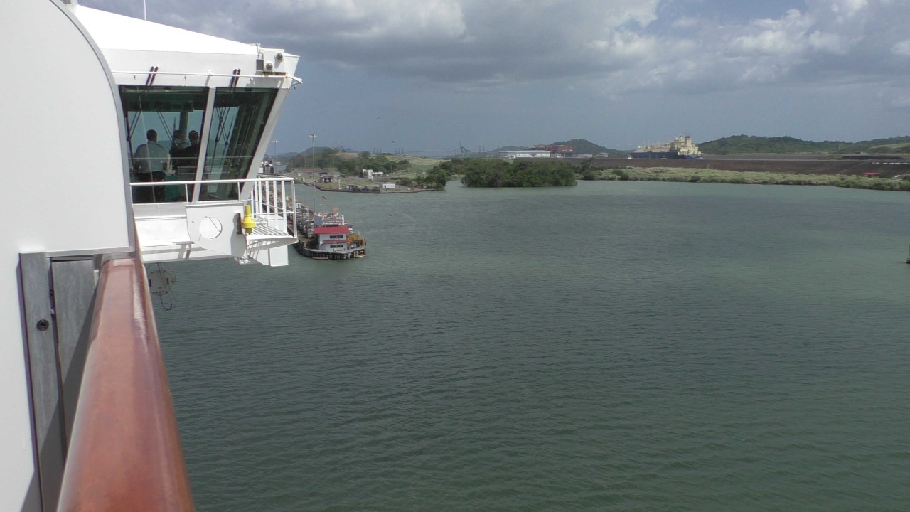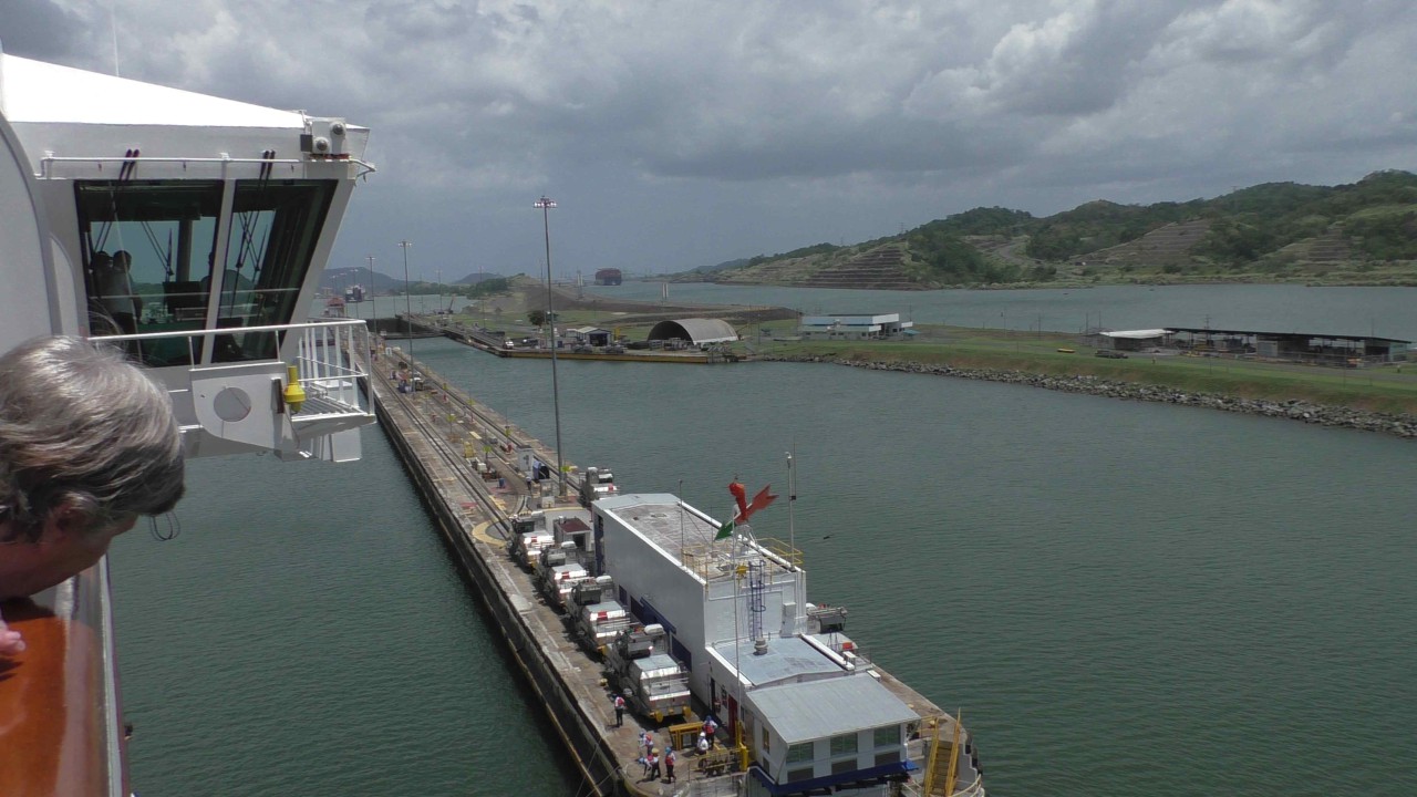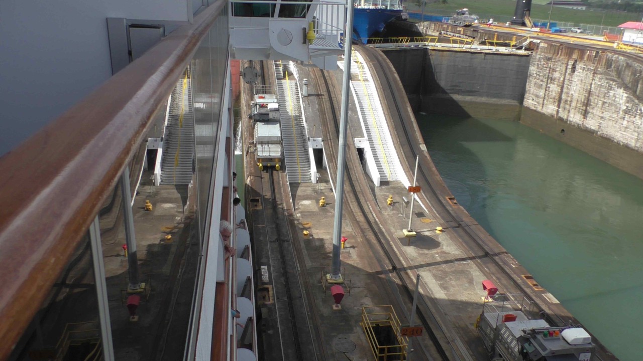 Met de koffie nog in ons hand snel terug naar de hut, want de kapitein heeft haast en we gingen dus al eerder de sluizen in. Wij gaan de sluizen van het “oude” panamakanaal nemen, de nieuwere zijn grotere en kunnen ook grotere schepen schutten. De New Amsterdam is een schip dat nog in de oude sluizen past. Wel zo leuk, want hier heb je die wel bekende locomotieven die het schip in positie houden en voorttrekken door de sluizenkamers.
