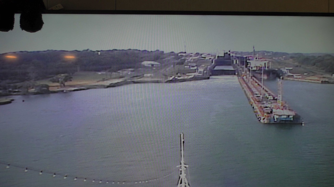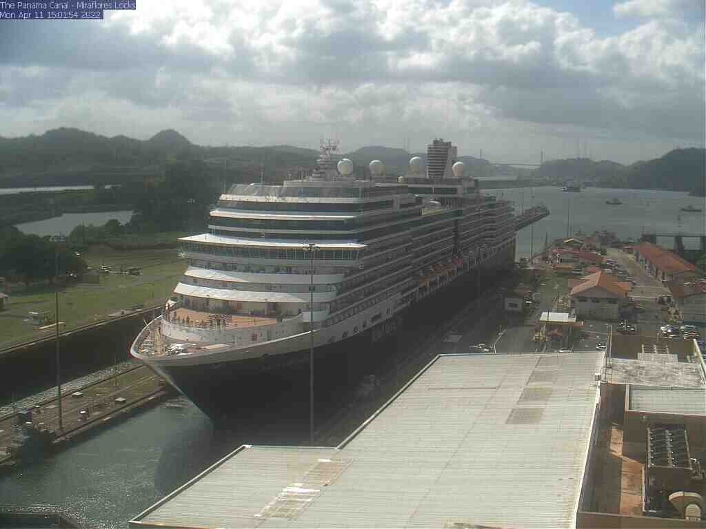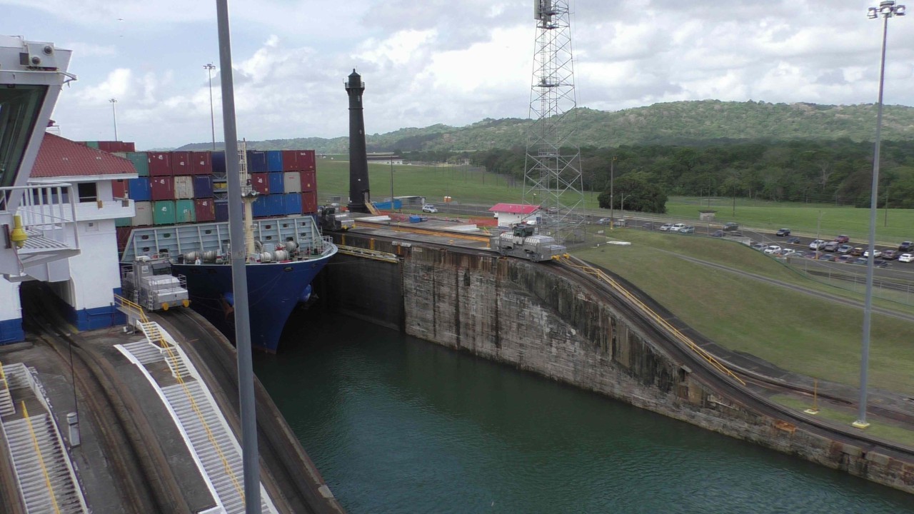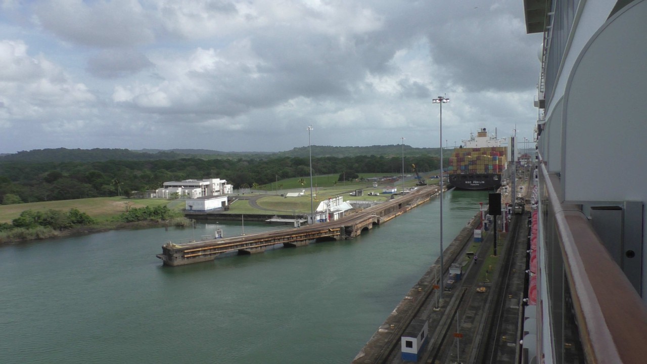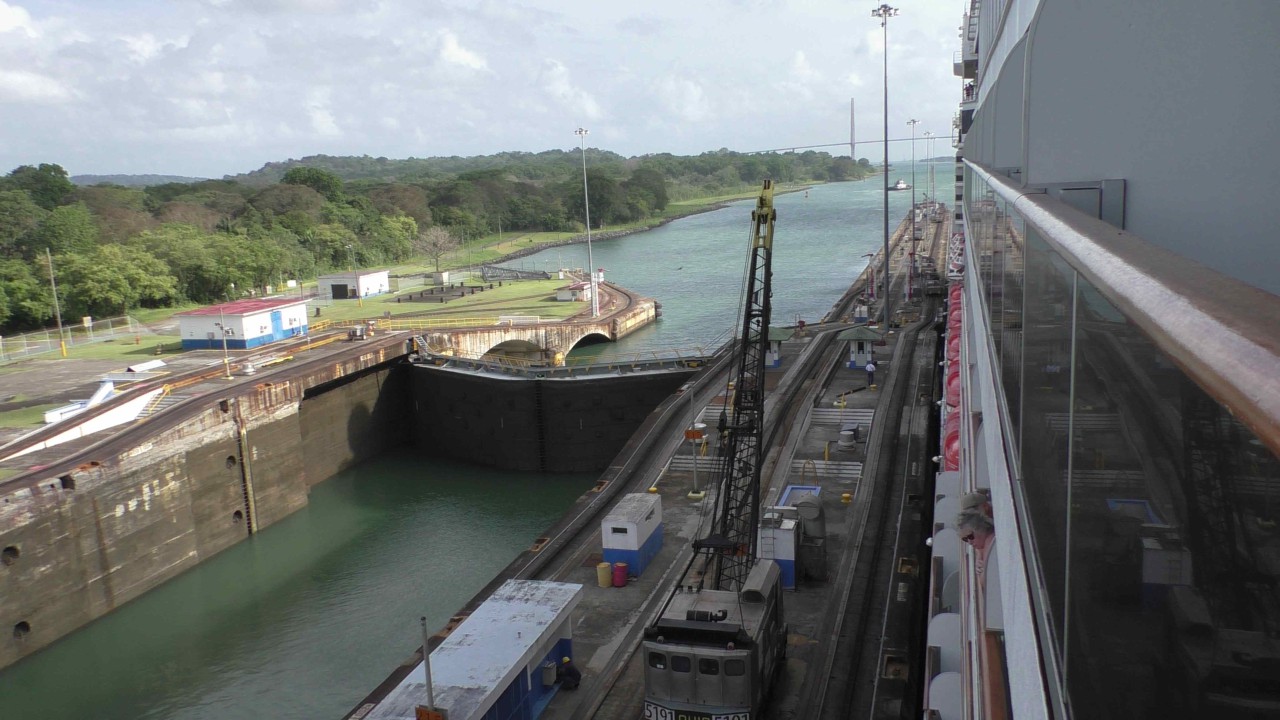 Met de koffie nog in ons hand snel terug naar de hut, want de kapitein heeft haast en we gingen dus al eerder de sluizen in. Wij gaan de sluizen van het “oude” panamakanaal nemen, de nieuwere zijn grotere en kunnen ook grotere schepen schutten. De New Amsterdam is een schip dat nog in de oude sluizen past. Wel zo leuk, want hier heb je die wel bekende locomotieven die het schip in positie houden en voorttrekken door de sluizenkamers.
