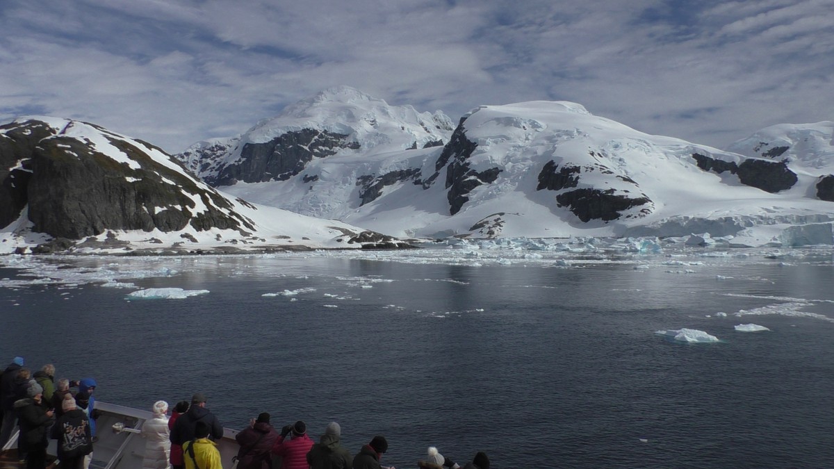 We varen CharlotteBay weer uit richting de Garlache Strait om dan de Wilhelminabay aan te doen. Helaas hier ligt te veel IJs dus kunnen we er niet invaren en als alternatief nemen we de afslag naar Cuverville Island. Daar zijn we een grote Pinguïns kolonie, we zien 2 kleine expeditie schepen liggen en spotten tussendoor ook nog een paar walvissen. We varen nu heel langzaam verder deze baai in en de kapitein maneuvreert ons tussen alle IJsschotsen door tot bijna in de pinguïns colonie, nou ja bij wijze van spreken dan…….er was nog genoeg ruimte over. De zon schijnt ook nu vol en daardoor krijgt de hele omgeving een adembenemend uitzicht. Het is net een postcard.
