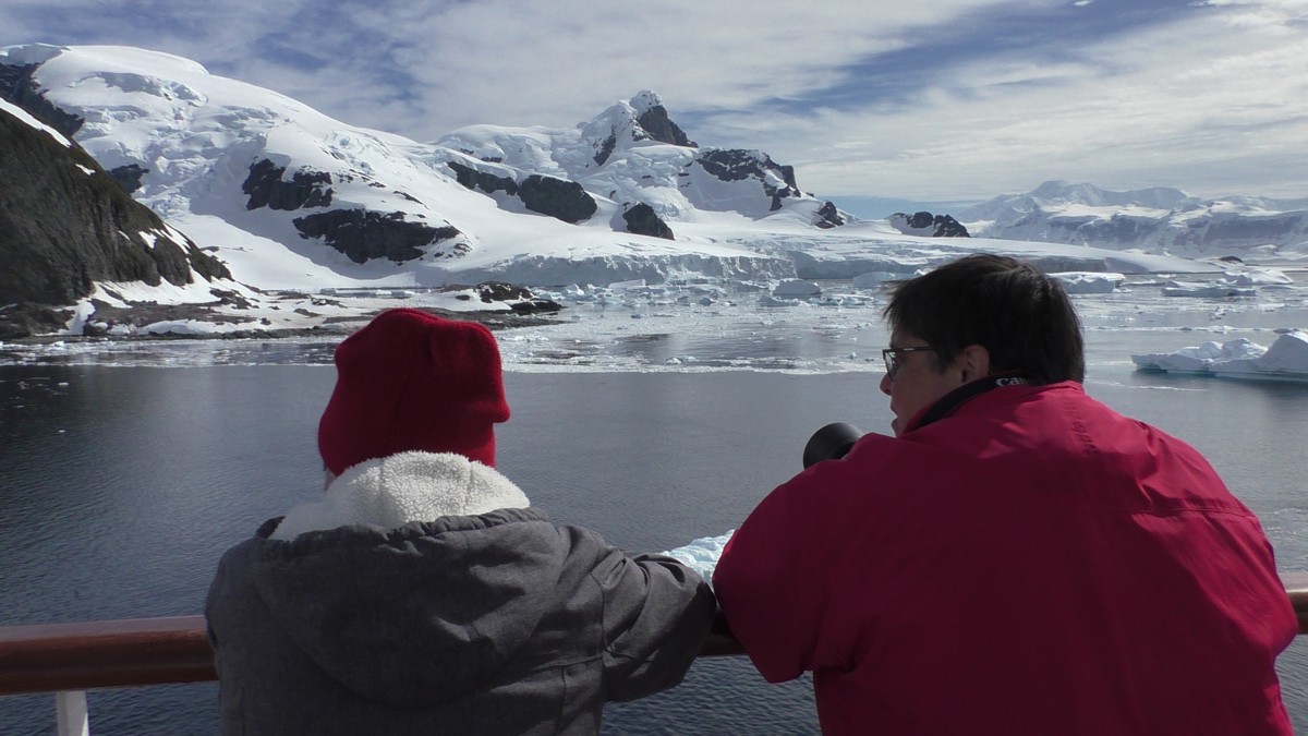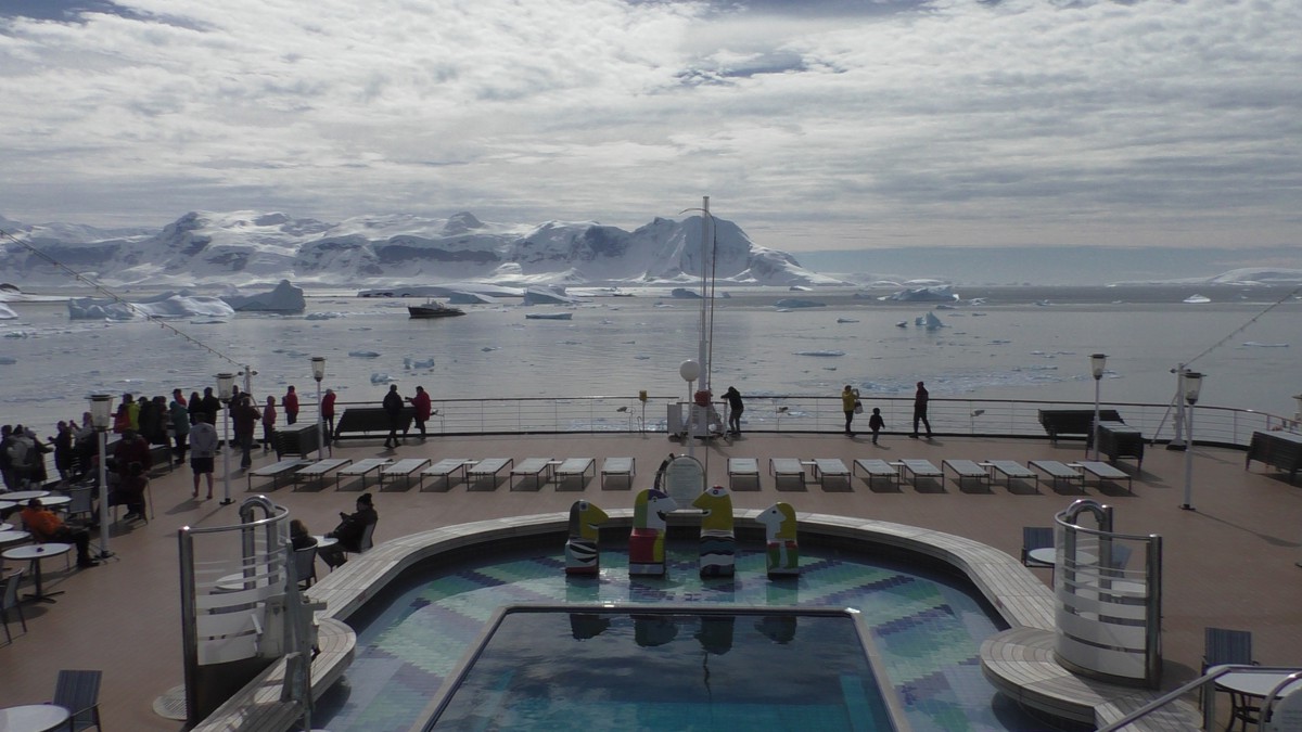 Inmiddels hebben we mekaar weer getroffen op het achterdek bij het zwembad. Ook op dat dek heb je een fantastisch uitzicht over de achterkant van het schip. We nemen, terwijl de kapitein de boot uit de baai draait, een kleine smootie en we schrikken van de tijd, 16.30 uur alweer………dan maar naar de kamer, de blog schrijven, foto’s uitzoeken die we willen posten en o ja… we moeten ook nog gaan eten, wellicht nog naar het Theater en uiteraard nog de RollingStone Lounche. Dat wordt nog een hele opgave nadat we de hele dag buiten in de kou, wind (en zon) hebben gestaan. We gaan het zien.