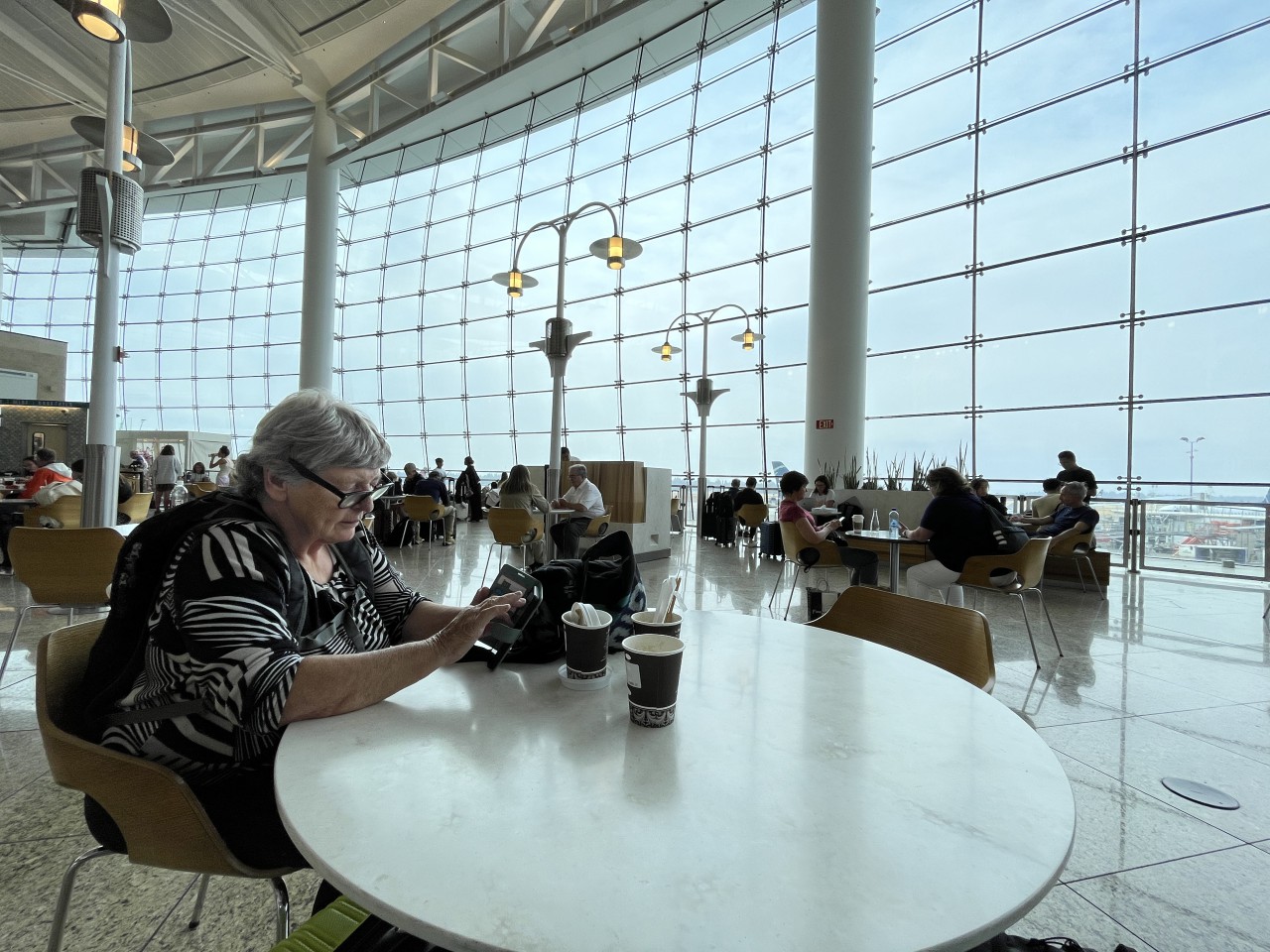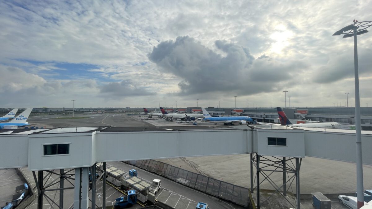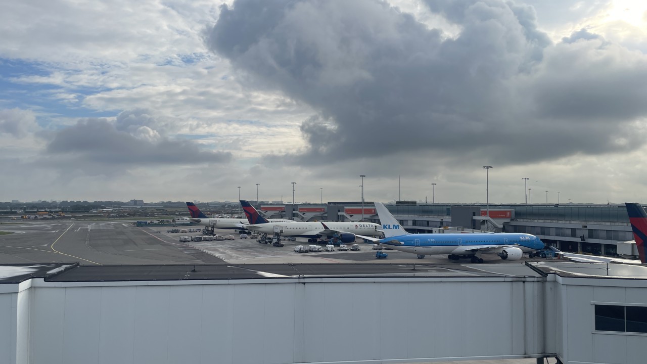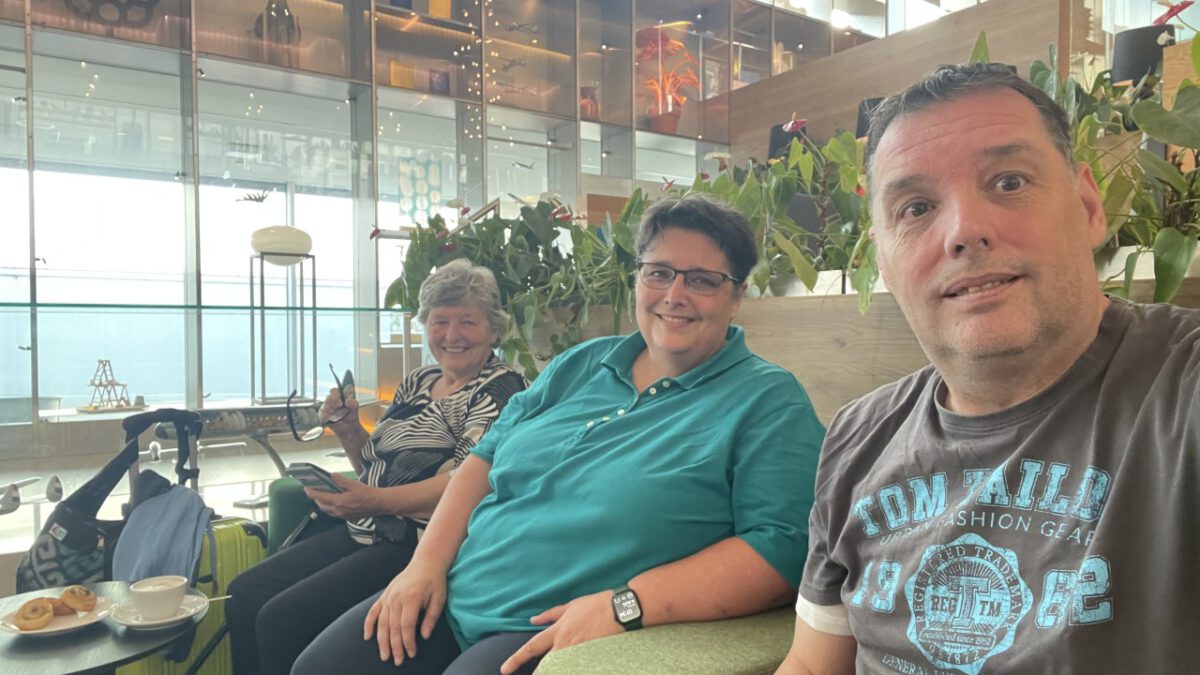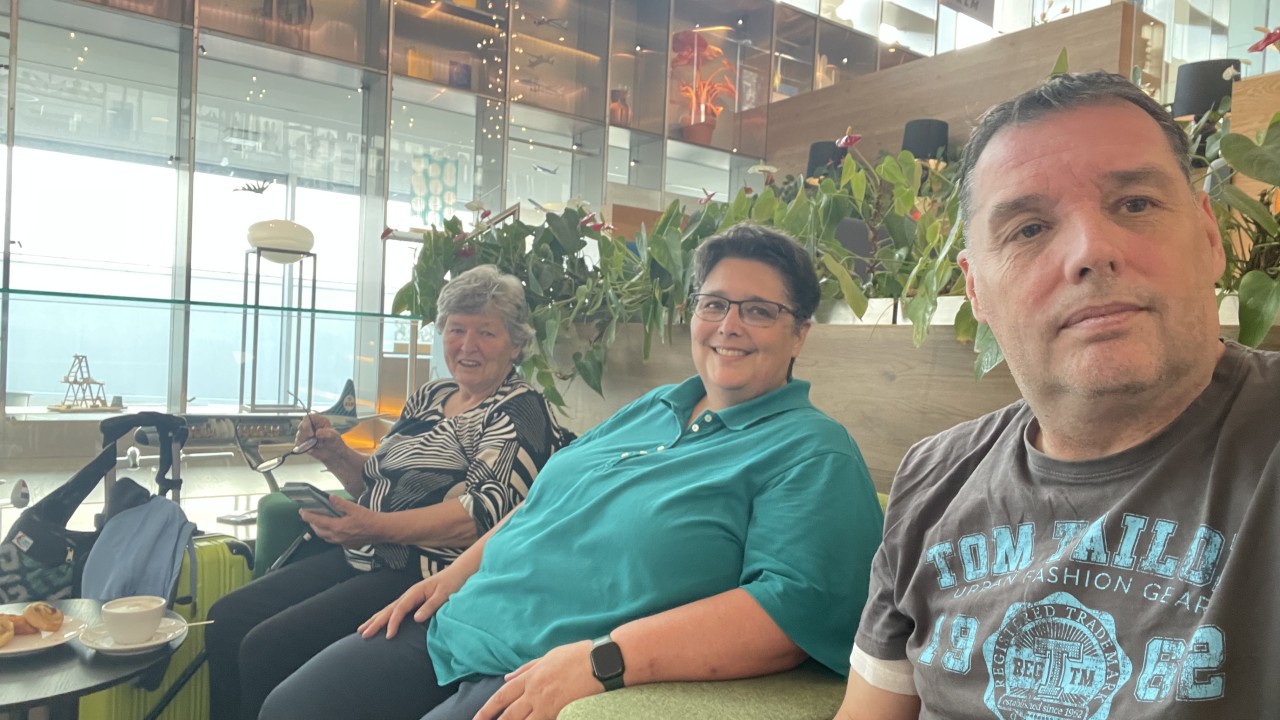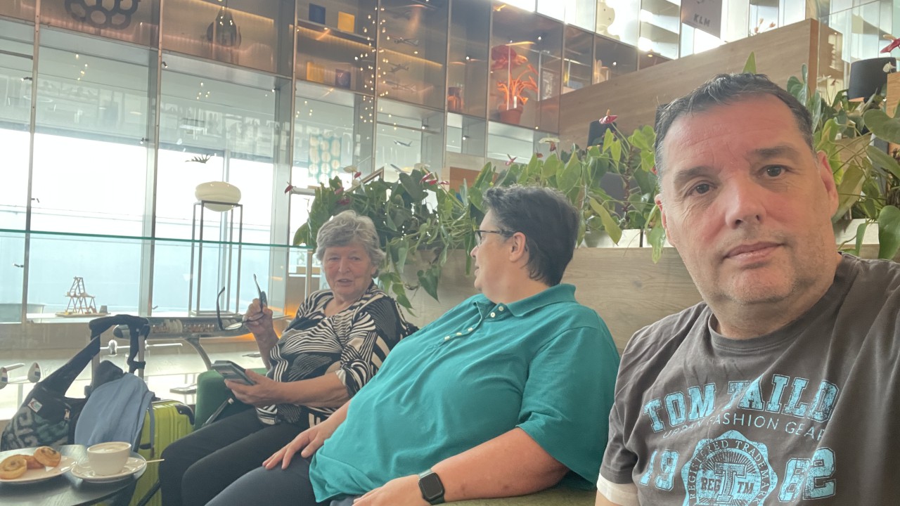 Auto geparkeerd, shuttlebusje in, en met onze SkyPriority konden we snel door het hele circus. Koffers afgeven? Zo gepiept. Security? Vlotjes. KMAR-grenscontrole? Ook geen wachtrijen. En dat terwijl het toch echt vakantieperiode is. Dus: op naar de KLM-lounge! Cappuccino, croissantje, fijne stoelen — zo wachten is eigenlijk best aangenaam.