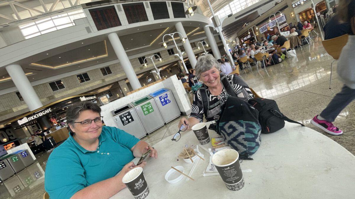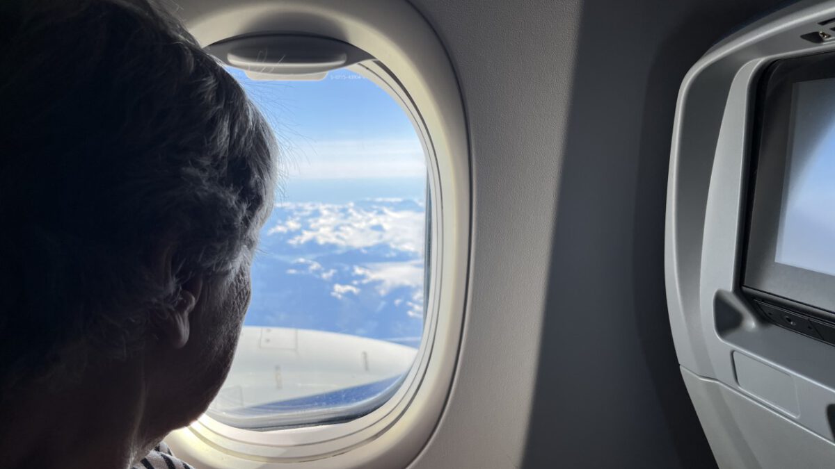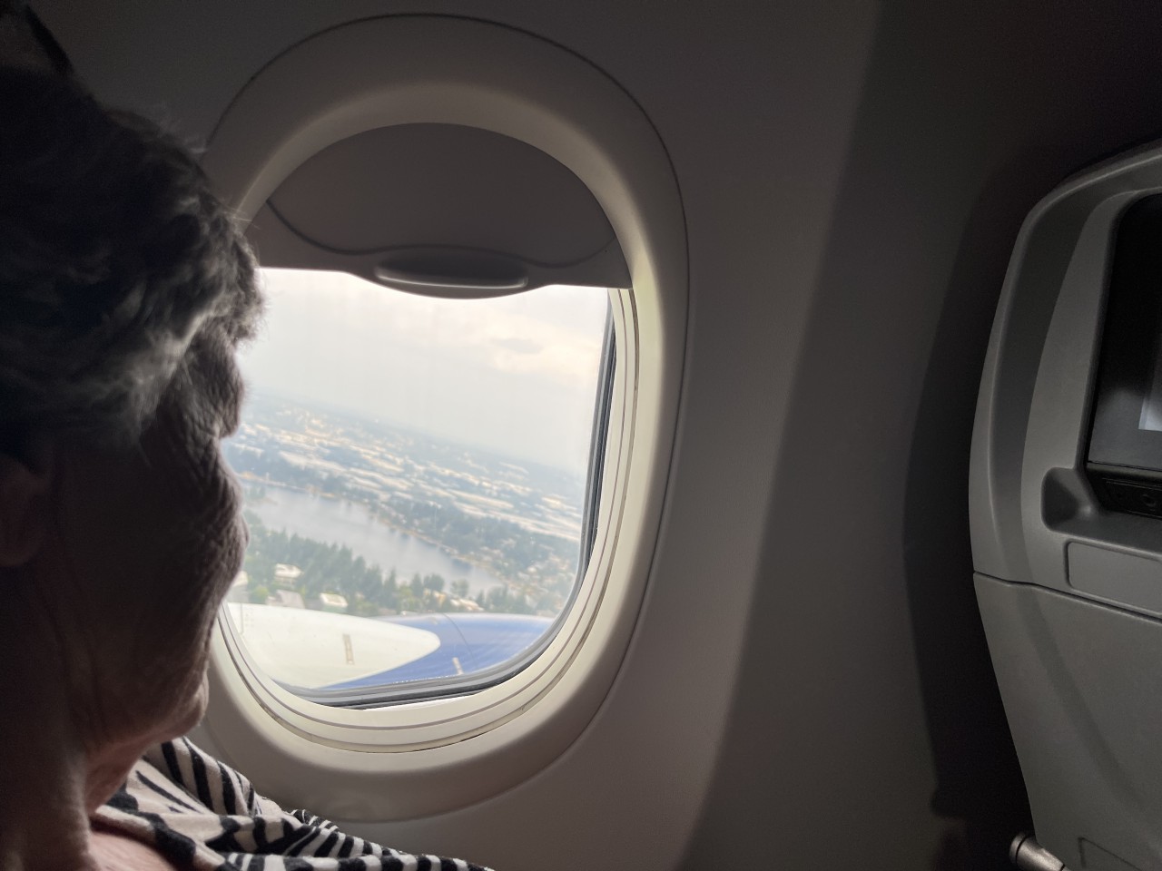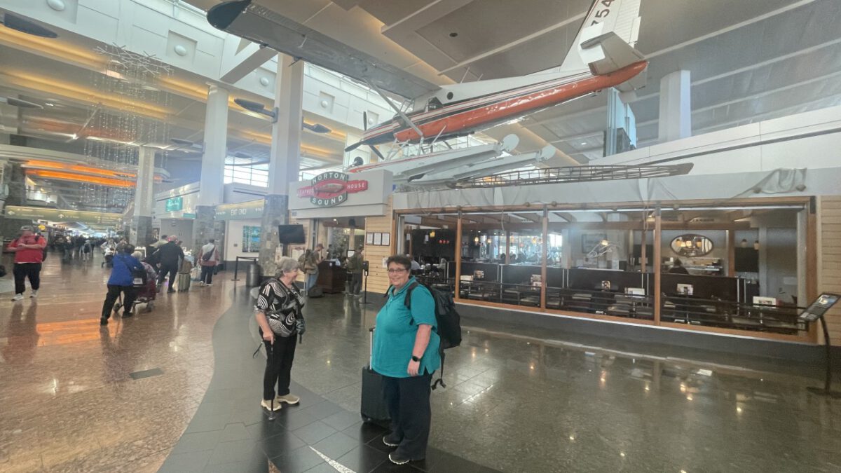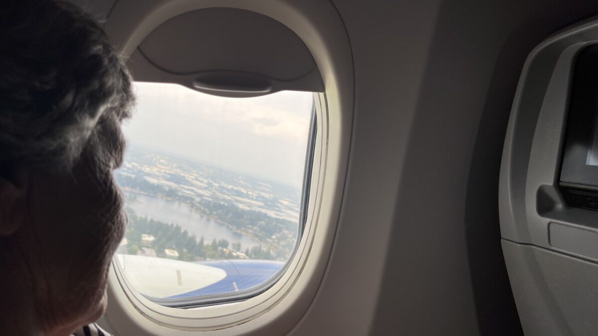 In de centrale hal van Seattle Airport drinken we rustig een kop koffie. Beetje mensen kijken — altijd leuk. En dan door naar de volgende gate, waar het boarden alweer begonnen is. Ook nu zitten we snel in het vliegtuig. Hoewel we voor dit stuk van de reis Premium Comfort geboekt hadden, zitten we toch gewoon in Economy — alle Premium-stoelen waren al volgeboekt bij het reserveren. Maar dat wisten we, dus we waren voorbereid.