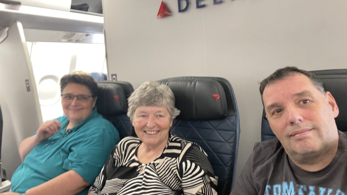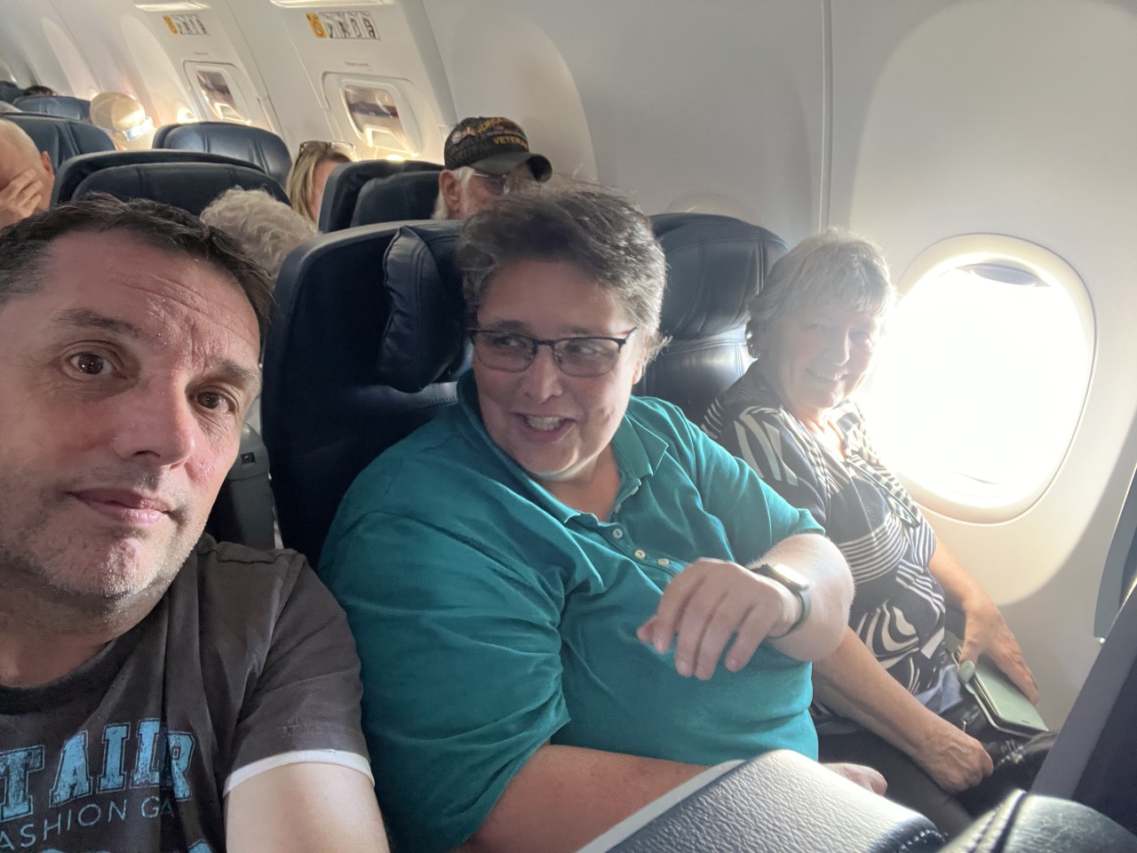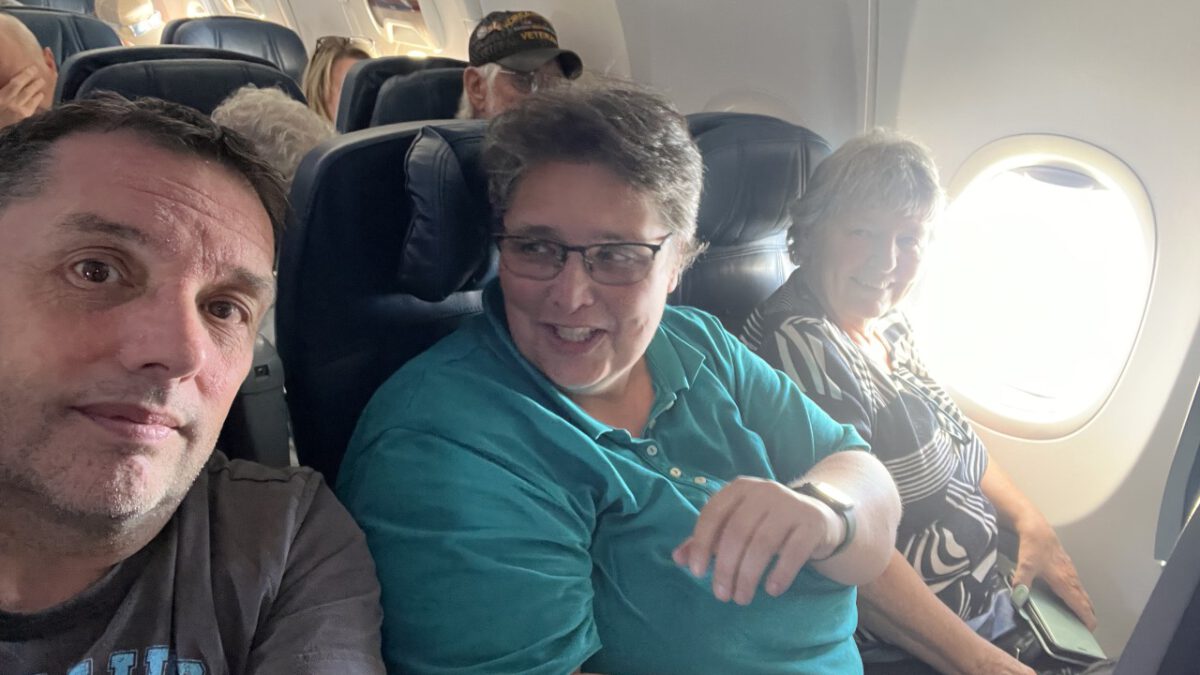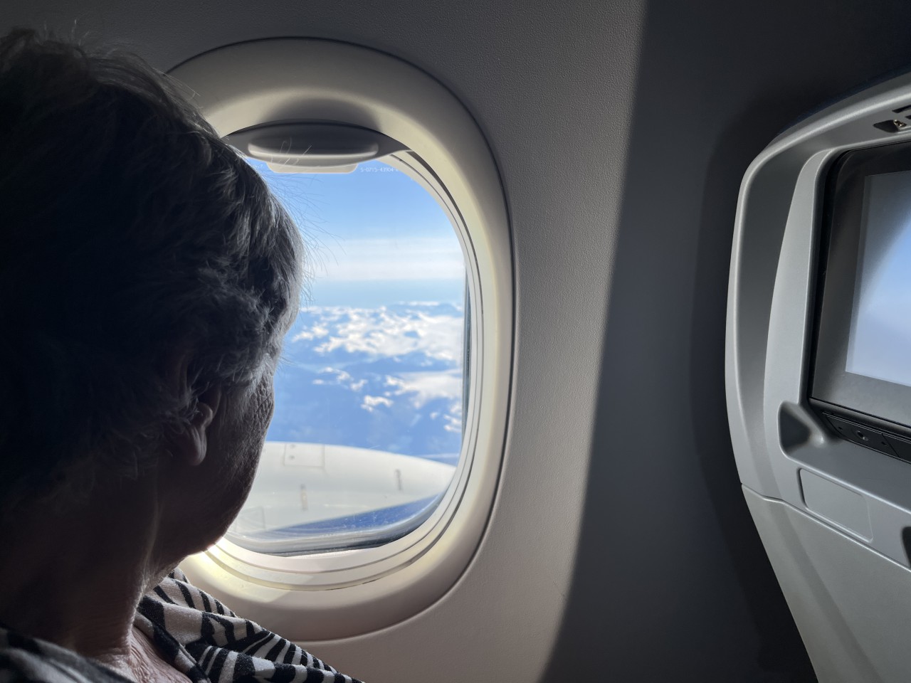 In de centrale hal van Seattle Airport drinken we rustig een kop koffie. Beetje mensen kijken — altijd leuk. En dan door naar de volgende gate, waar het boarden alweer begonnen is. Ook nu zitten we snel in het vliegtuig. Hoewel we voor dit stuk van de reis Premium Comfort geboekt hadden, zitten we toch gewoon in Economy — alle Premium-stoelen waren al volgeboekt bij het reserveren. Maar dat wisten we, dus we waren voorbereid.