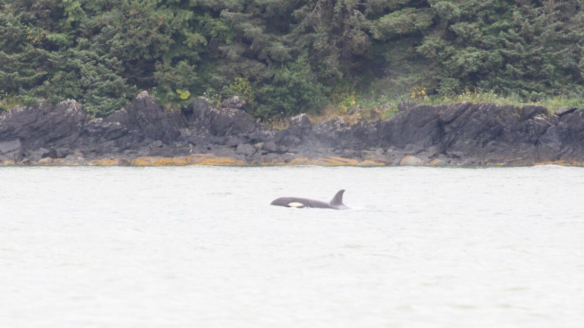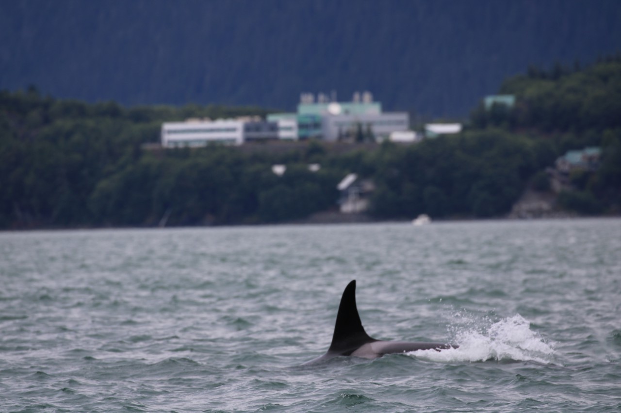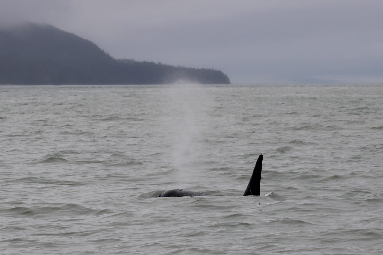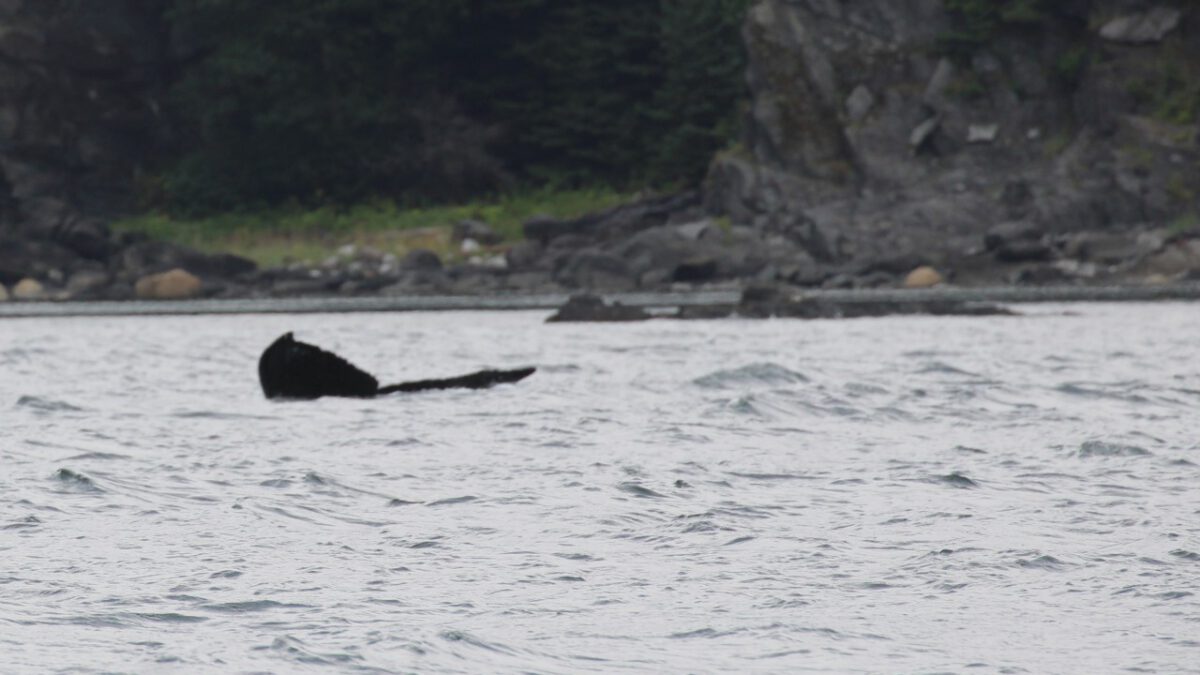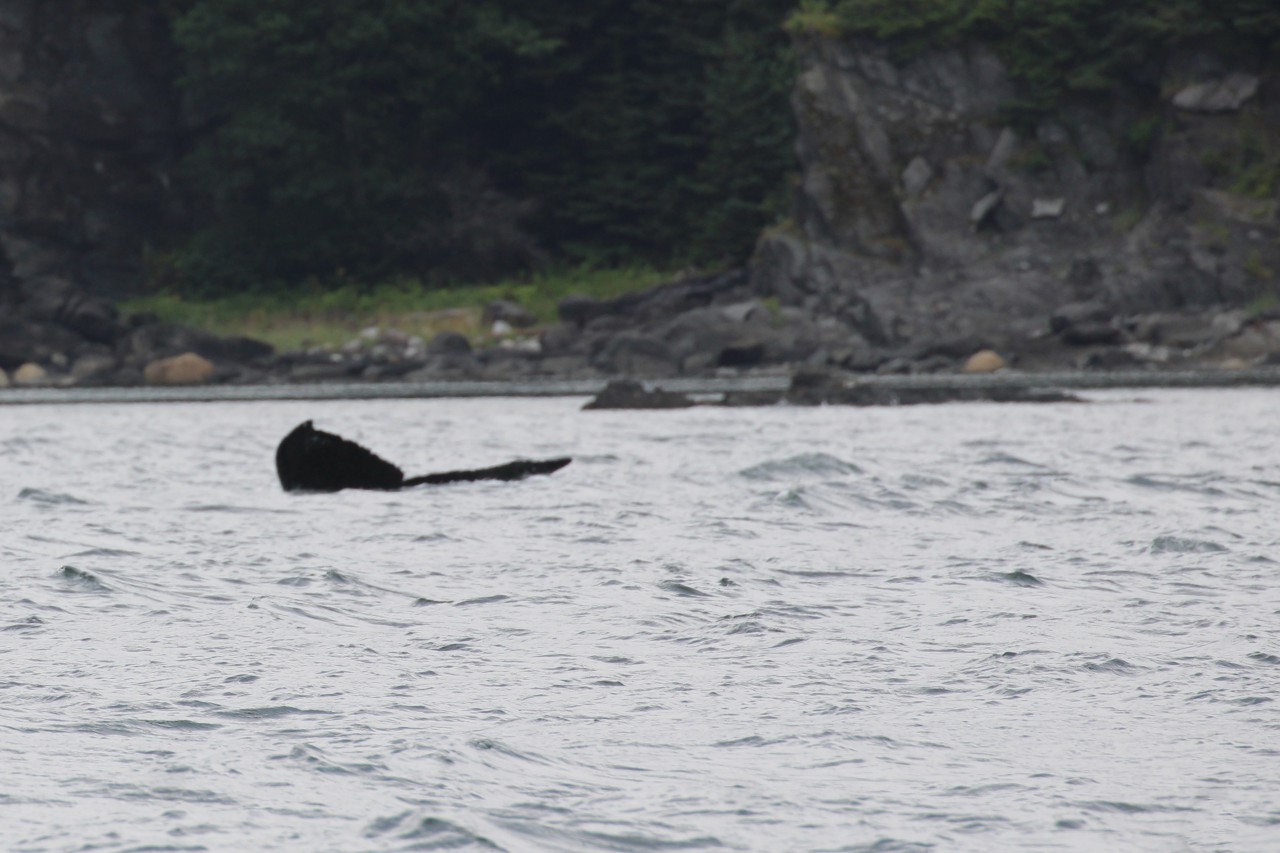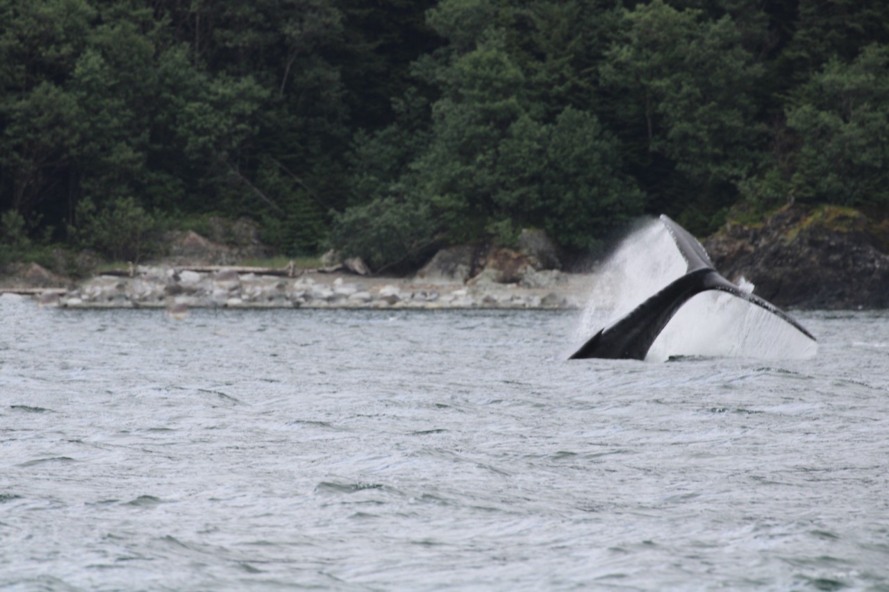We varen verder, nu op zoek naar de bultrugwalvis. Nog geen paar minuten later zien we er één zwemmen. Ze slaat driftig met haar vin op het water en zwemt daarna rustig verder. We identificeren haar als Juneauite, een erg sociale walvis die al vele jaren in deze omgeving leeft en regelmatig wordt gezien. Ze zal het hier wel naar haar zin hebben.