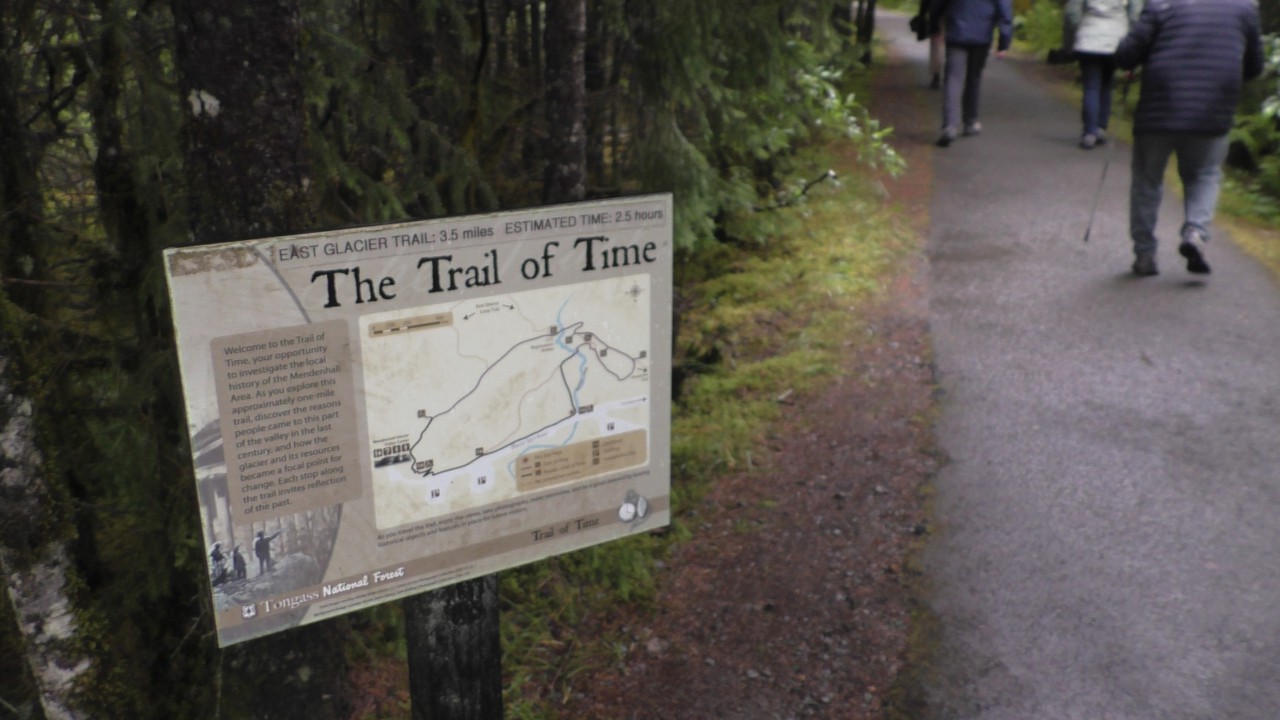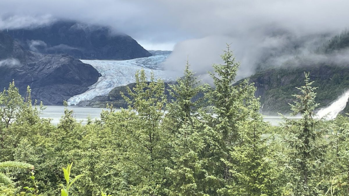 We bedanken de kapitein voor de tour en stappen weer in het busje. De volgende stop is de Mendenhall Glacier. Zodra we de parkeerplaats oprijden, zegt Bertie: “Hé, dit komt me bekend voor!” En inderdaad: in 2019 waren we hier ook, tijdens onze Alaska-tour. Toen deden we een wandelhike met als eindpunt Mendenhall Glacier. Vandaag lopen we een klein stukje van datzelfde pad, maar het eindpunt is hetzelfde.