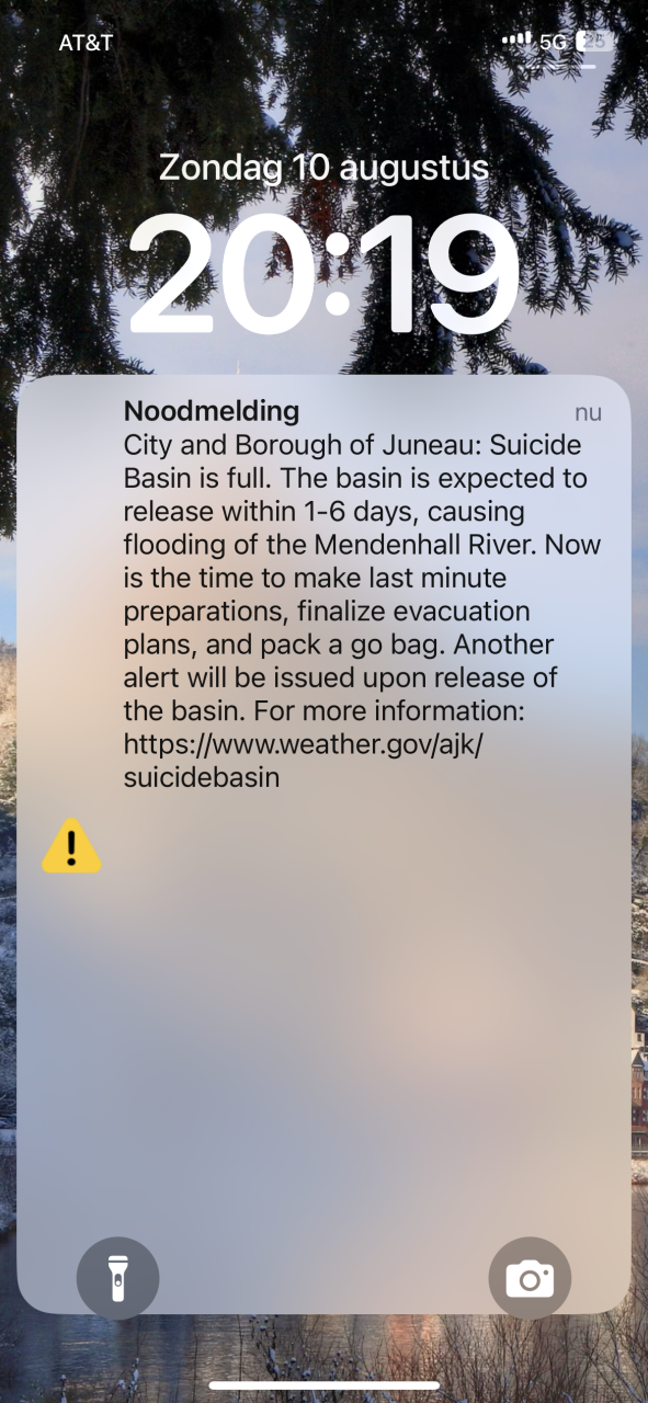 Dan opeens: Piep, piep, piep. Hé, dat is toch het geluid van NL-Alert? Ik kijk op mijn telefoon en jawel: een Broadcast Warning. Het bassin van de gletsjer is overvol en kan in een bepaald gebied voor overstromingen zorgen. De bewoners daar moeten zich voorbereiden op evacuatie. Nou, dat hebben we ook weer eens meegemaakt. Overigens liggen de binnenstad van Juneau en de cruisehaven niet in het overstromingsgebied; dat bevindt zich meer naar het westen.