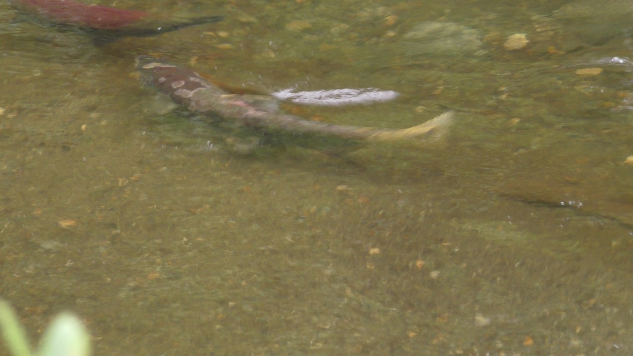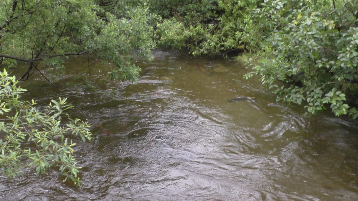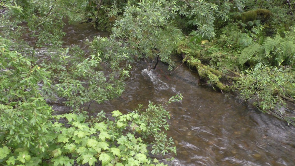 Langs een riviertje zien we duidelijk zalmen zwemmen die terugkeren naar hun geboorteplek. Er liggen ook wat dode exemplaren op de oever, half vergaan, dus het stinkt er behoorlijk naar rotte vis… maar dat hoort hier bij de natuur. Even verder komen we op een bordes. ” he was dit niet dat bordes waar Bertie in 2019 die 3 beren in de boom zag…….ja dat klopt, en de bomen staan er nog. Beren hebben we helaas niet gezien.