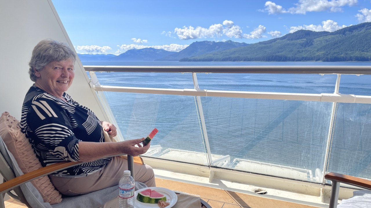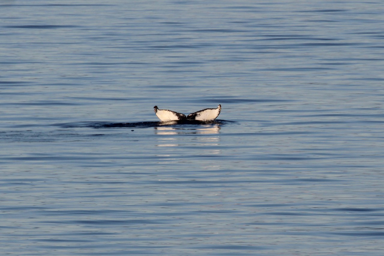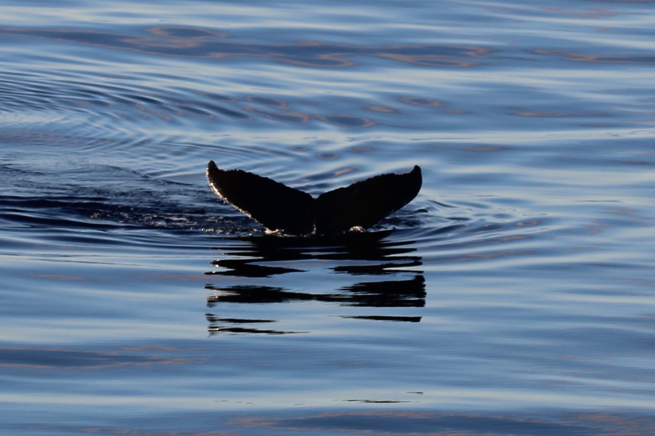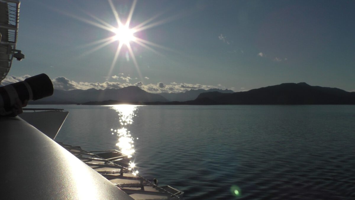 Zes uur varen verder zitten wij nog steeds op ons balkon, in het zonnetje, speurend naar de spray van walvissen. En laten we zeggen: ik ben gestopt met tellen hoeveel we er hebben gezien. Het waren er tientallen. Tussendoor hebben we gewoon ons diner gehad – even geen uitzicht – maar dat werd ruimschoots goedgemaakt.