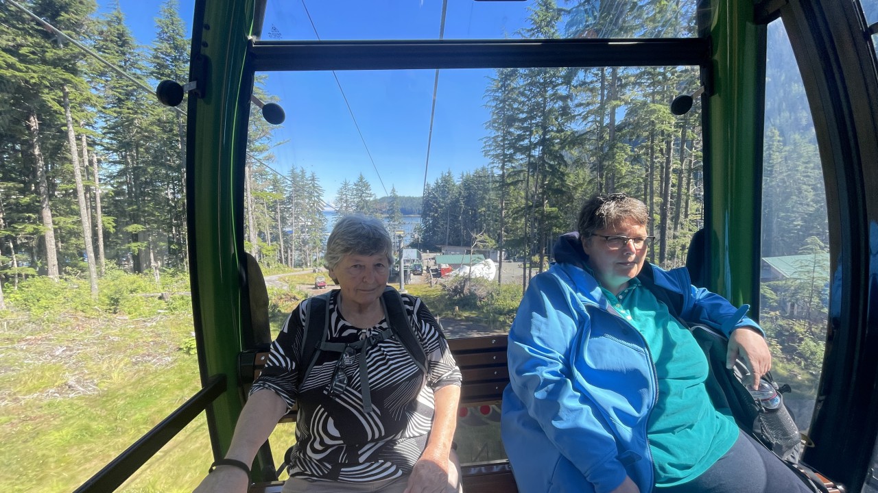 Met het busje worden we weer teruggebracht naar het Visitor Center. We hebben nog wat tijd voor vertrek, dus we nemen de kabelbaan naar de andere cruisesteiger. Daar zien we nog een cruiseschip binnenkomen. We besluiten de kabelbaan terug te nemen vóórdat dat schip wordt “gelost”, om zo de rijen te vermijden.