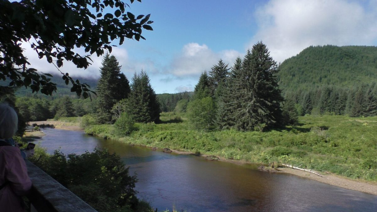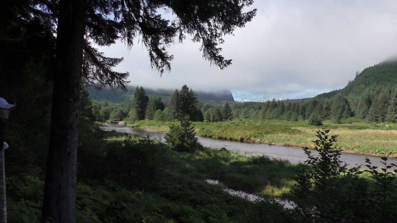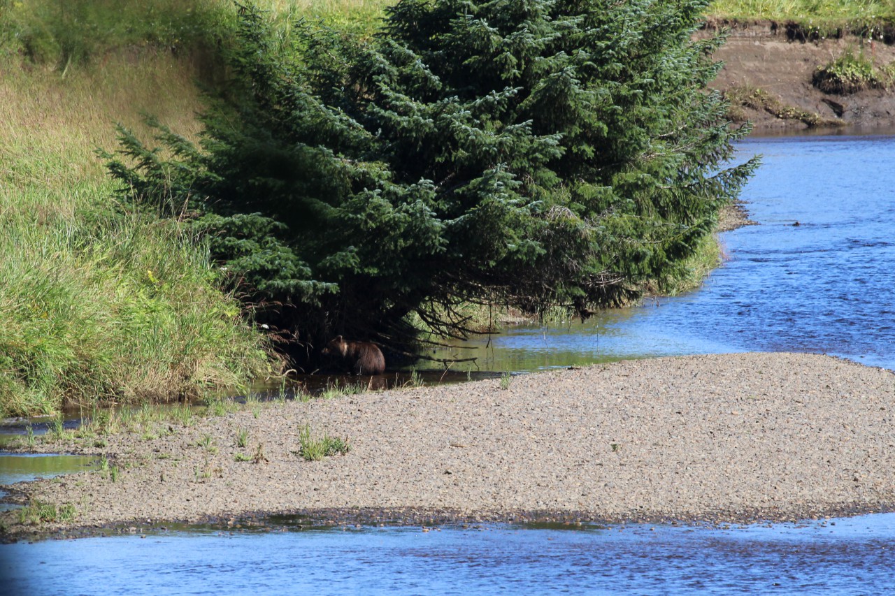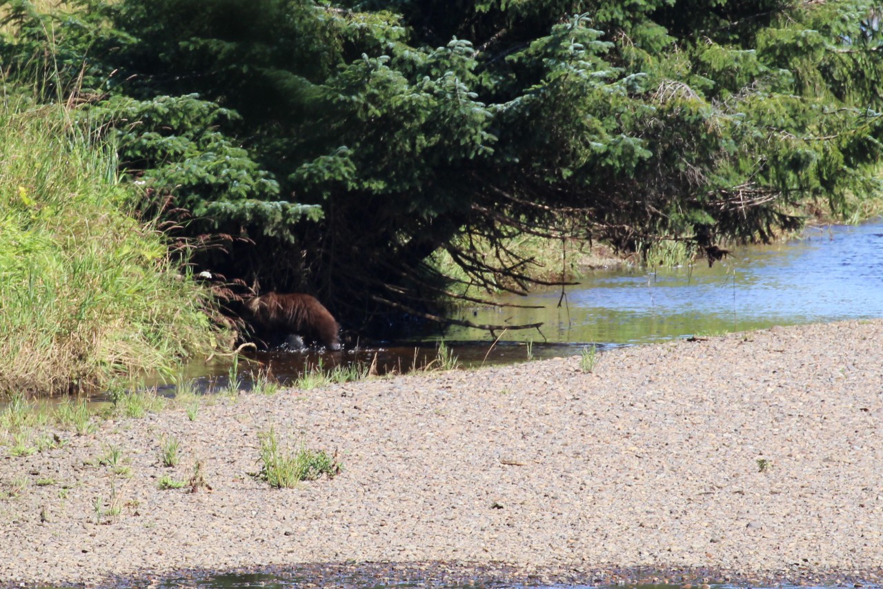 Op onze “parkeerplaats” – een inham langs de weg – stappen we uit. Inmiddels is het flink opgeklaard en kan er zelfs een trui uit. We hiken (dat heet bij ons gewoon wandelen) een trail (lees: pad) op en komen uit bij een houten vlonder die uitkijkt over de Spasski River. Het zit hier vol zalm, en er lopen vaak beren rond. Icy Strait Point heeft naar verluidt de hoogste berendichtheid per km²: zo’n twee beren op één inwoner. De kans dat we er vandaag eentje zouden spotten, leek dus groot.