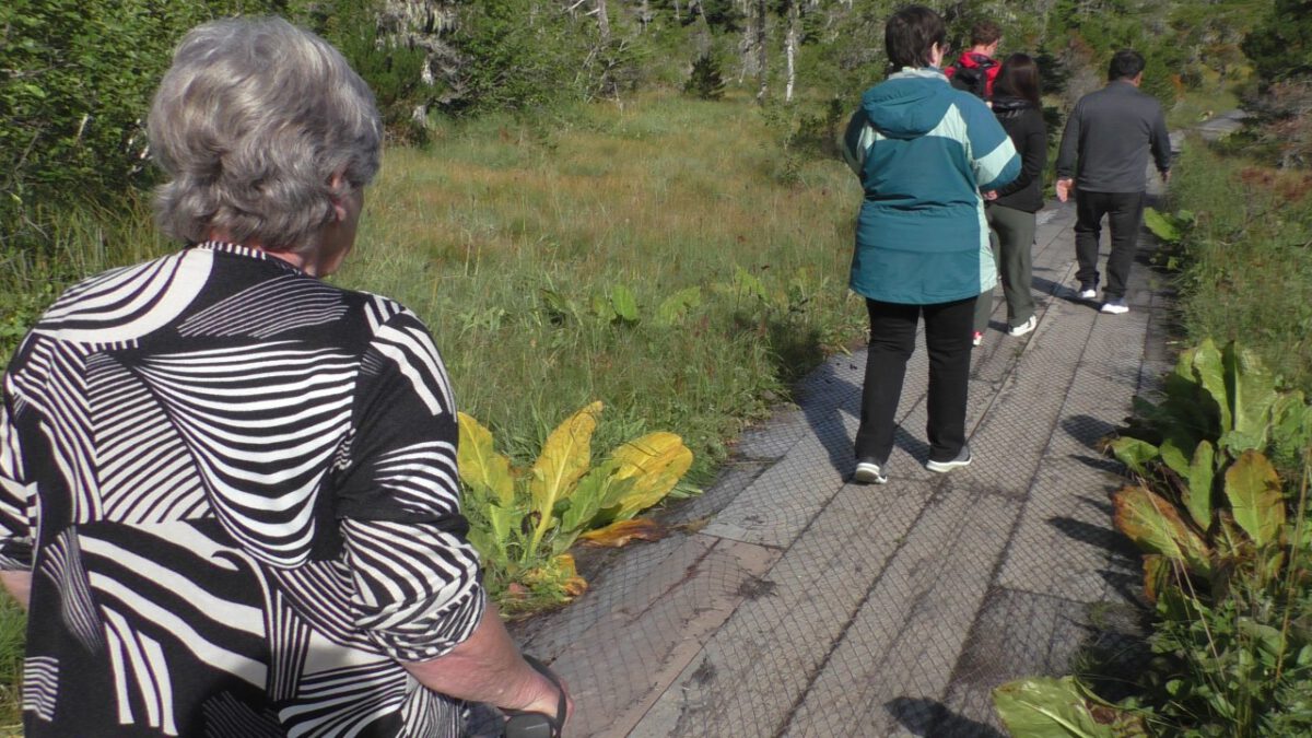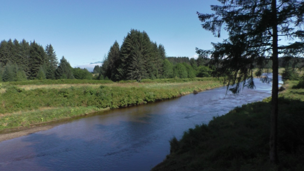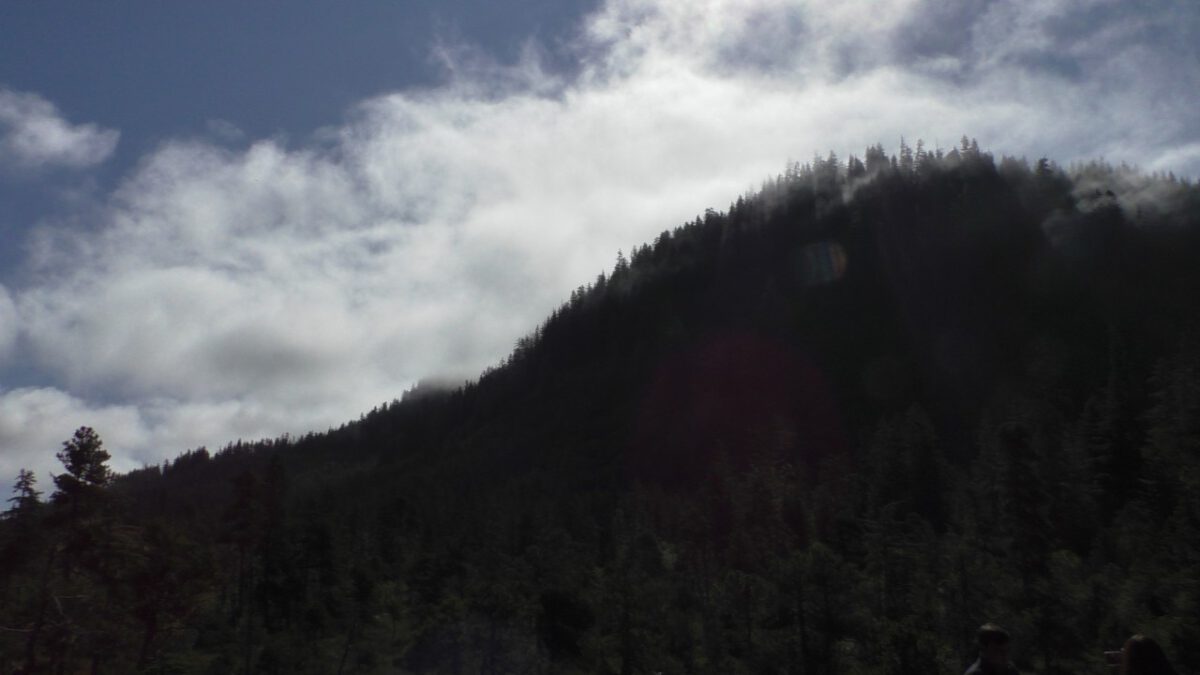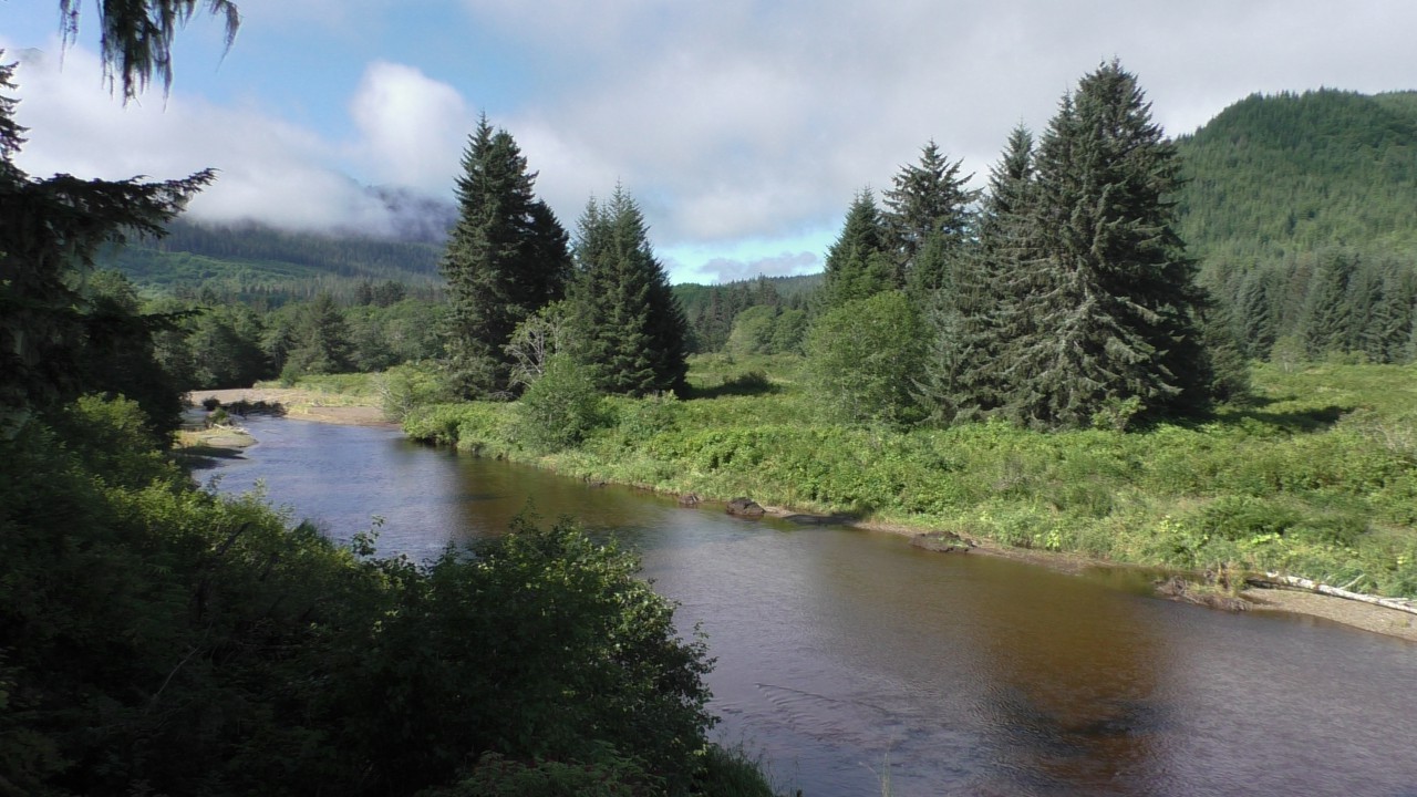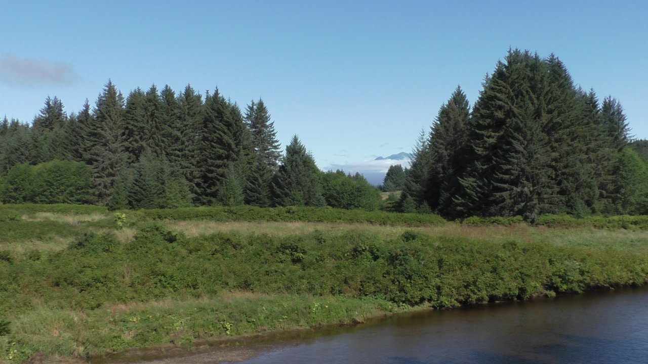 Op onze “parkeerplaats” – een inham langs de weg – stappen we uit. Inmiddels is het flink opgeklaard en kan er zelfs een trui uit. We hiken (dat heet bij ons gewoon wandelen) een trail (lees: pad) op en komen uit bij een houten vlonder die uitkijkt over de Spasski River. Het zit hier vol zalm, en er lopen vaak beren rond. Icy Strait Point heeft naar verluidt de hoogste berendichtheid per km²: zo’n twee beren op één inwoner. De kans dat we er vandaag eentje zouden spotten, leek dus groot.