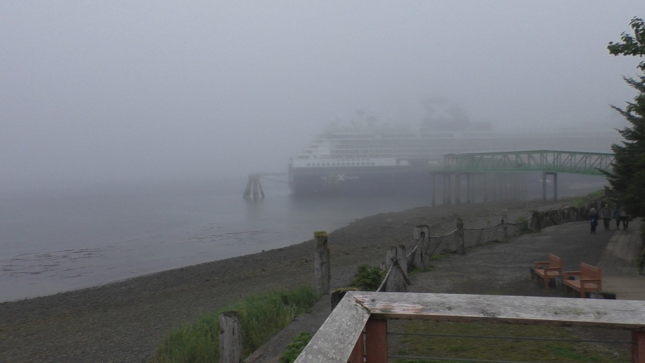 We hebben de wekker gezet, want onze excursie startte vandaag wat vroeger dan de afgelopen dagen. Eerst even naar buiten kijken: de kapitein had gisteren verteld dat we al vroeg in de ochtend zouden aanmeren. Maar wat zien wij? Helemaal… niets. Het is mistig. En niet een beetje mist, maar zó dik dat je amper de reling van het balkon ziet. Benieuwd of dat nog goed gaat komen. Ze hadden tenslotte een zonnige dag voorspeld, maar ja – het weer hier lijkt verdacht veel op de voorspellingen in Nederland: soms klopt het, soms totaal niet.