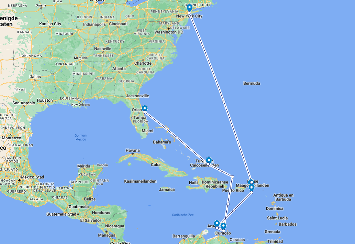 Wat gaan we dan precies doen. We vliegen met KLM van Amsterdam naar New York en verblijven daar 3 dagen, daarna stappen we in Manhattan op de Carnival Venezia. Met deze cruiseboot varen we dan naar het Caribisch gebied en doen daar de volgende eilanden aan: