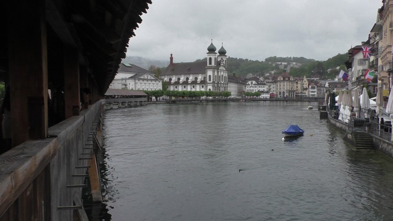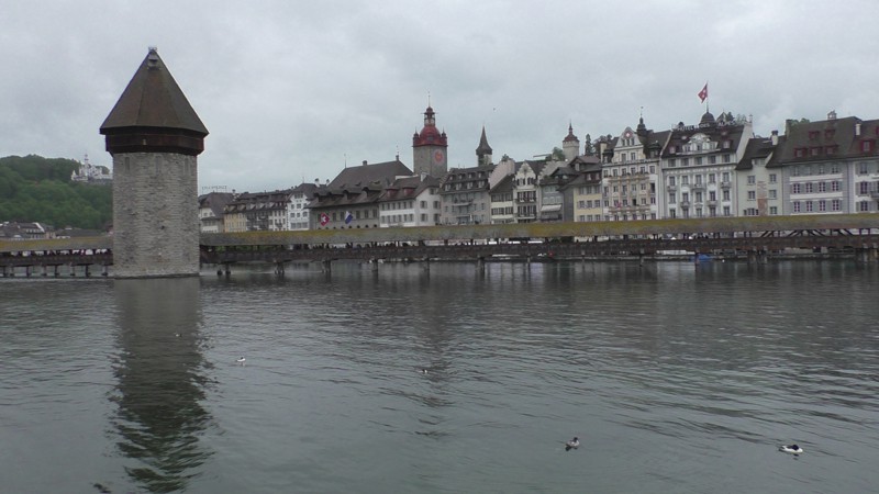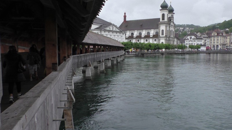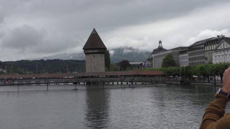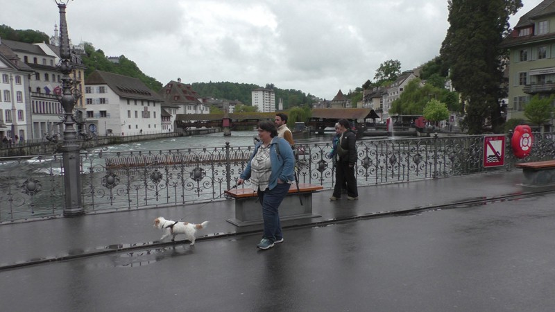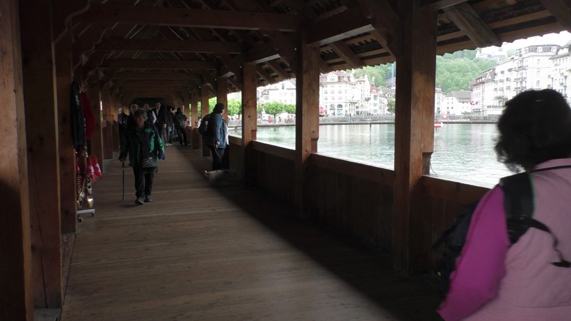 Na 2 uur en 9 minuten met de trein, ja hier rijden in Zwitserland de treinen op tijd, zelfs nu het wat slechter weer was, komen we aan in Luzern. Het lijkt zelfs droog te worden dus we hebben we geluk. We drinken een Koffie en Cappuccino aan het water en lopen dan naar de oh zo beroemde brug de Kapelbrücke. Het is een houten overdekte brug uit 1365 met een lengte van 204,7 meter. De brug is meer dan 650 jaar oud, maar het grootste deel van de brug is vernieuwd nadat een brand op 18 augustus 1993 de brug, op de watertoren (Wasserturm) en de beide brughoofden na, had vernietigd. Deze brug en een andere brug uit Luzern zijn de oudste overdekte bruggen van de wereld. Zo nu genoeg geschiedenis…………..