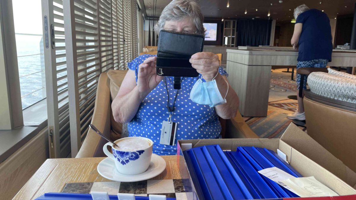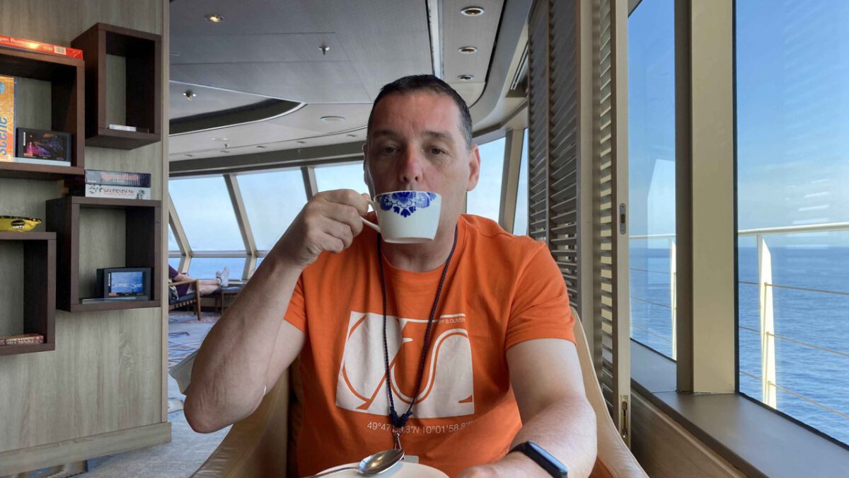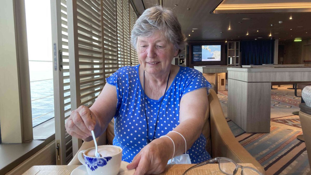 Op ons gemak ontbeten op het achterdek, daarna een goede bak koffie in het Crowns Nest (daar waar die koffiebar is). Voor de lunch nog wezen sporten en vanmiddag heerlijk met een goed boek op ons eigen balkon. Even een schaaltje fruit halen en zo komen we dag wel door.