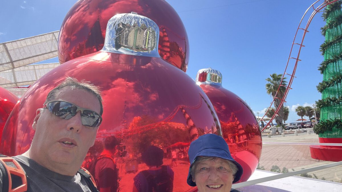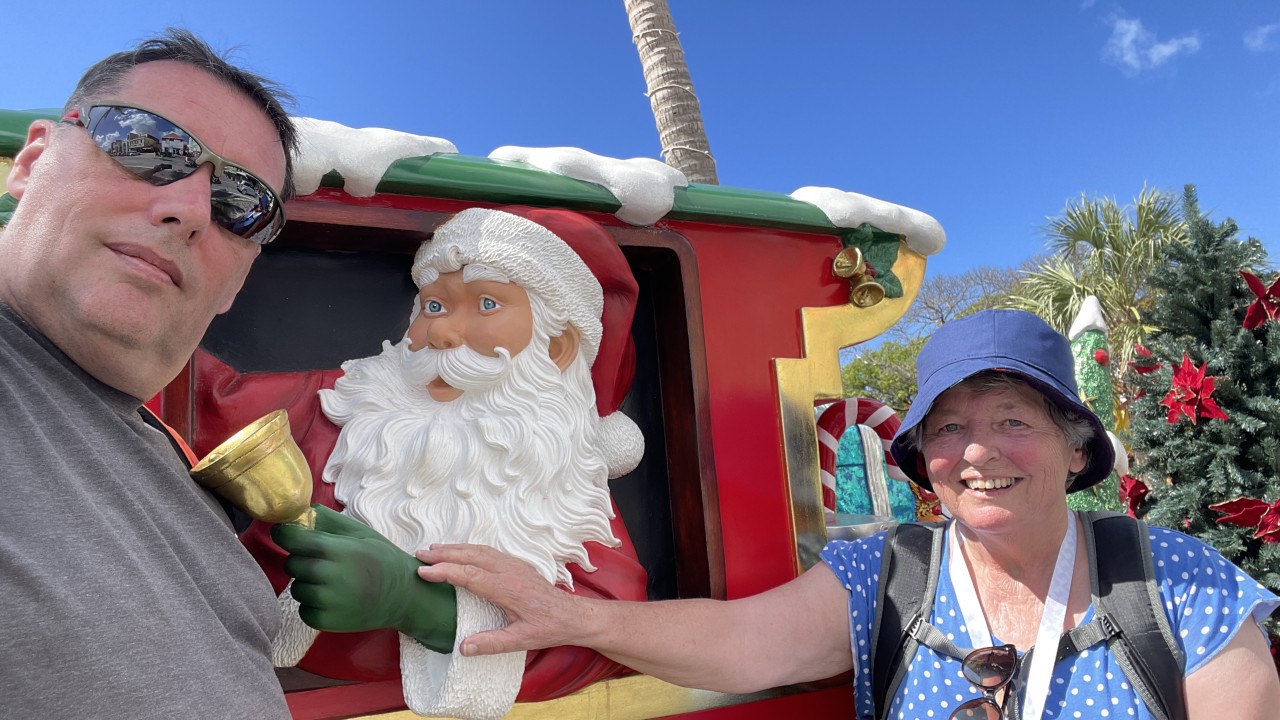We lopen verder door de (winkel) straat en deze is al helemaal in kerstsfeer. Vreemd het is warm (erg warm zelfs) en overal hangt kerstversiering, staat er een grote kerstboom etc. Ons brein zegt ons dat er iets niet klopt………