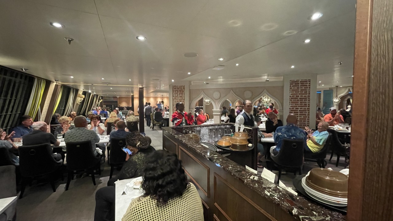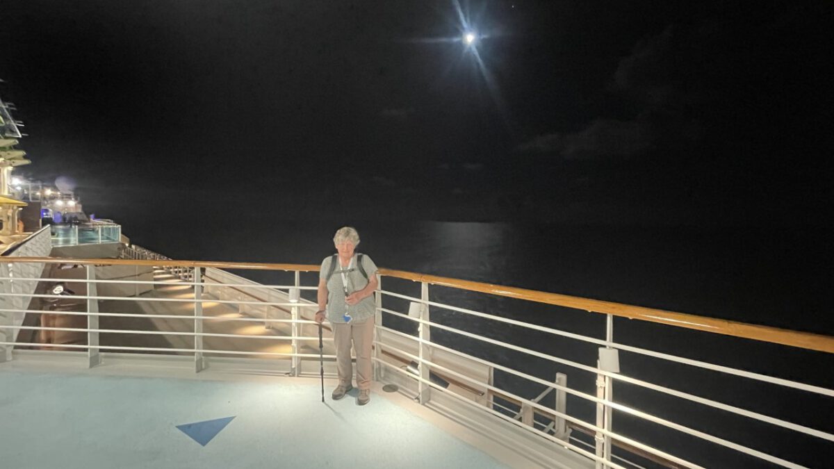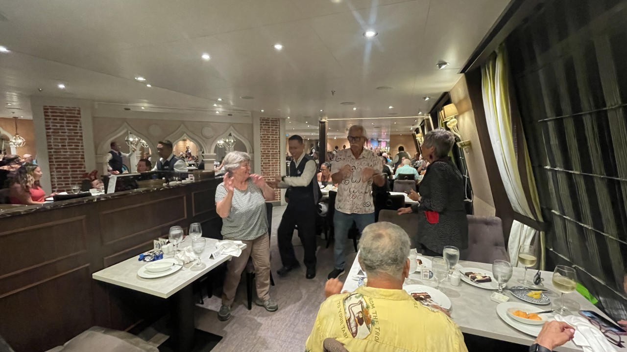 ‘s Avonds in het restaurant was het nog even showtime voor de bediening en het halve restaurant ging uit z’n dak. Na het eten een heerlijk wandeling gemaakt over het dek, nu de zon weg is en er een windje staat is het echt aangenaam. Het is volle maan en dat geeft ook weer een aparte dimensie aan het wateroppervlak.